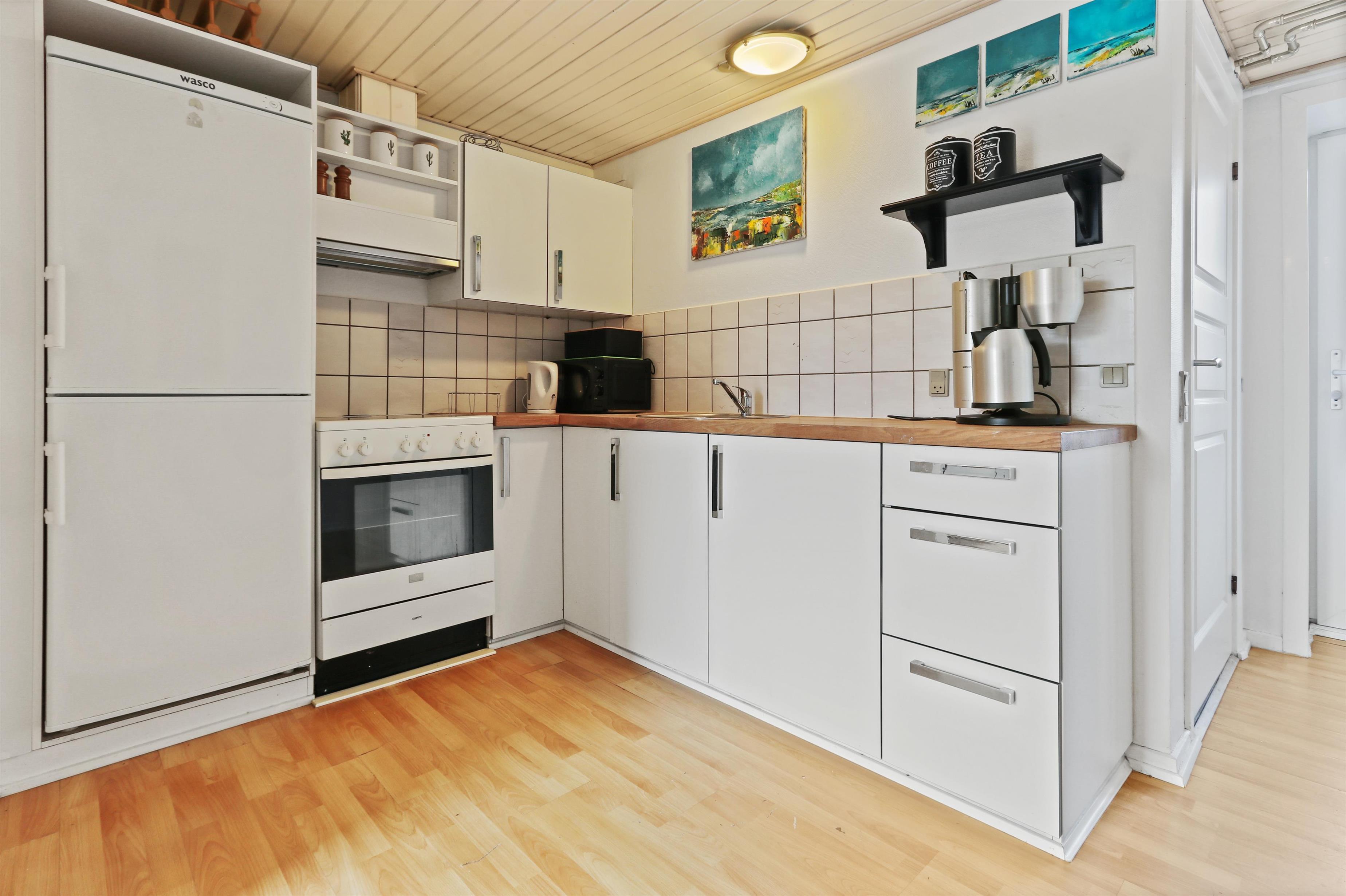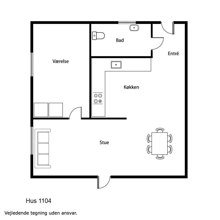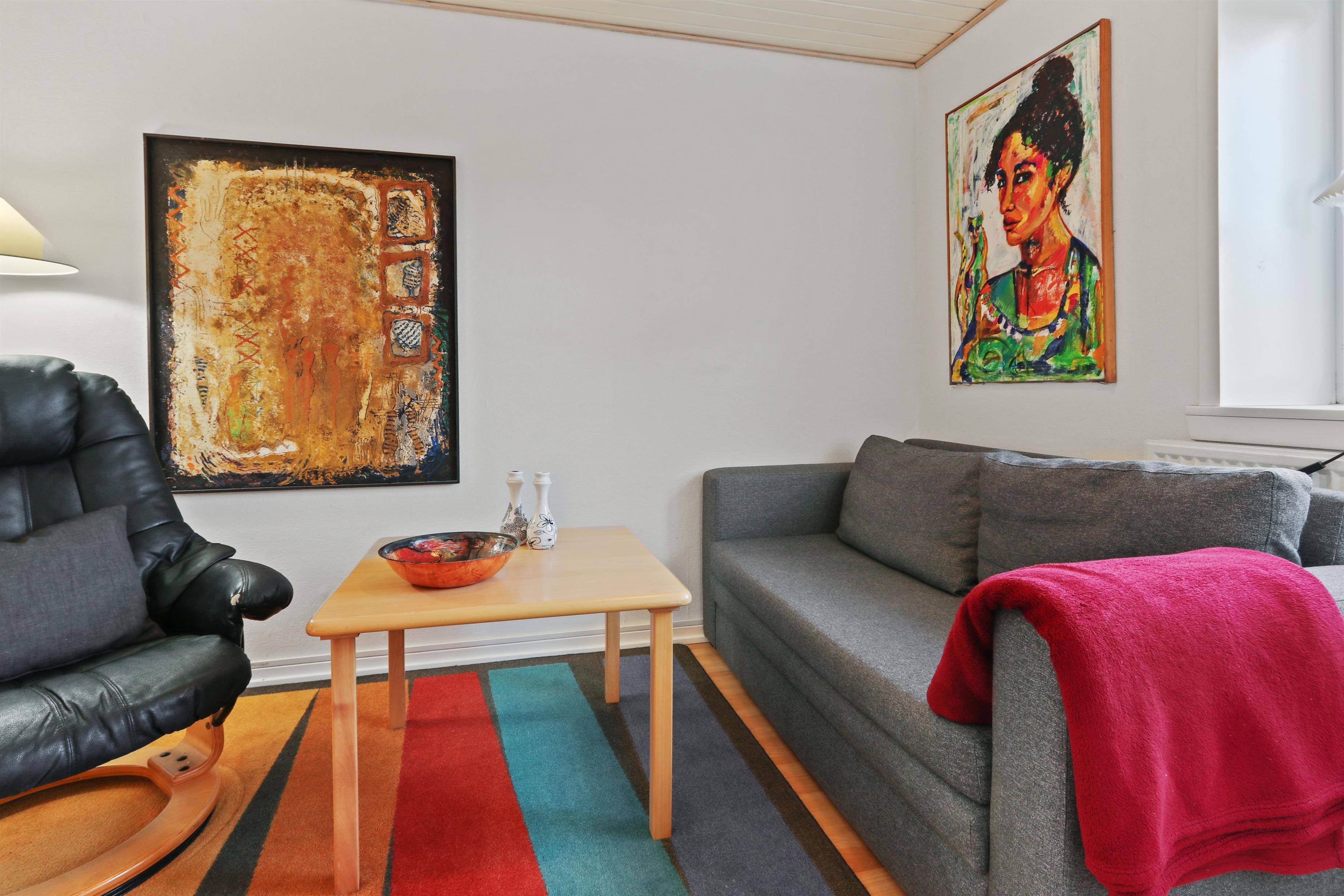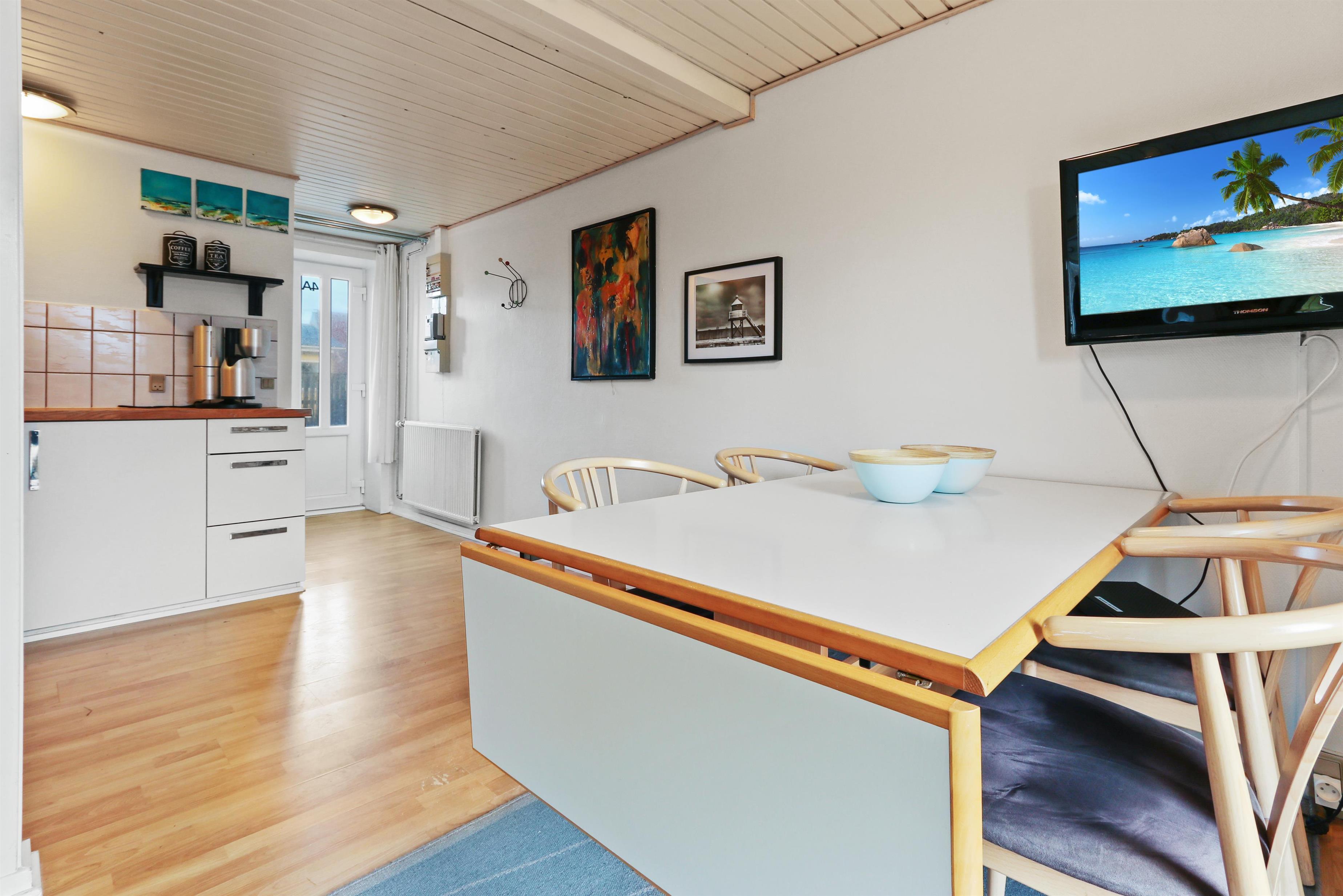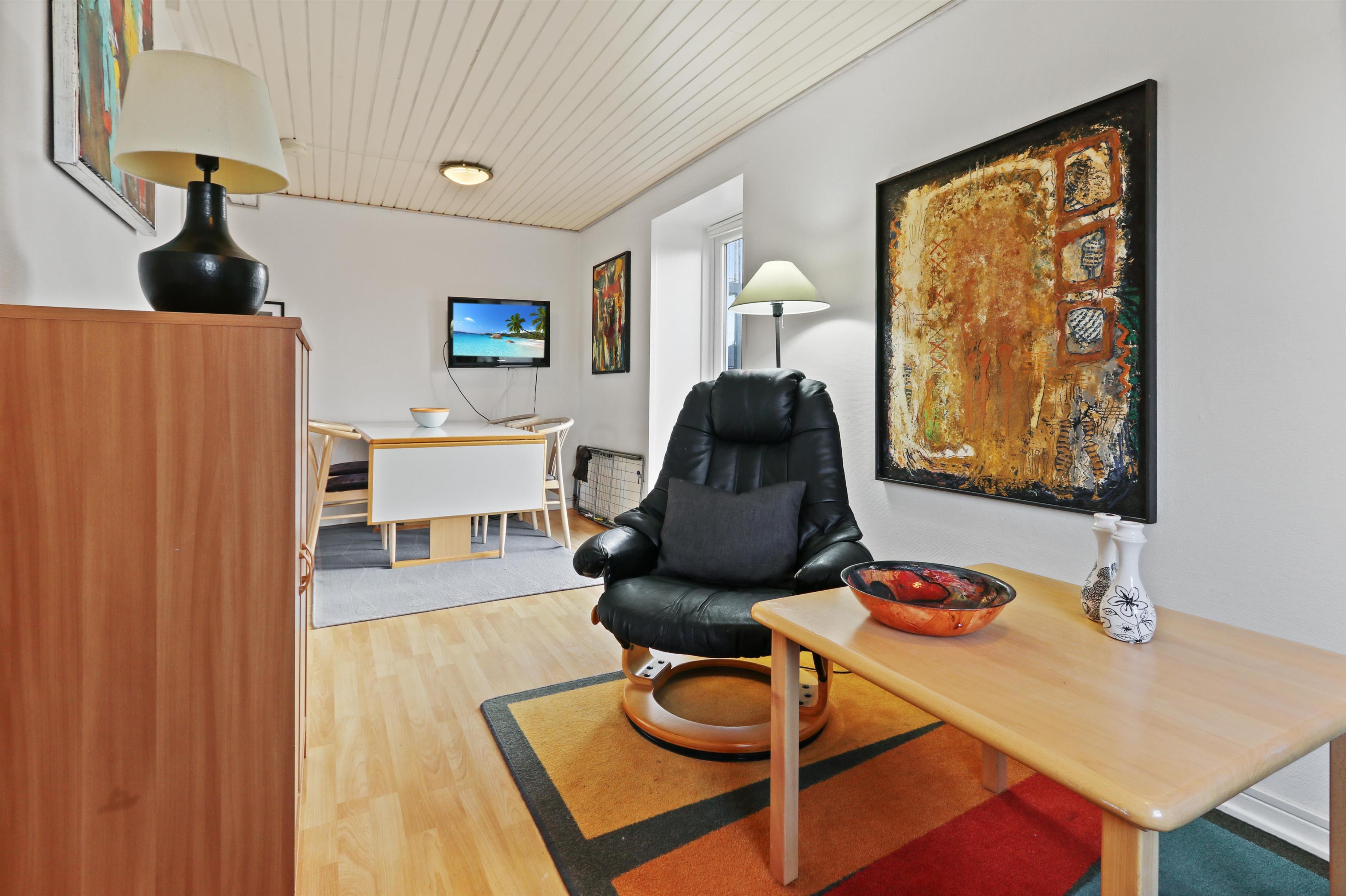 Etwa 40 m² grosse Wohnung im Erdgeschoss. Eingang durch einen kleinen Flur zu einem kombinierten Wohnraum und Küchenecke. Wohnraum mit Doppel-Schlafcouch, TV mit dänischen und deutschen Programmen, CD/Radio und Esstisch. Küchenecke mit Herd mit Cerankochfeld, Abzugshaube, Mikrowelle und Kühlschrank mit kleinem Gefrierfach. 1 Schlafraum mit 1DB. Badezimmer mit Toilette, Waschbecken und Duschmöglichkeit. Nichtraucher- Wohnung. Max. 2 Haustiere erlaubt.