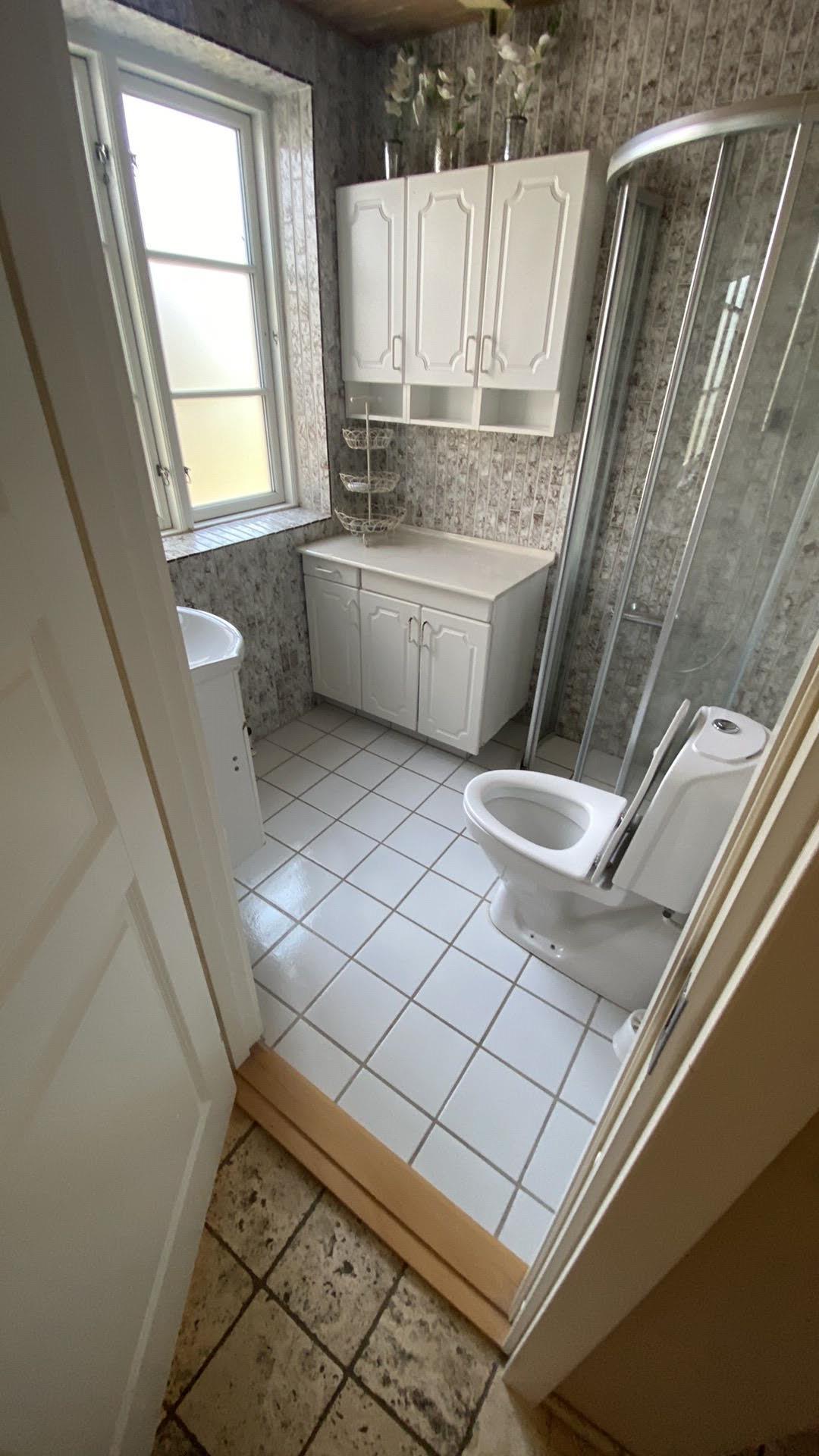 Es gibt ein Badezimmer mit einem Badbereich, einer Dusche und einem WC sowie ein Gästebad ebenfalls mit Dusche und WC. Im Hauswirtschaftsraum befinden sich eine Waschmaschine und ein Trockner.