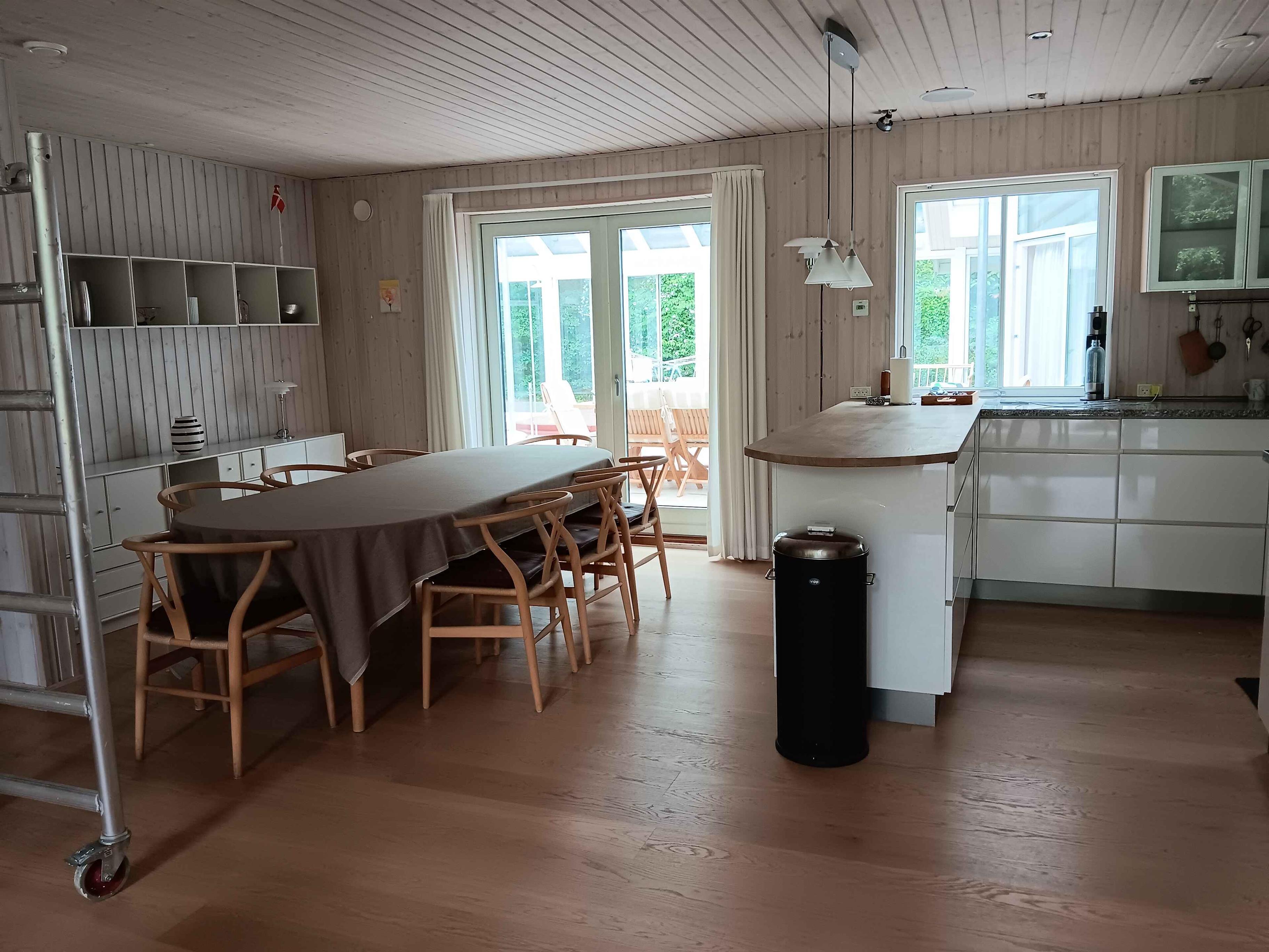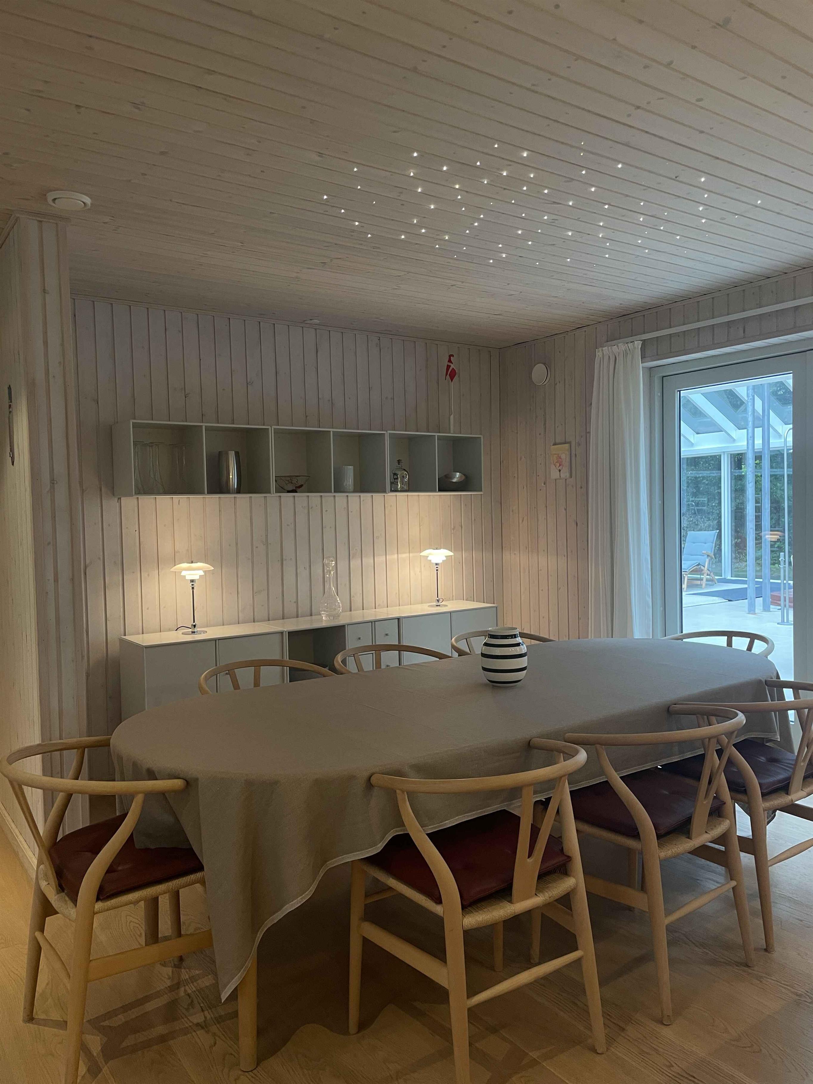 Ein schönes, geräumiges Ferienhaus mit Platz für Gemeinschaft und Entspannung. Die 300 m² umfassen sechs separate Schlafzimmer mit insgesamt sechs Schlafplätzen – ideal für zwei Familien, die gemeinsam reisen. Hier stehen Ruhe, Gemütlichkeit und Zusammensein im Mittelpunkt – ohne Bildschirme und Elektronik. Das Haus liegt in einer ruhigen Umgebung mit viel Platz drinnen und draußen. Die große Terrasse, der Grillplatz und der gepflegte Garten laden zu Aktivitäten im Freien und langen Sommerabenden ein. Ein großzügiger Wintergarten verlängert den Tag, auch bei wechselhaftem Wetter. Innen ist das Haus komplett möbliert mit allem, was man braucht. Ein großer Esstisch bringt alle zu den Mahlzeiten zusammen, und Sofas und Liegestühle bieten Platz zum Entspannen. Es gibt ein TV-Zimmer, WLAN und klassische Brettspiele für ruhige Abende. Die Umgebung bietet vielfältige Naturerlebnisse. In der Nähe befinden sich Wälder, Wanderwege und ein See, ideal für Spaziergänge und Pausen mit Aussicht. Die Küste ist nur 6 km entfernt – mit schönen Stränden und kleinen Orten, ideal für einen Tagesausflug oder ein Eis in der Sonne. Ein perfekter Ort, um das Tempo zu drosseln und gemeinsam Zeit zu verbringen. Ob Sie die Natur erkunden oder einfach zu Hause entspannen möchten – Haus und Umgebung bieten den idealen Rahmen für einen erholsamen und bereichernden Urlaub. Achtung: Wird nicht für gewerbliche Nutzung vermietet.