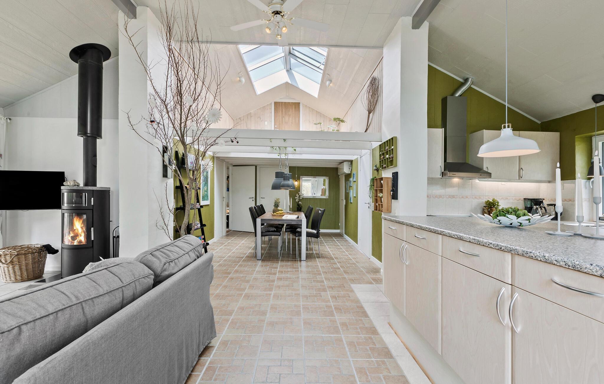 Willkommen in diesem herrlichen Ferienhaus, das Sie mit hohen Decken, Oberlichtern und einer heimeligen Atmosphäre Sie erwartet. Fröhliche Farben und hereinströmendes Sonnenlicht laden Sie ein sich in den gemütlichen Räumen wie zuhause zu fühlen. Freuen Sie sich auf gesellige Abendstunden, mit einem knisternden Feuer im Holzofen, auf den Sofas oder essen und spielen am Esstisch. Hobbyköche können sich über ein Fach im Ofen freuen, in dem Sie die Wärme nutzen können, um ein Brot zu backen. Auch der Wintergarten ist ein toller Ort, um zusammen zu kommen.