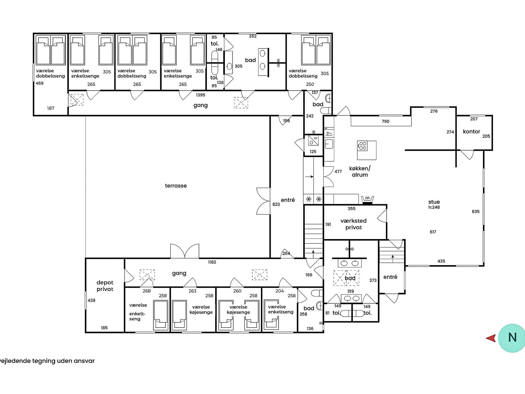 9 Schlafz.: (1DB)+(1DB)+(1DB)+(1B)+(1B)+(2B)+(2B)+(4K)+(2K), WC, WC, Waschb., Waschb., Dusche, Dusche