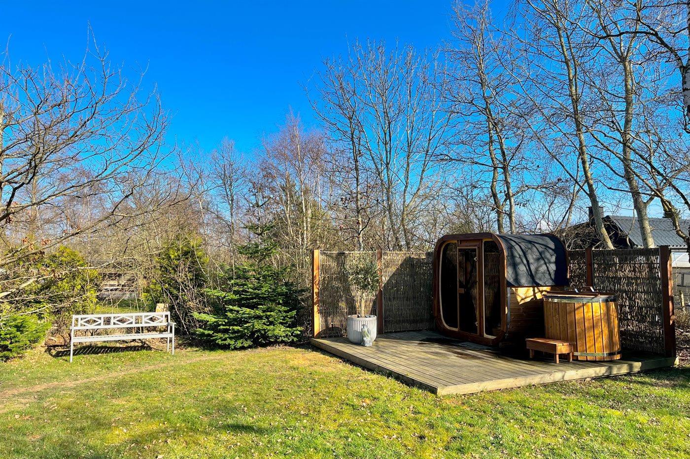 Wellnessbereich im Garten – eine Außensauna und ein Cold water tub – für Entspannung und Genuss. Im Garten gibt es eine Minigolfbahn. Es handelt sich um eine Bahn mit mehreren lustigen Hindernissen, die man nach Belieben wechseln kann.