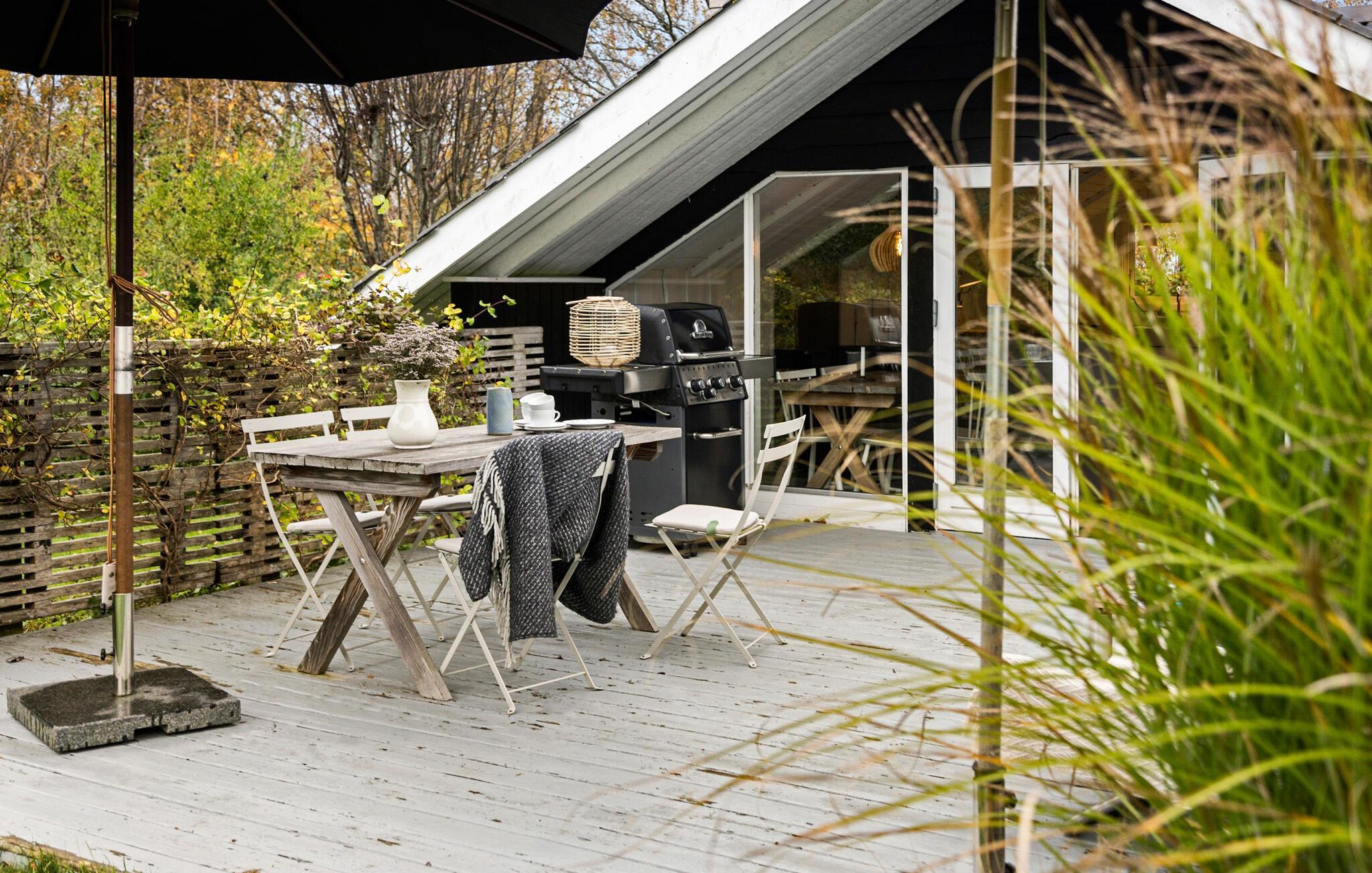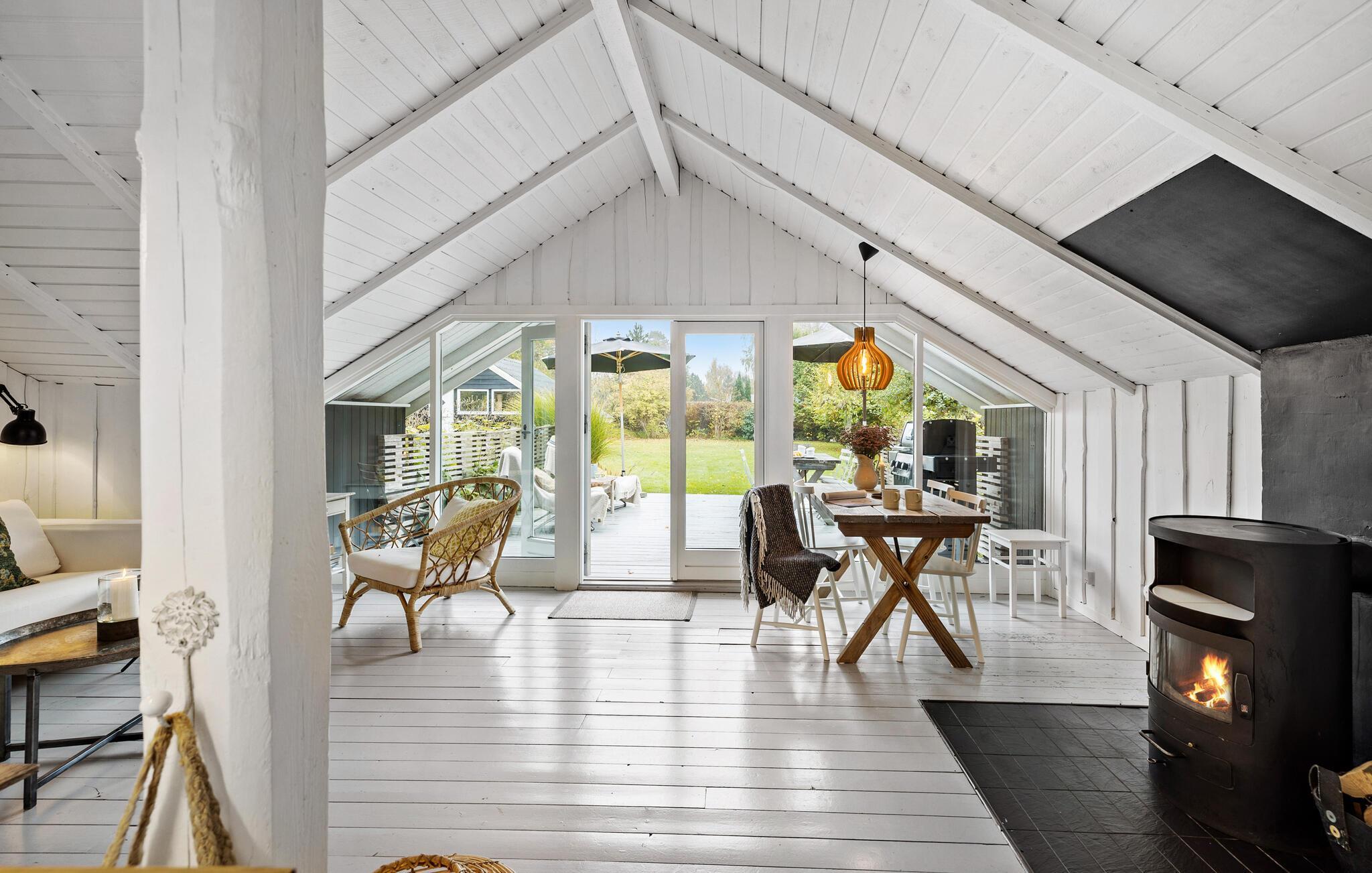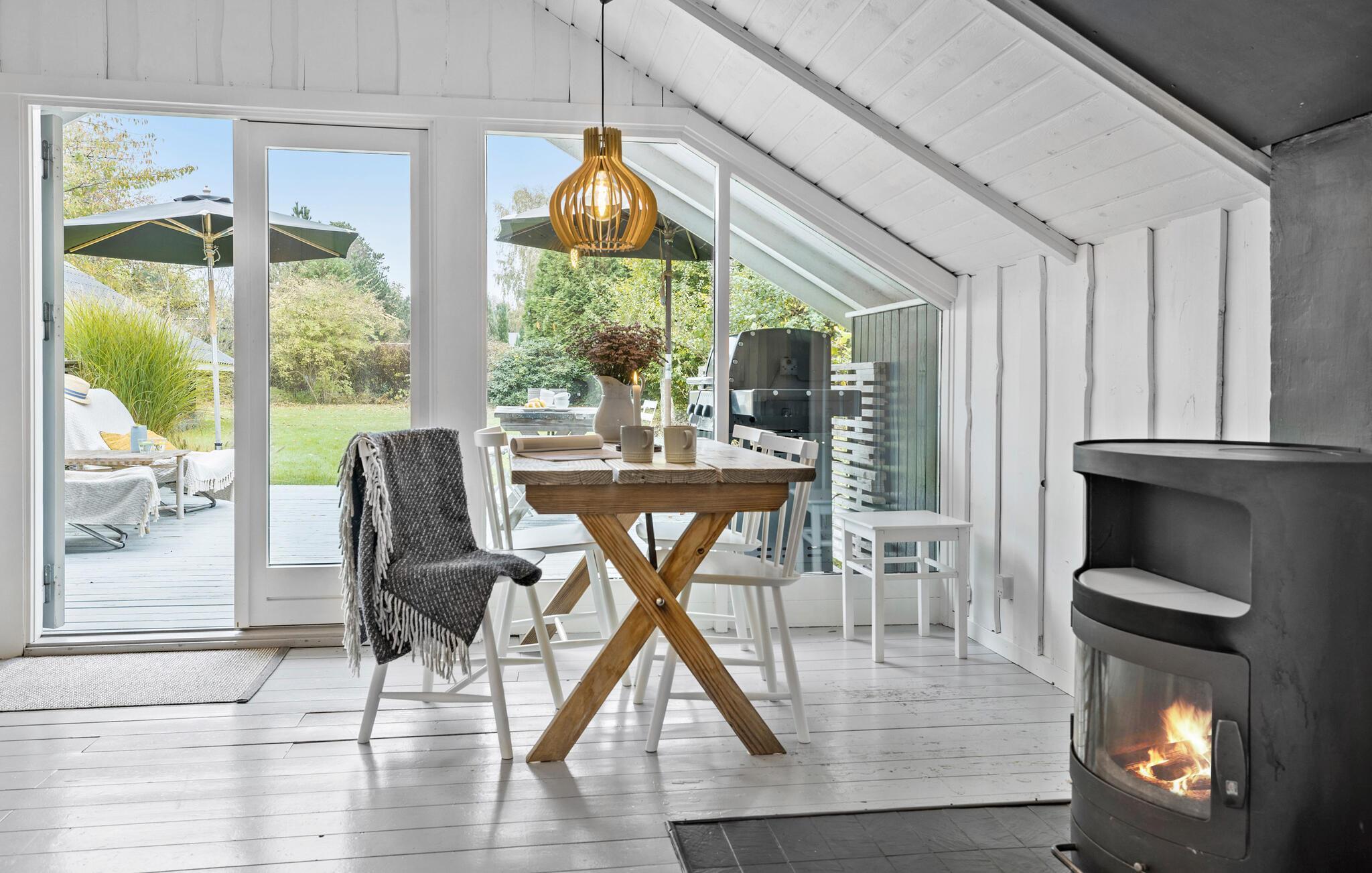 Ihr Ferienhaus vereint die klassisch-dänische Sommerhaus-Atmosphäre mit nordischer Tradition und modernem Design. Der helle Wohnraum mit viel Licht und dem schönen Blick in den Garten sorgt für eine ganz besondere Wohlfühlatmosphäre. Starten Sie Ihren Tag mit einer Tasse Kaffee auf der Terrasse und genießen Sie die Ruhe der Natur. In der stilvollen Küche können Sie kulinarische Köstlichkeiten zubereiten und diese am schönen Esstisch genießen. Der gemütliche Kaminofen lädt dazu ein, es sich auf dem Sofa mit einem Buch gemütlich zu machen und einfach zu entspannen.