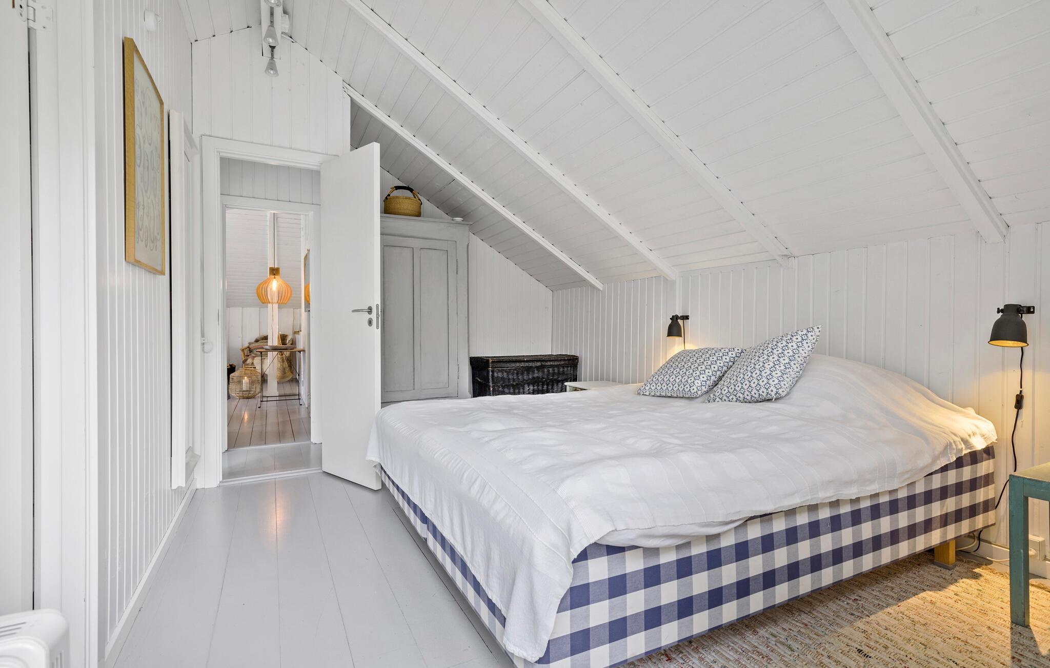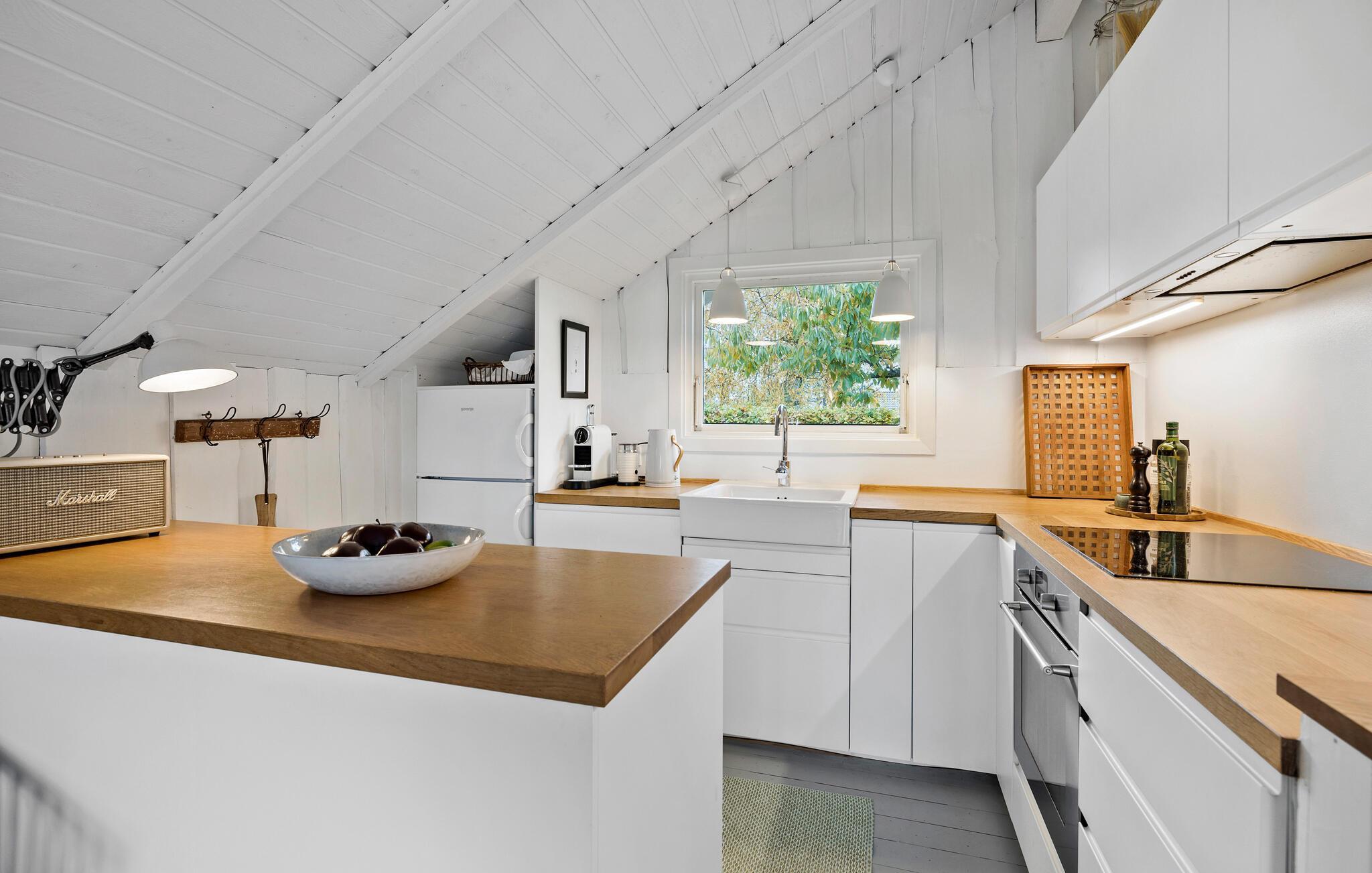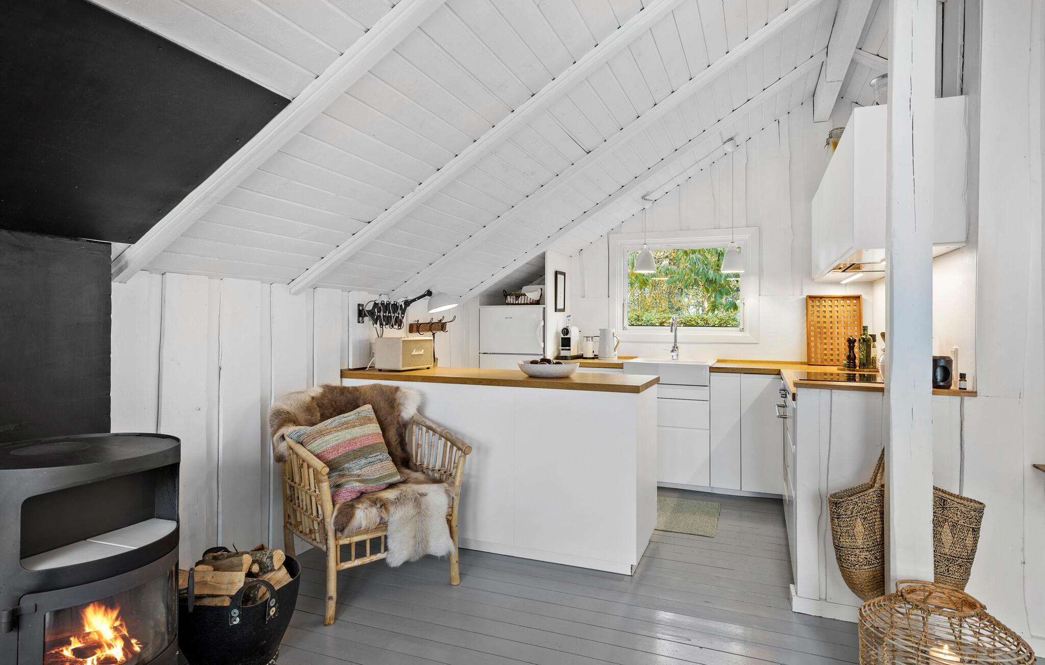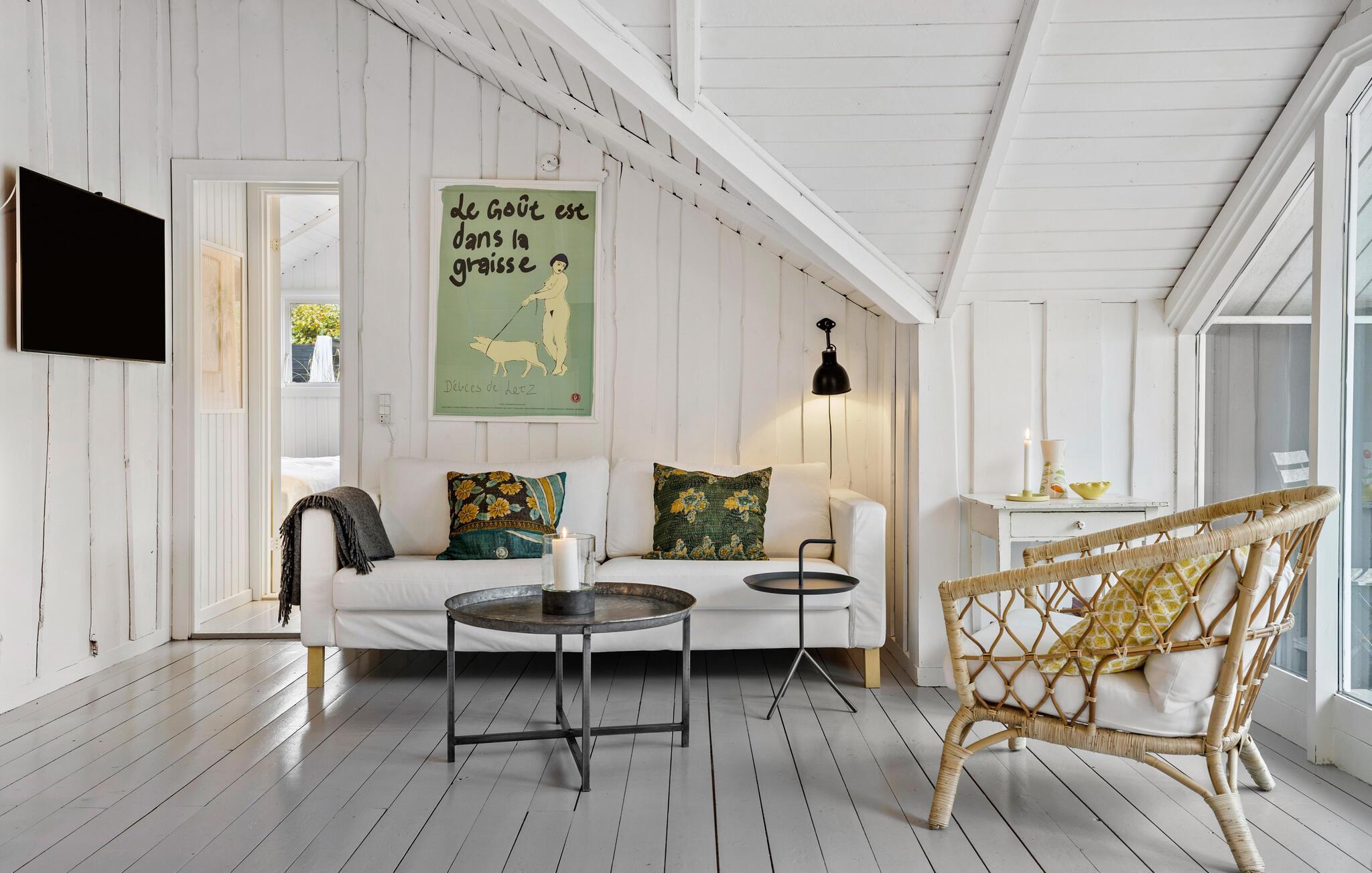 Ihr Ferienhaus vereint die klassisch-dänische Sommerhaus-Atmosphäre mit nordischer Tradition und modernem Design. Der helle Wohnraum mit viel Licht und dem schönen Blick in den Garten sorgt für eine ganz besondere Wohlfühlatmosphäre. Starten Sie Ihren Tag mit einer Tasse Kaffee auf der Terrasse und genießen Sie die Ruhe der Natur. In der stilvollen Küche können Sie kulinarische Köstlichkeiten zubereiten und diese am schönen Esstisch genießen. Der gemütliche Kaminofen lädt dazu ein, es sich auf dem Sofa mit einem Buch gemütlich zu machen und einfach zu entspannen.