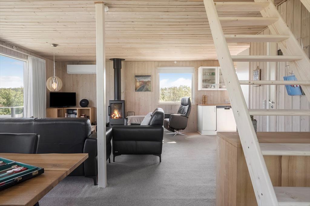 Das gemütliche Holzhaus strahlt eine entspannte Atmosphäre aus, in der man sofort zur Ruhe kommt und sich wie zu Hause fühlt. Die Einrichtung ist hell und einladend mit einer angenehmen Stimmung, die zu Nähe und Ferienentspannung einlädt. Ihr könnt euch in den verschiedenen Wohnbereichen verteilen, ein Brettspiel am Esstisch spielen, eine ruhige Pause auf dem Sofa genießen oder im offenen Küchenbereich das Essen zubereiten, während im Hintergrund Gespräche stattfinden. Wenn Kinder mit im Urlaub sind, wird der Hems (offene Schlafgalerie) sicher schnell zu ihrem Lieblingsplatz – nicht nur, weil es dort so schön gemütlich ist, sondern auch wegen des tollen Ausblicks über die umliegende Landschaft. Das ganze Haus versprüht eine heimelige Atmosphäre und ist der perfekte Ausgangspunkt für Entspannung und gemeinsame Erlebnisse.