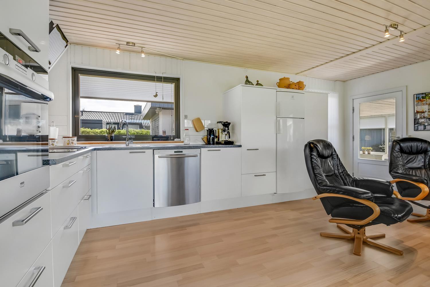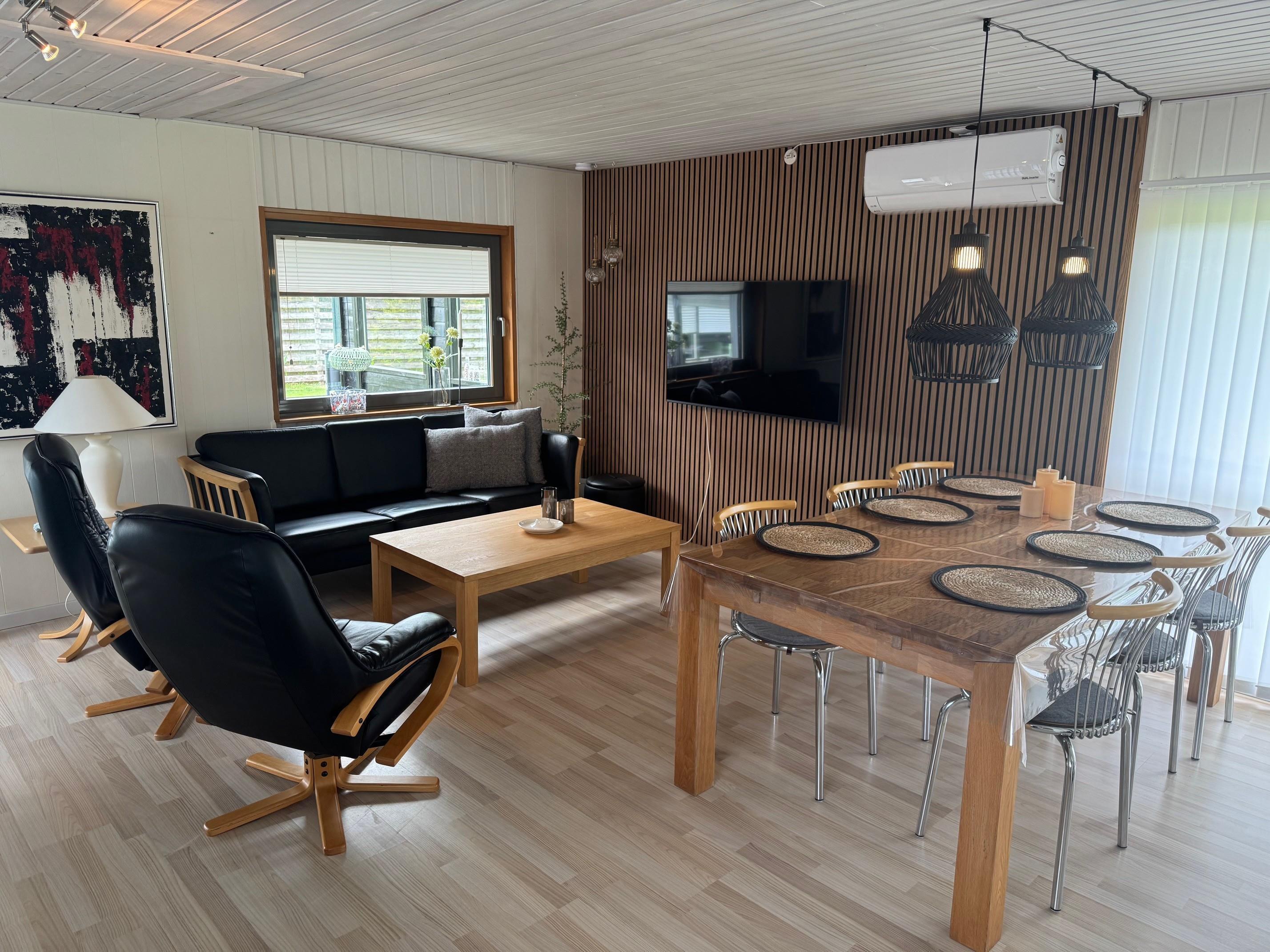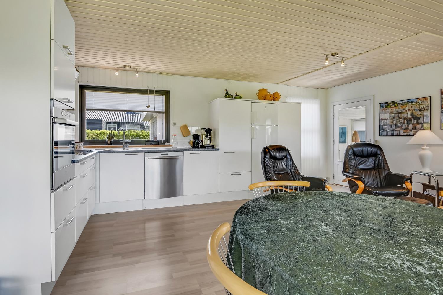 Schönes Steinhaus mit 3 schönen Schlafzimmern (1 Doppelbett, 2 Einzelbetten, 1 Etagenbett), wobei 2 der Zimmer mit Linoleumboden und das letzte mit Teppichboden ausgestattet sind. Das Wohnzimmer und die Küche sind zu einem großen Wohnbereich kombiniert, in dem sich die ganze Familie versammeln kann. Das Wohnzimmer erhält viel Licht durch die großen Fenster, von denen aus man einen Blick auf den Garten hat. Die Sofaecke ist mit Ledermöbeln, einem Fernseher mit dänischen und deutschen Sendern sowie einem Radio ausgestattet. Es gibt auch kostenloses Internet. Das Wohnzimmer hat Linoleumboden und verfügt über eine Wärmepumpe und einen Kaminofen, die zu einer energieeffizienten Beheizung des Hauses beitragen. Vor dem Kamin befinden sich auch zwei Sessel, um die Wärme zu genießen, vielleicht während man ein Buch liest. Die Küchenecke ist gut ausgestattet mit allem, was man braucht: Elektroherd, Backofen, Abzugshaube, Kühl-/Gefrierschrank und Spülmaschine. Gegenüber der Küchenecke steht der Esstisch mit Platz für 6 Personen. Von der Küche aus gelangt man zu einem gemütlich eingerichteten Wintergarten mit großen Fenstern zum Garten. Vom einen Schlafzimmer aus hat man Zugang zum großen Badezimmer des Hauses mit Toilette, Waschbecken und Dusche mit Dachfenster, Waschmaschine und Fliesenboden. Darüber hinaus gibt es eine Gästetoilette im Eingangsbereich mit Toilette und Waschbecken. Nichtraucherhaus. Maximal 1 Haustier erlaubt.