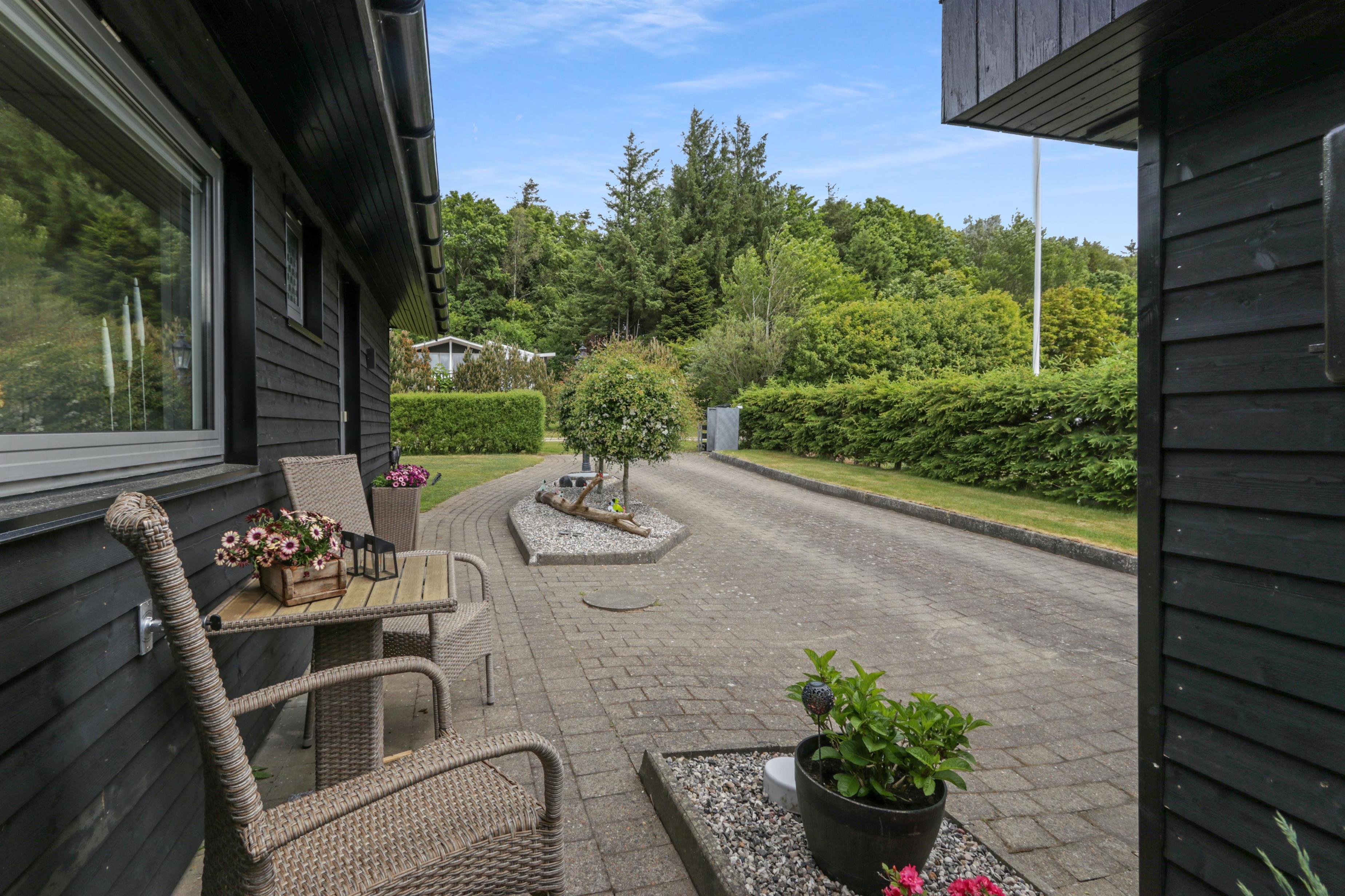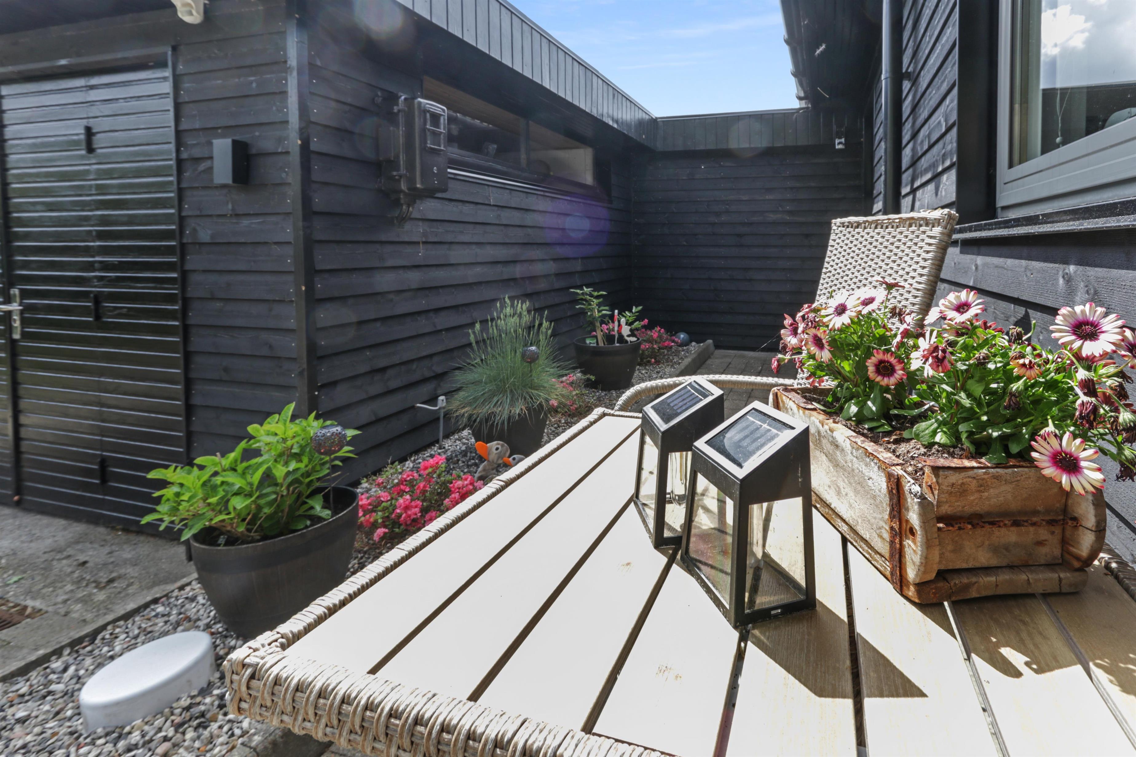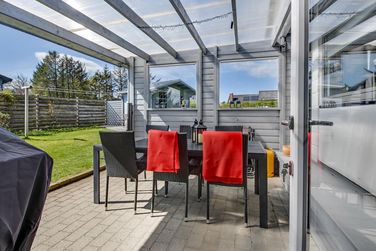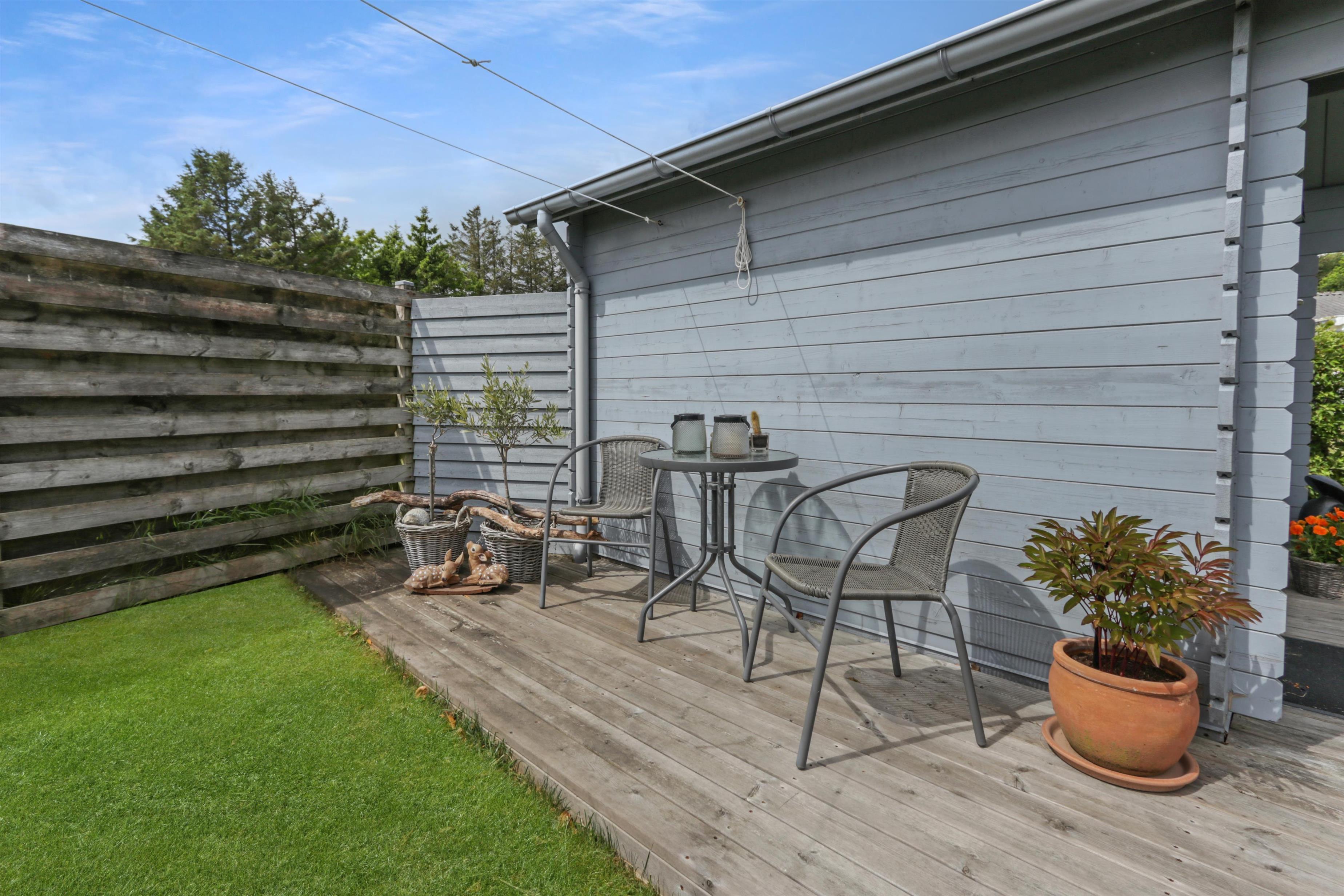 Das Haus liegt auf einem 771 m2 großen Grundstück mit Einfahrt, wo das Auto in der Nähe der Haustür geparkt werden kann, und außerdem gibt es eine große Rasenfläche um das Haus herum. Vom Wintergarten aus gelangt man auf eine überdachte Terrasse. Hier gibt es einen Grill, Gartenmöbel und Sonnenliegen, die je nach Bedarf verschoben werden können. Die Terrasse kann auch mit einem ausziehbaren Sichtschutz abgeschirmt werden, sodass man vor Wind und intensiver Sonne geschützt ist. Es besteht also die Möglichkeit, bei jedem Wetter draußen zu sitzen.