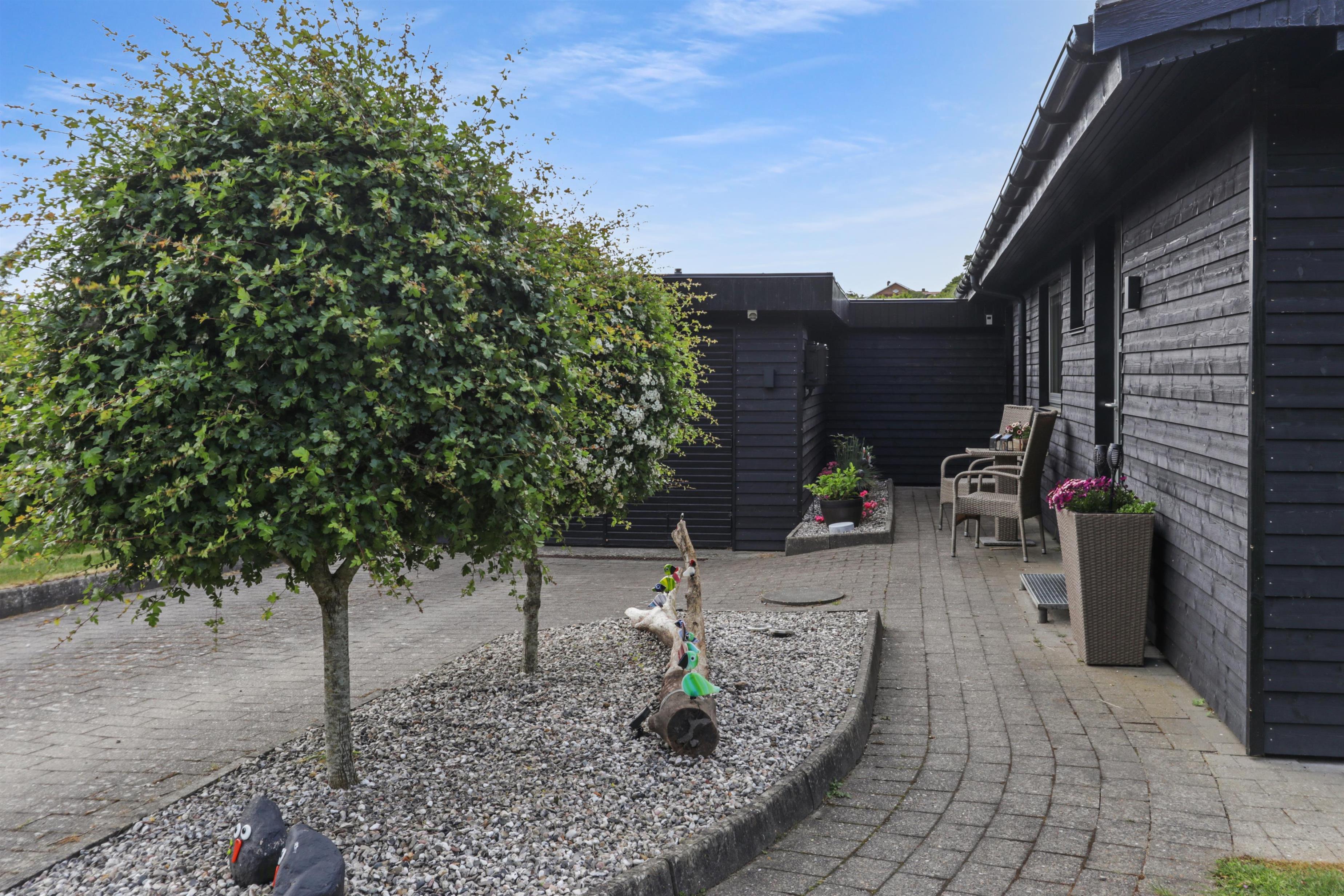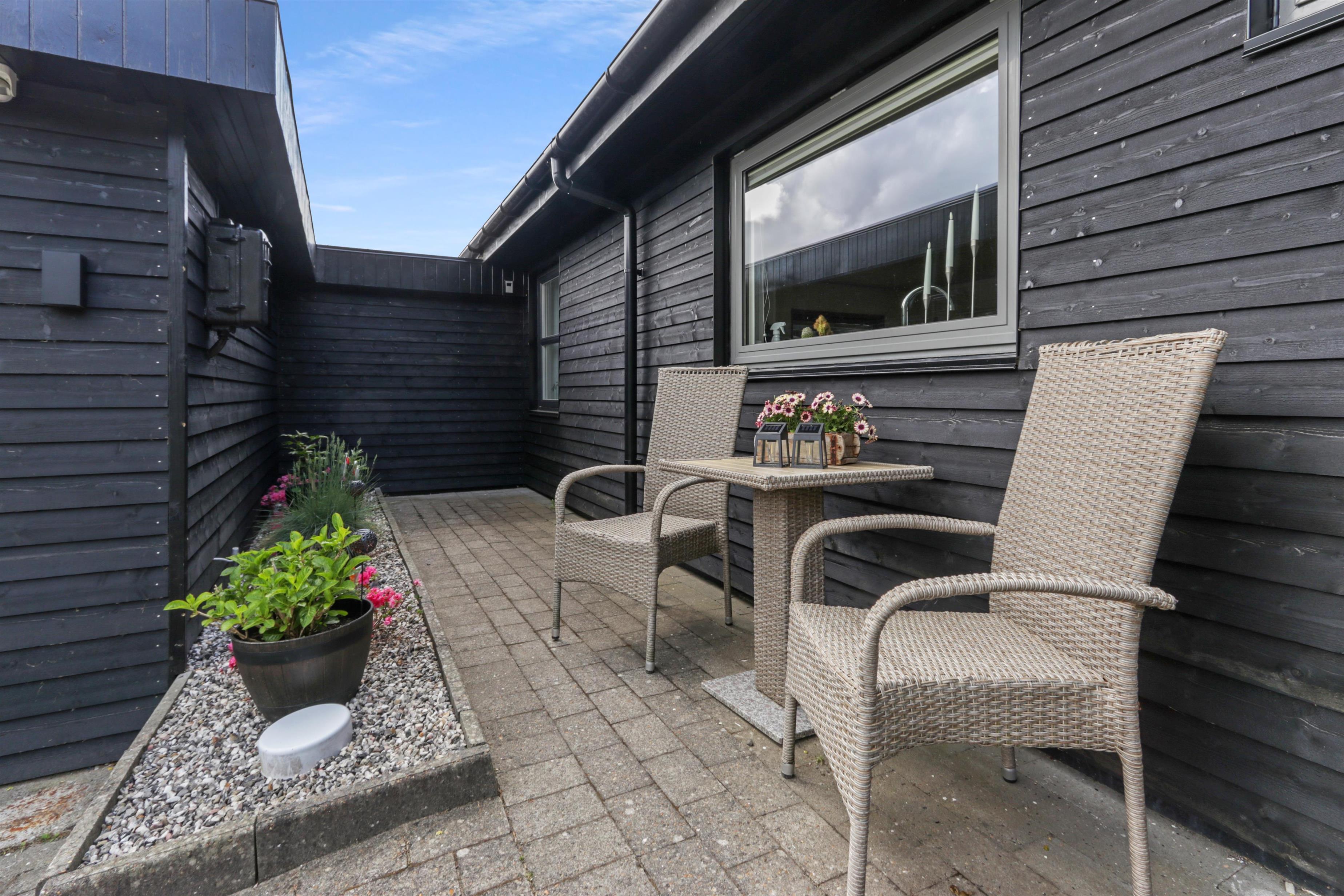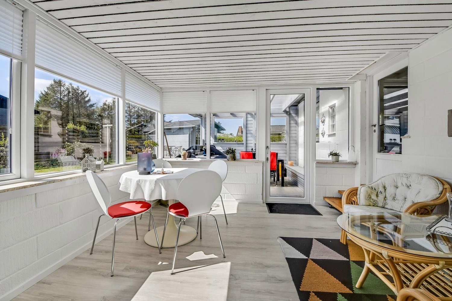 Das Haus liegt auf einem 771 m2 großen Grundstück mit Einfahrt, wo das Auto in der Nähe der Haustür geparkt werden kann, und außerdem gibt es eine große Rasenfläche um das Haus herum. Vom Wintergarten aus gelangt man auf eine überdachte Terrasse. Hier gibt es einen Grill, Gartenmöbel und Sonnenliegen, die je nach Bedarf verschoben werden können. Die Terrasse kann auch mit einem ausziehbaren Sichtschutz abgeschirmt werden, sodass man vor Wind und intensiver Sonne geschützt ist. Es besteht also die Möglichkeit, bei jedem Wetter draußen zu sitzen.