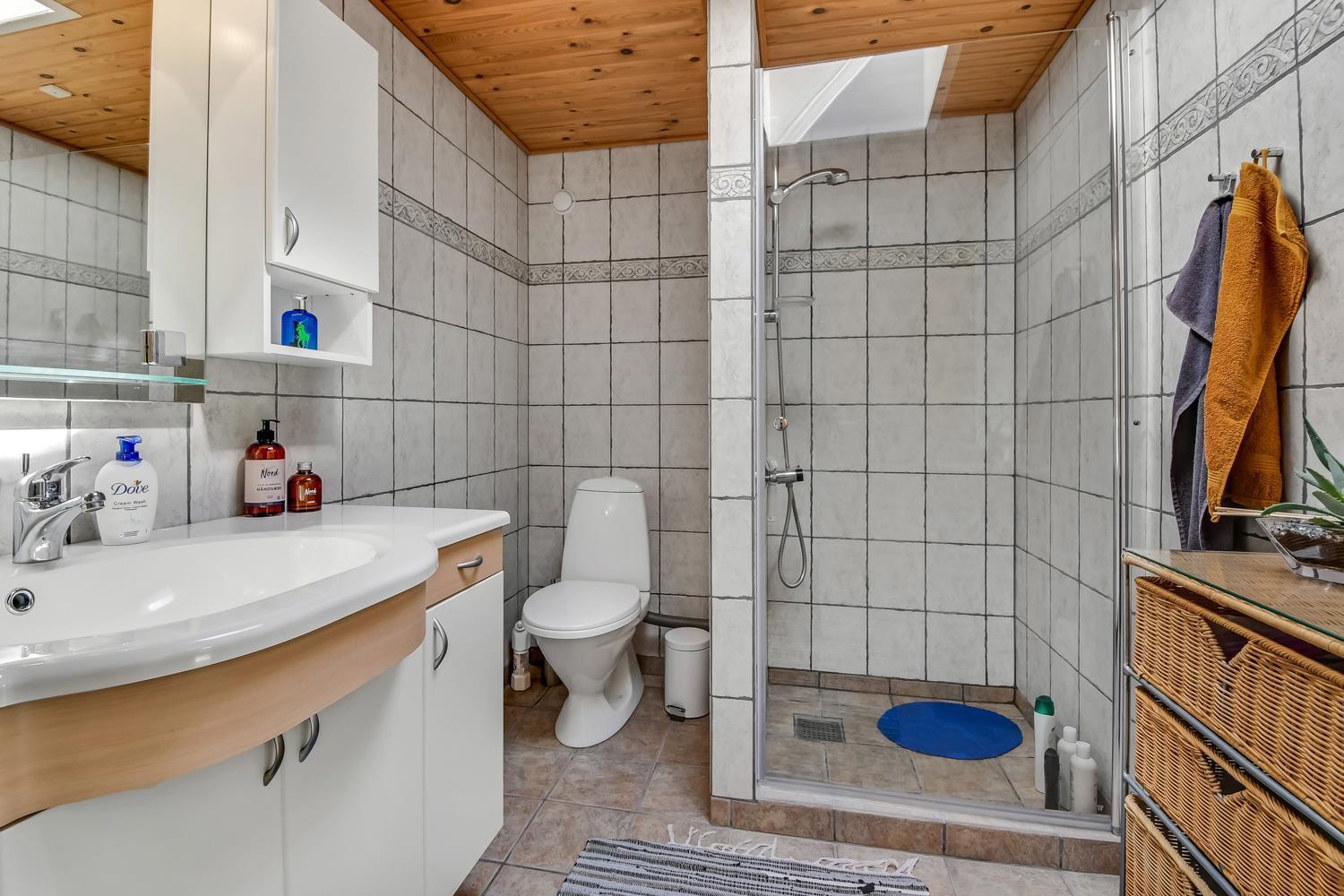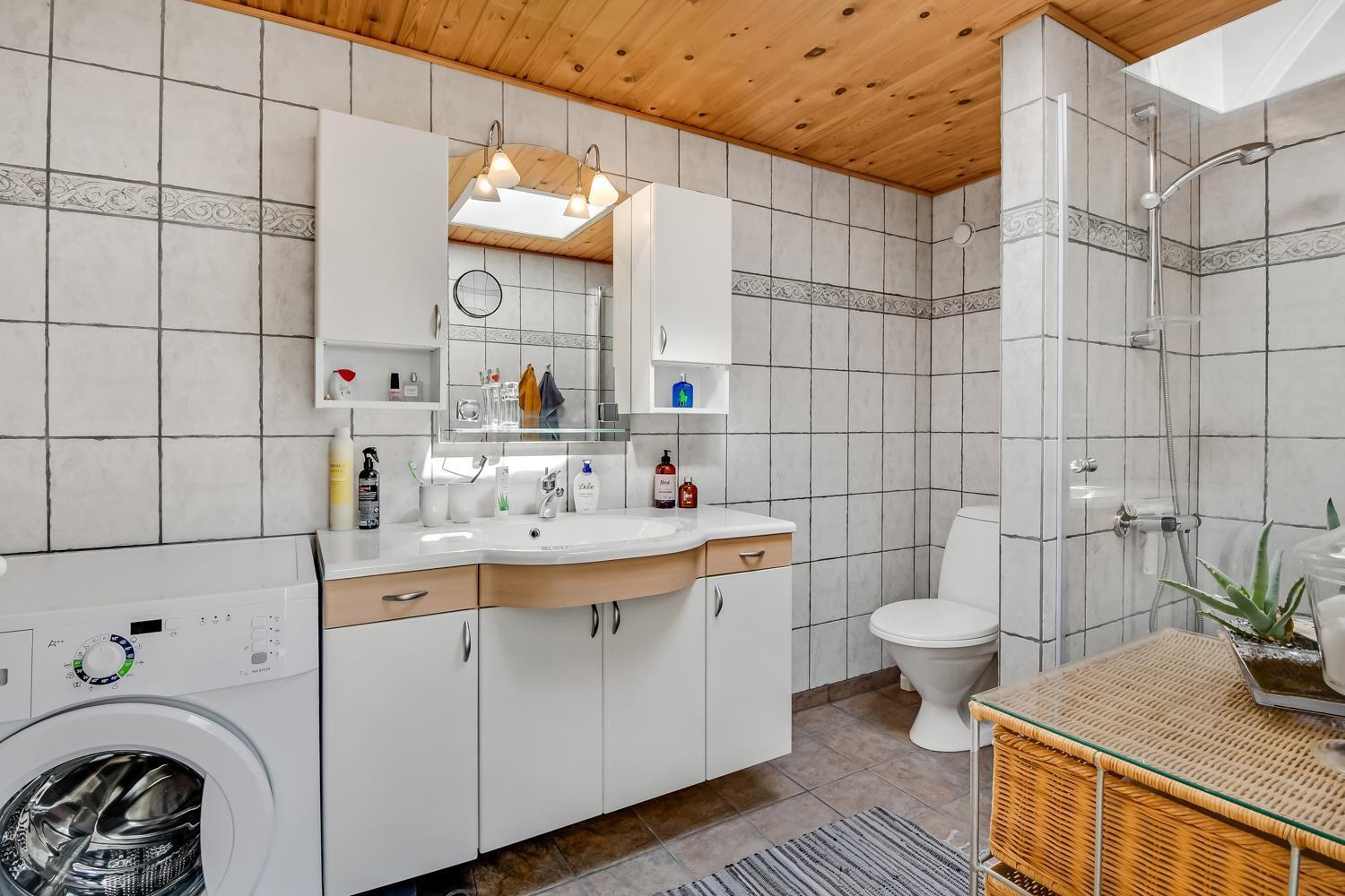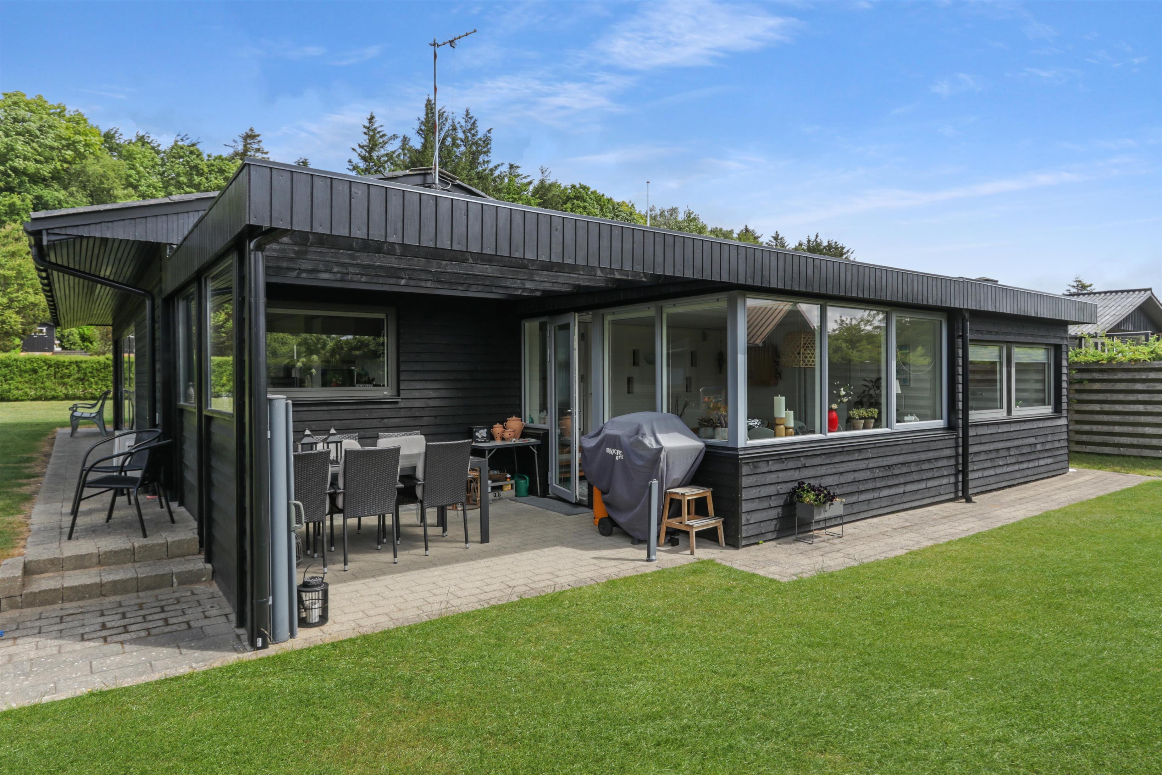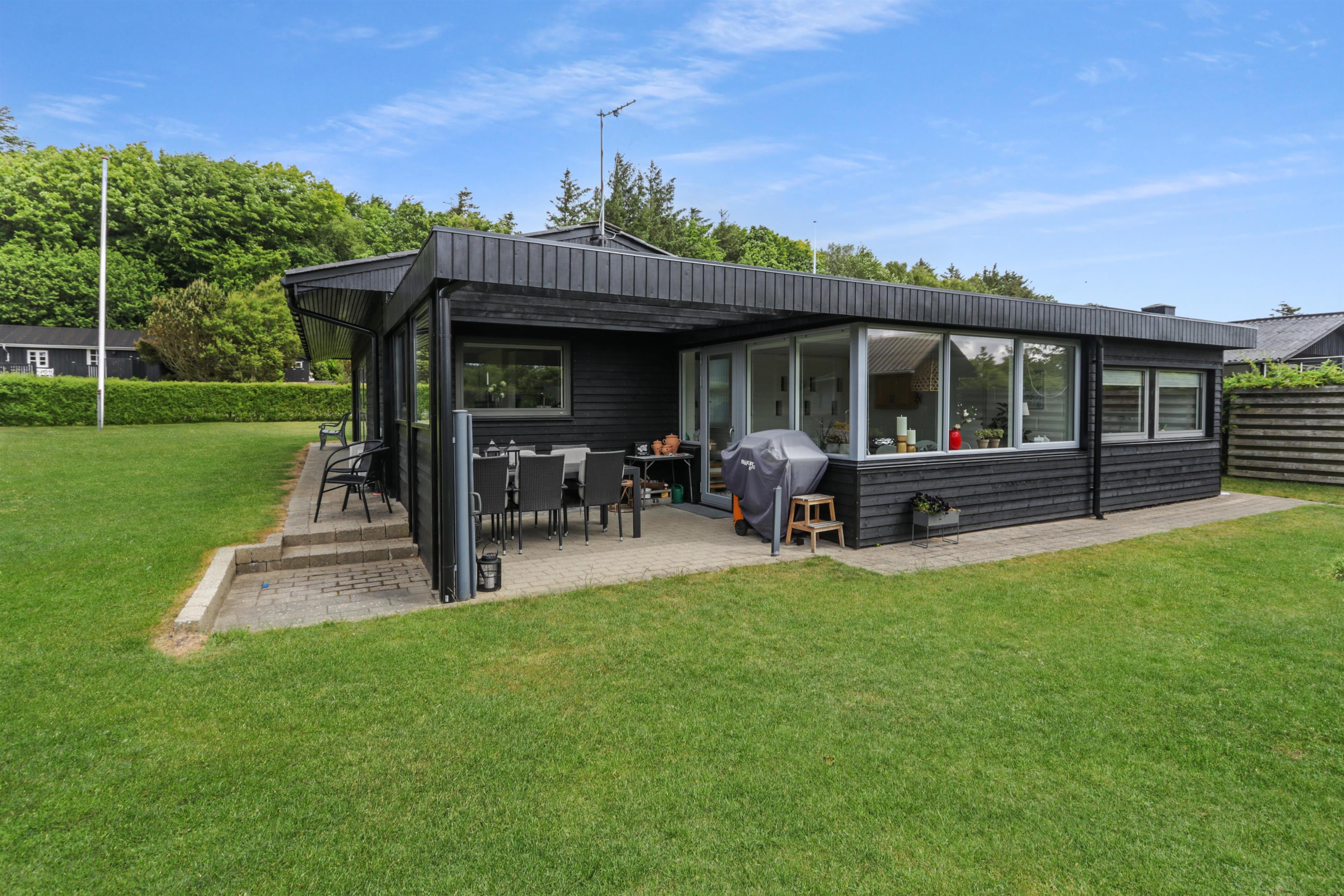 Das Haus liegt auf einem 771 m2 großen Grundstück mit Einfahrt, wo das Auto in der Nähe der Haustür geparkt werden kann, und außerdem gibt es eine große Rasenfläche um das Haus herum. Vom Wintergarten aus gelangt man auf eine überdachte Terrasse. Hier gibt es einen Grill, Gartenmöbel und Sonnenliegen, die je nach Bedarf verschoben werden können. Die Terrasse kann auch mit einem ausziehbaren Sichtschutz abgeschirmt werden, sodass man vor Wind und intensiver Sonne geschützt ist. Es besteht also die Möglichkeit, bei jedem Wetter draußen zu sitzen.
