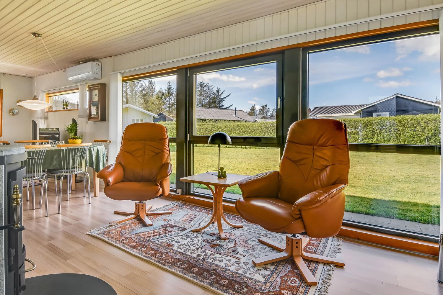 Das Haus befindet sich in der wunderschönen Gegend von Toftum Bjerge und ist nur wenige hundert Meter zu Fuß von der Limfjord entfernt. Toftum Bjerge ist wirklich eine fantastische Gegend, sowohl wenn man einen aktiven Urlaub haben möchte als auch für eine Pause vom hektischen Alltag, um einfach die Natur zu genießen. Es gibt reichlich Gelegenheit die Wanderstiefel einzulaufen, indem man entlang der bis zu 40 Meter hohen Küstenklippe spazieren geht, die einen Aussichtspunkt auf Thyborøn, Thy, Thyholm und Oddesund bildet. Wenn man zum ruhigen Wasser des Limfjords an den Strand geht, kann man die Paraglider beobachten, die von der Klippe aus fliegen, oder die Surfer im Wasser. Wenn man eine Wasserratte ist, kann man selbst versuchen zu surfen oder einfach schwimmen gehen. Ein paar hundert Meter vom Haus entfernt liegt der Humlum Golfplatz. Interessiert man sich für Golf, ist dies eine gute Möglichkeit für diejenigen, die eine gute Runde Golf in der wunderschönen Umgebung genießen möchten. Außerdem gibt es verschiedene Radwege, auf denen man die Gegend erkunden kann. In wenigen Autominuten erreicht man die gemütliche Kleinstadt Struer. Hier kann man in den örtlichen Geschäften einkaufen und auch das B&O Museum besuchen.