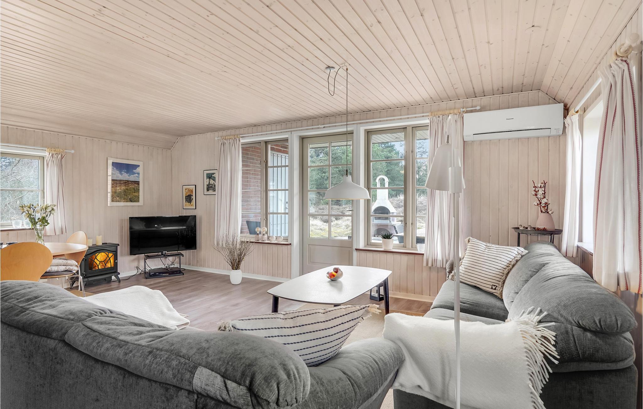 Gemütliches Ferienhaus in Toftum mit Blick auf heidebewachsene Dünen und energiesparender Wärmepumpe.