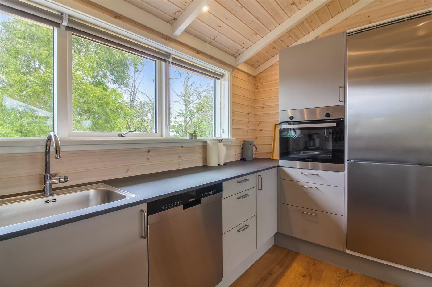 Die Küche ist mit Kühlschrank ausgestattet. Außerdem gibt es 4 Induktions-Kochzonen, Umluftofen sowie Geschirrspüler.