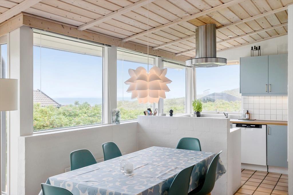 Das Ferienhaus ist hervorragend für sechs Personen eingerichtet. Der Wohnbereich, bestehend aus einer offenen Verbindung zwischen Küche und Wohnzimmer, wirkt dank der großen Fensterfronten, hellen Farbtöne und eleganten Möbeln besonders freundlich und einladend. Die Küche ist gut ausgestattet, und es ist ein Genuss, beim Kartoffelschälen oder Salatwaschen direkt aufs Meer zu blicken. An kühleren Tagen sorgt der Kaminofen für gemütliche Wärme, während Sie an sonnigen Sommertagen die Terrassentüren weit öffnen können. In den meisten Räumen des Hauses sorgt eine Fußbodenheizung unter den Fliesen für angenehme Wärme – mit Ausnahme der zwei Schlafzimmer, die mit Teppichboden ausgestattet sind. Insgesamt gibt es drei Schlafzimmer mit Doppelbetten. Das Badezimmer ist aufgeteilt in ein helles WC und einen großen separaten Duschraum. Zudem gibt es ein zusätzliches Bad im Nebengebäude, das auch eine Sauna sowie eine Waschmaschine und einen Trockner bietet.