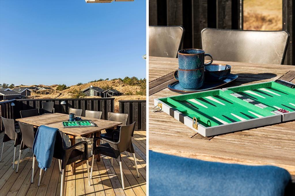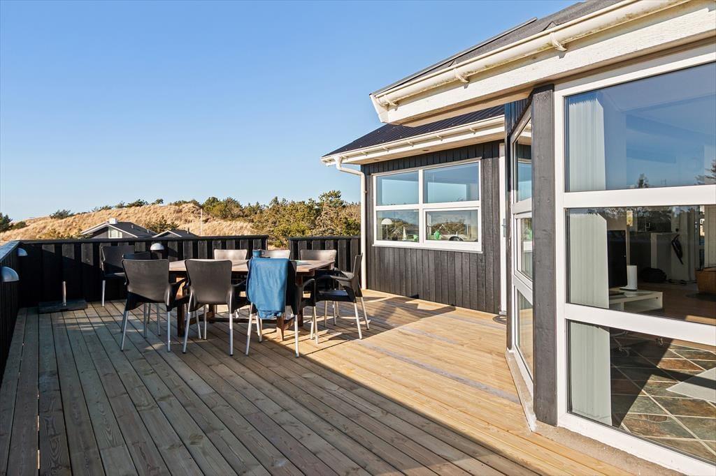 Die Terrasse des Ferienhauses umgibt das ganze Gebäude, sodass du immer den perfekten Platz zum Sitzen finden kannst – egal, ob du morgens die Sonne genießen möchtest oder nachmittags eine der sonnigen oder schattigen Ecken bevorzugst. Vom Terrasse aus hast du einen tollen Blick auf das große Grundstück und die wunderschöne Natur. Die frische Meeresbrise und die entspannte Atmosphäre machen es zu einem idealen Ort, um die Ferientage zu verbringen. Am Abend kannst du den Sonnenuntergang über dem Meer genießen und vielleicht den Grill anzünden, während du mit der Familie eine gute Zeit verbringst.