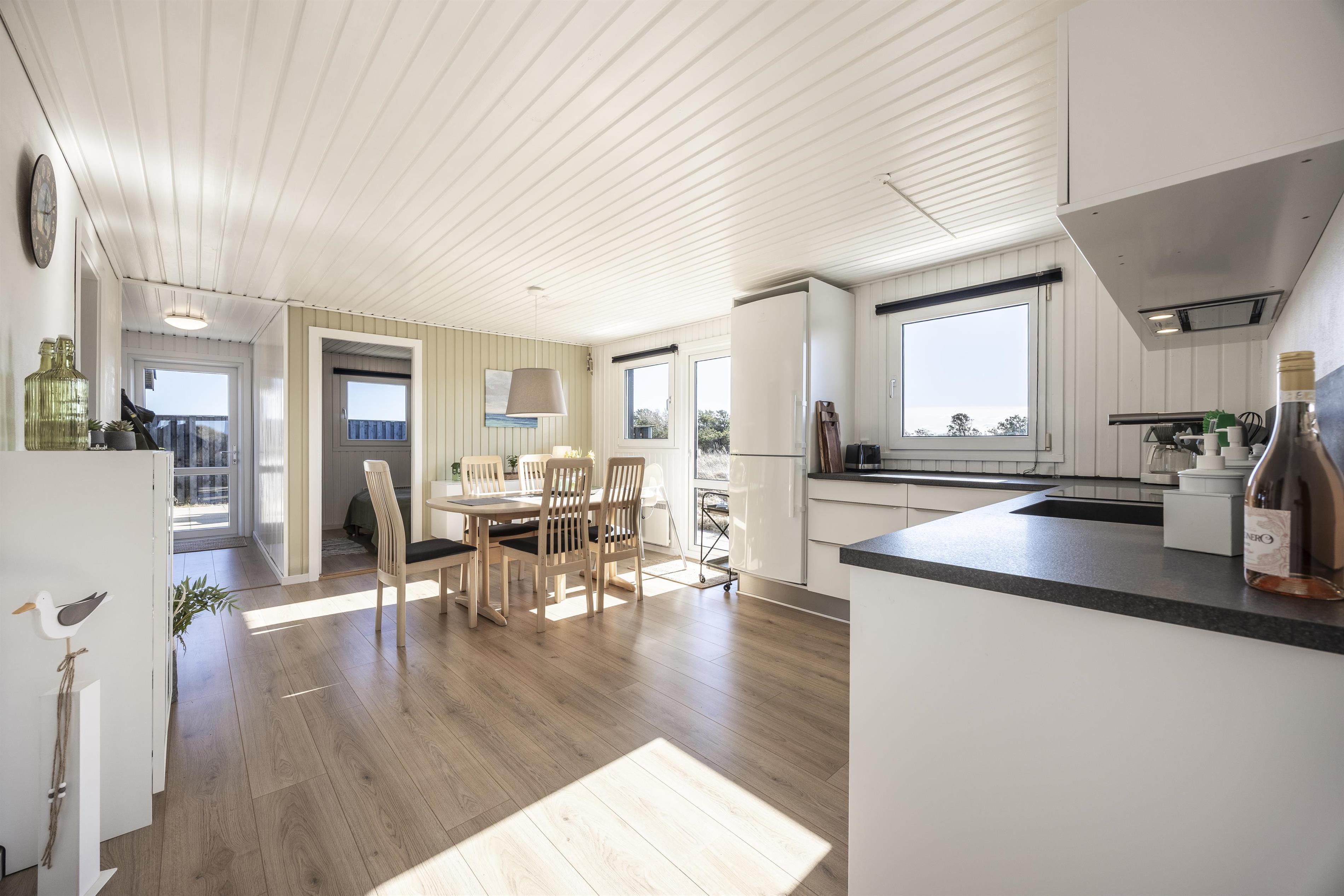 Die Küche ist offen mit dem Essbereich verbunden, und weiter finden Sie ein gemütliches Wohnzimmer mit Sofaecke – der perfekte Ort, um sich nach einem Tag am Strand einen guten Film anzusehen oder sich drinnen zu entspannen, wenn das Wetter nicht zum Draußensein einlädt.