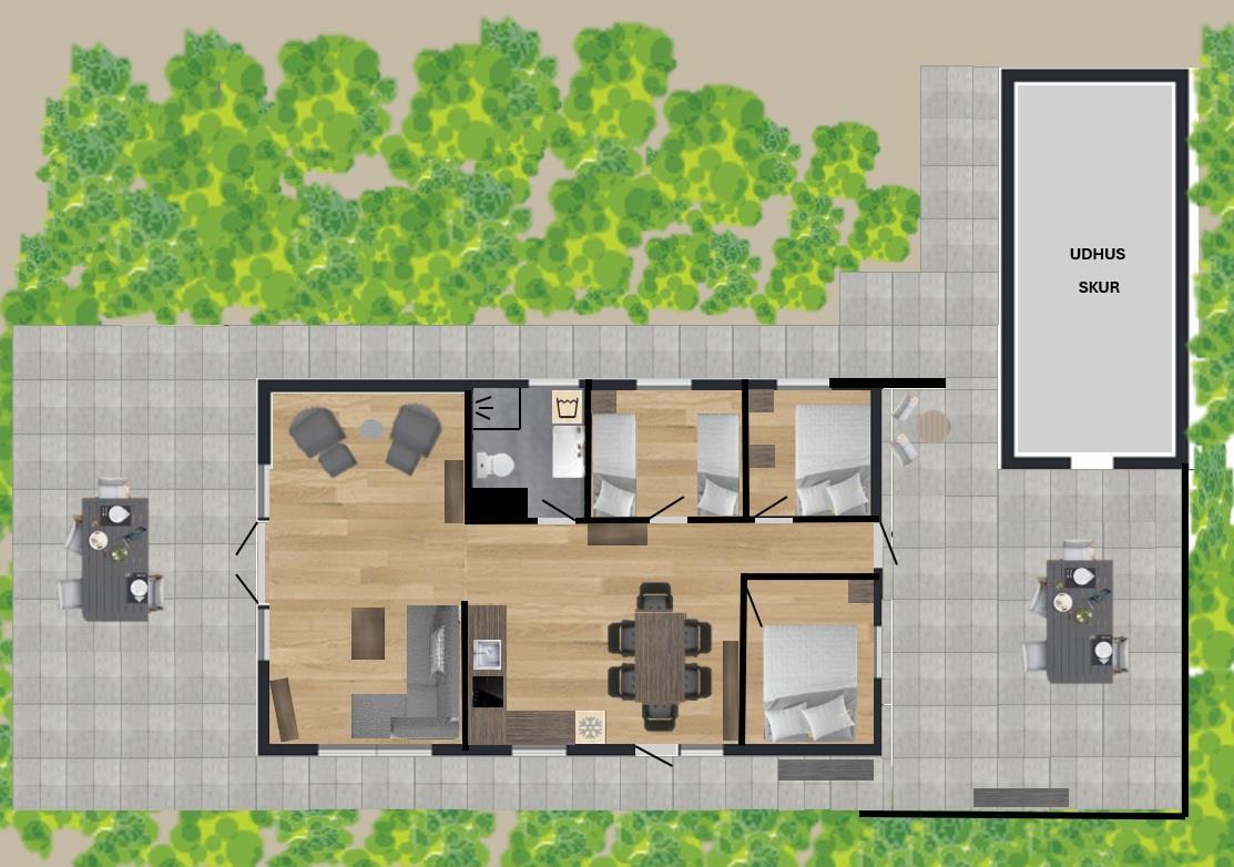 Das Ferienhaus bietet 78 gut gestaltete Quadratmeter. Wenn Sie das Haus betreten, werden Sie von einem praktischen Eingangsbereich empfangen, der genügend Platz für Oberbekleidung und Schuhe bietet. Von hier aus gelangen Sie in drei gemütliche Schlafzimmer sowie ein geräumiges Badezimmer.