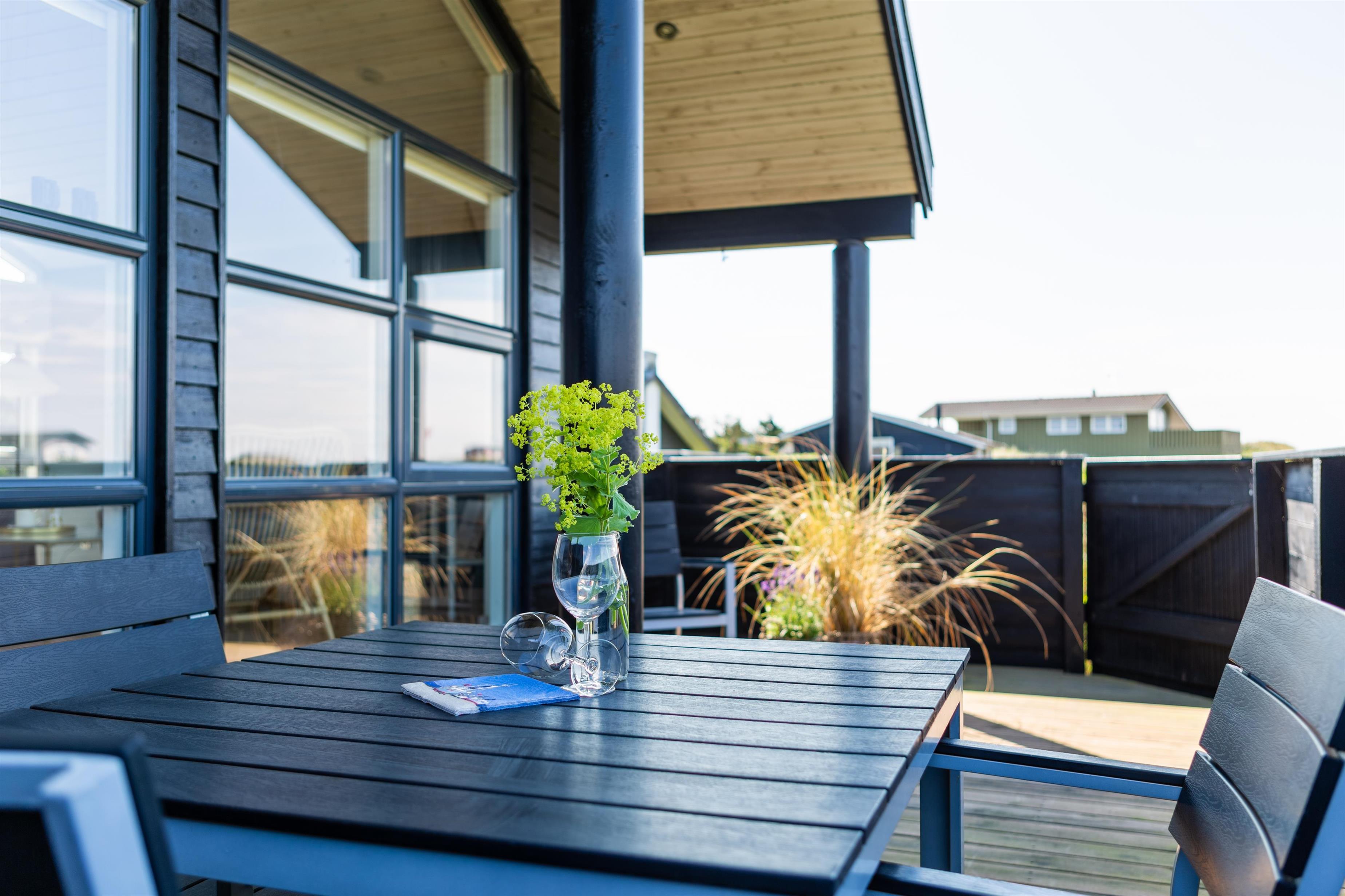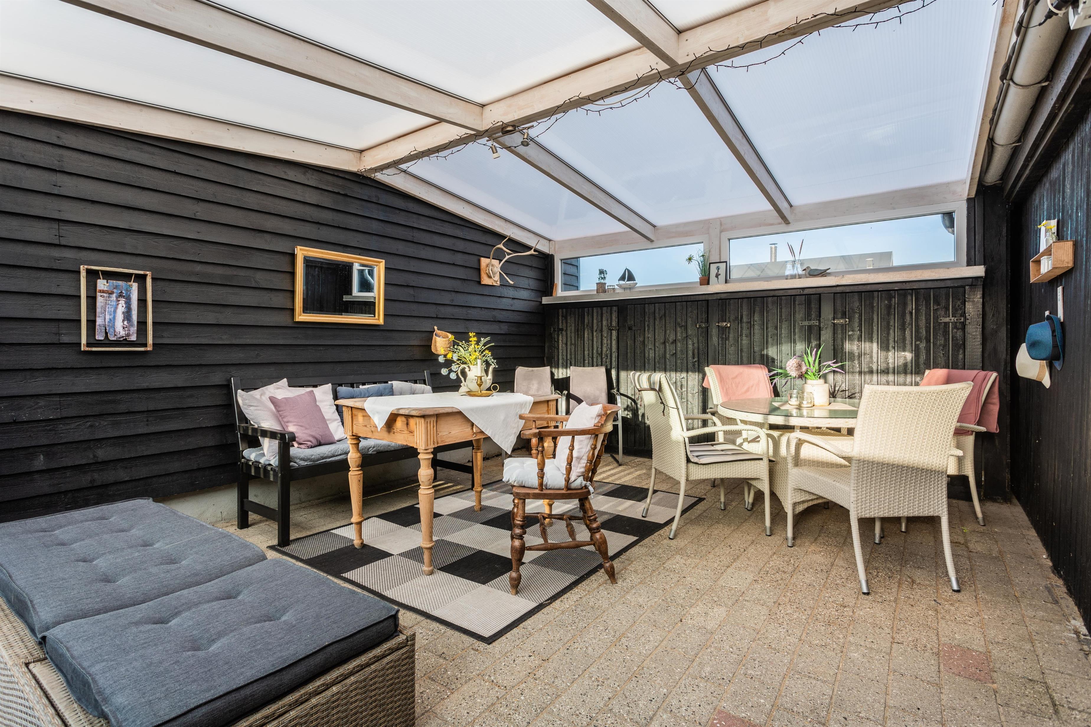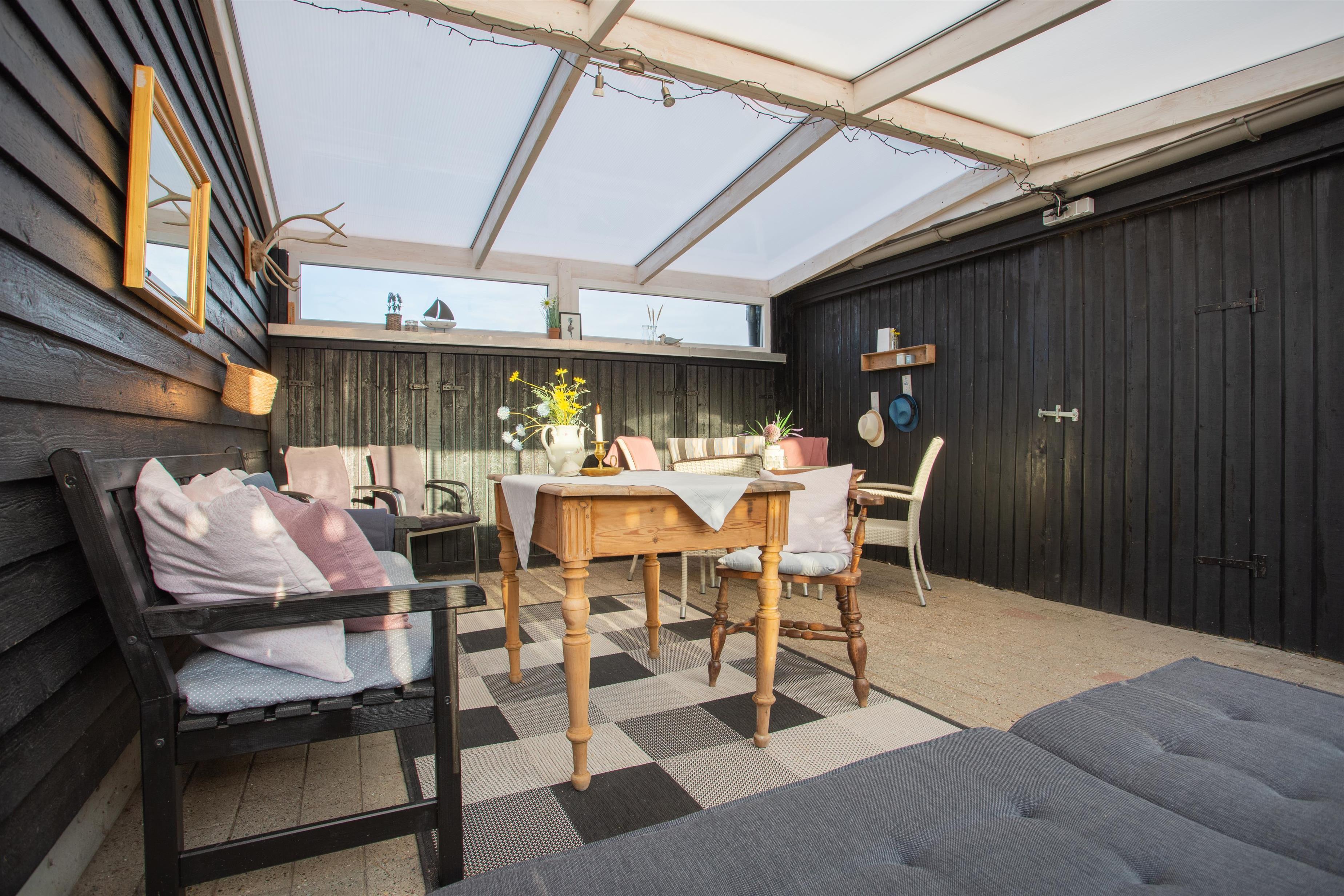Das Ferienhaus ist von mehreren schönen Terrassen umgeben, die ideale Bedingungen für entspannende Stunden im Freien bieten. Die geschützten Ecken ermöglichen es, Mahlzeiten und gemütliche Momente bei jedem Wetter zu genießen. Machen Sie es sich zum Beispiel in einem Liegestuhl mit einem guten Buch und einer Tasse Kaffee bequem und genießen Sie gleichzeitig den schönen Blick auf die Nordsee. Eine überdachte, gemütliche Terrasse bietet zusätzlichen Komfort, egal ob Sie Schatten suchen oder vor den kleinen Sommerregenschauern geschützt sein möchten.