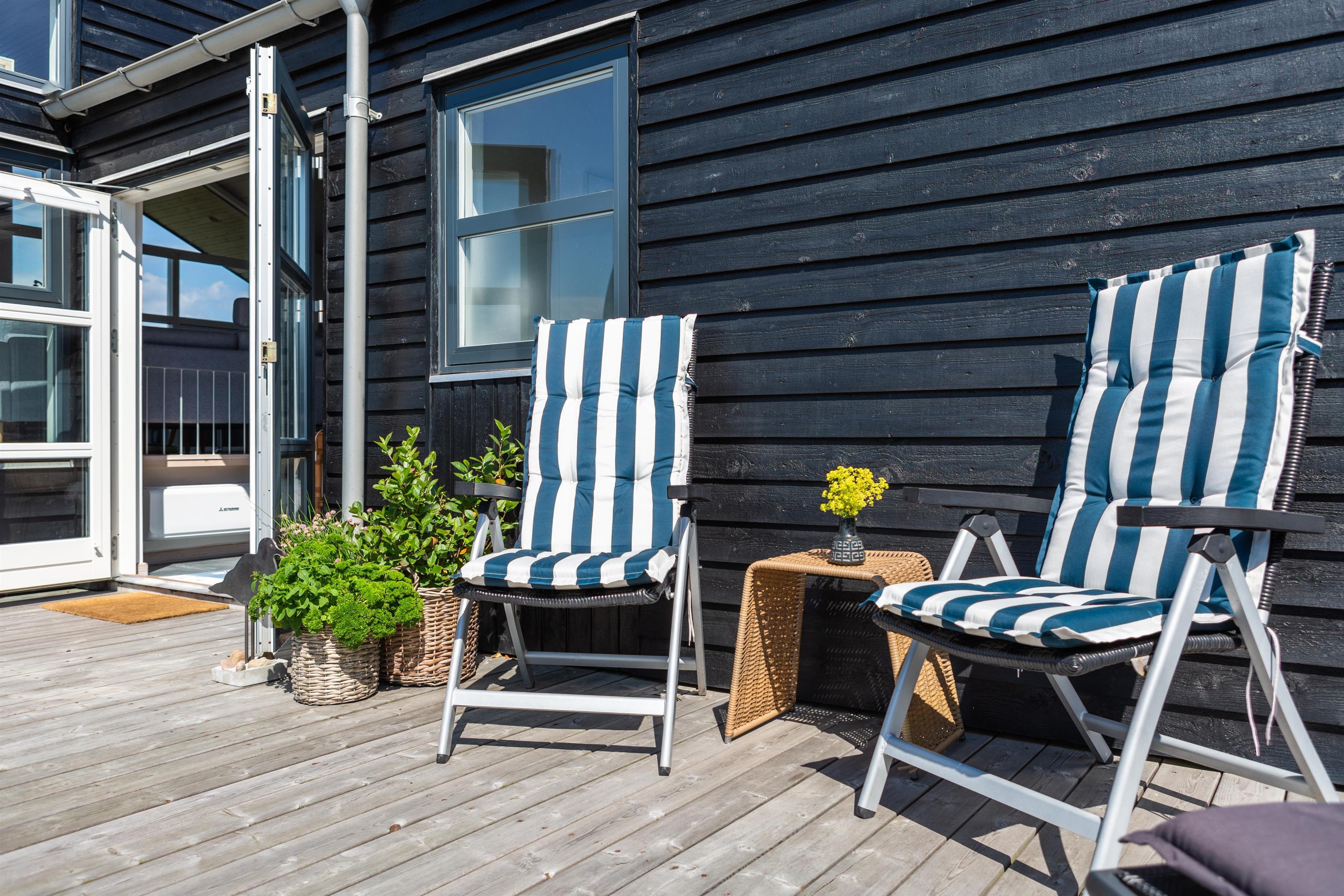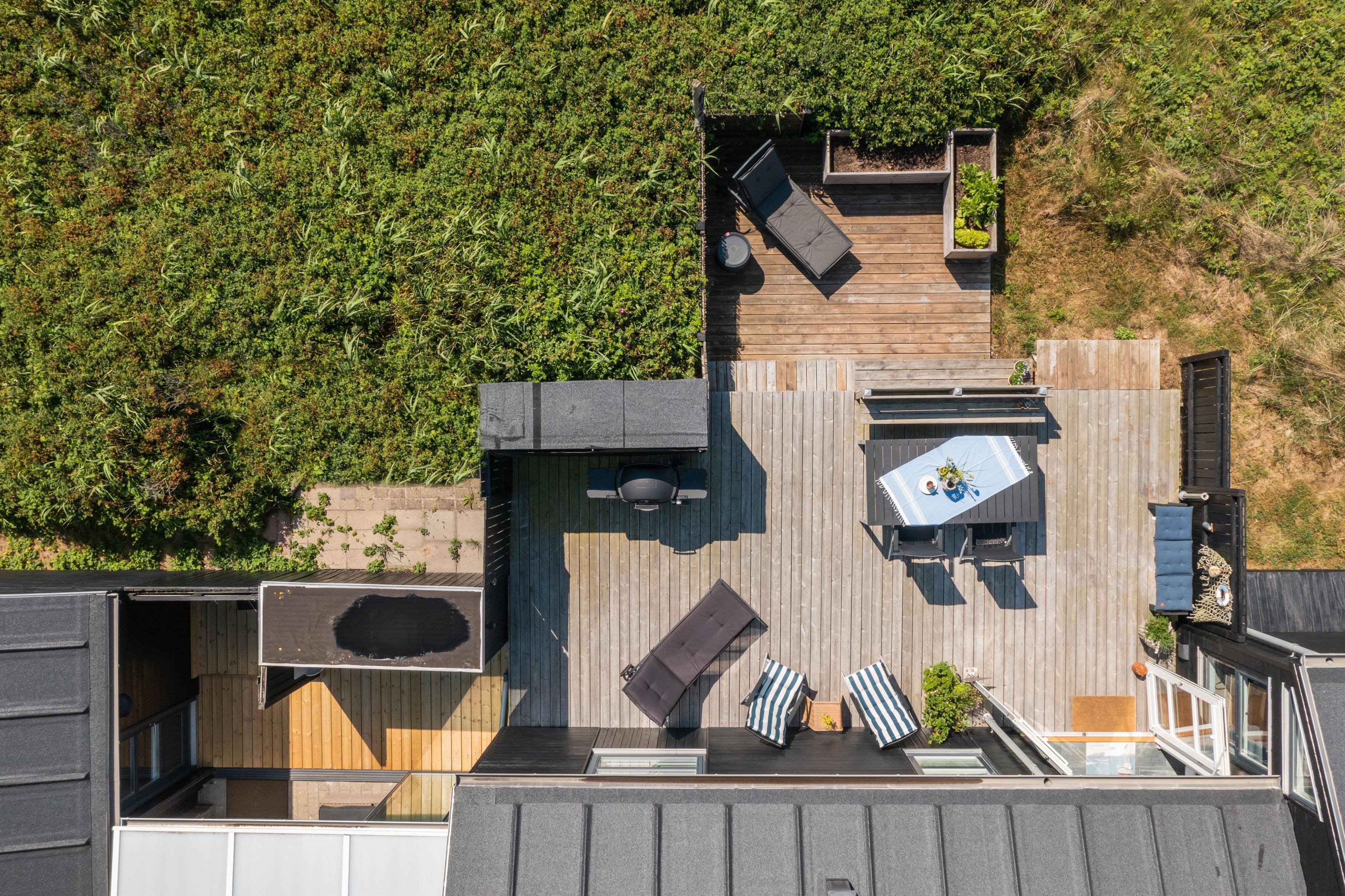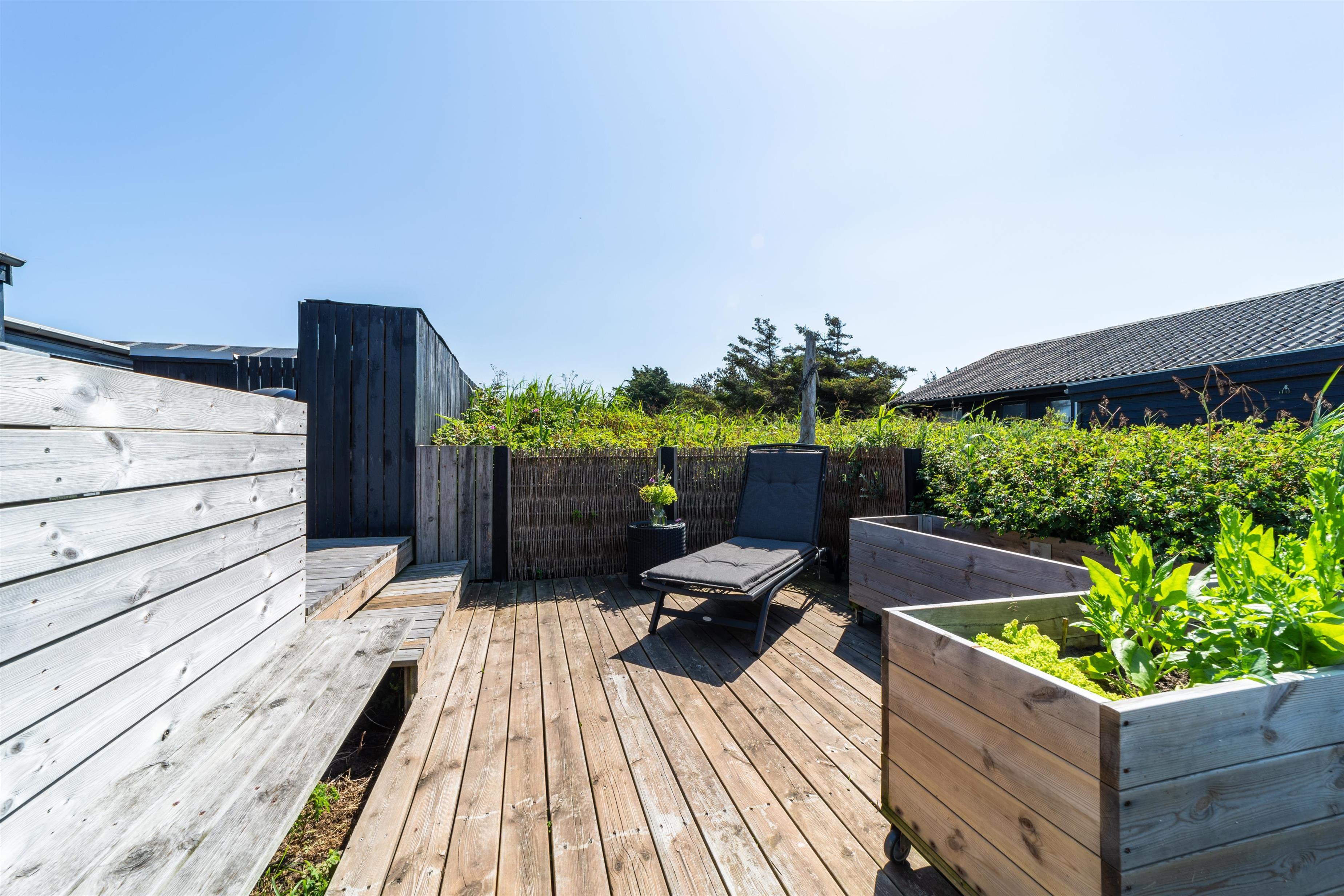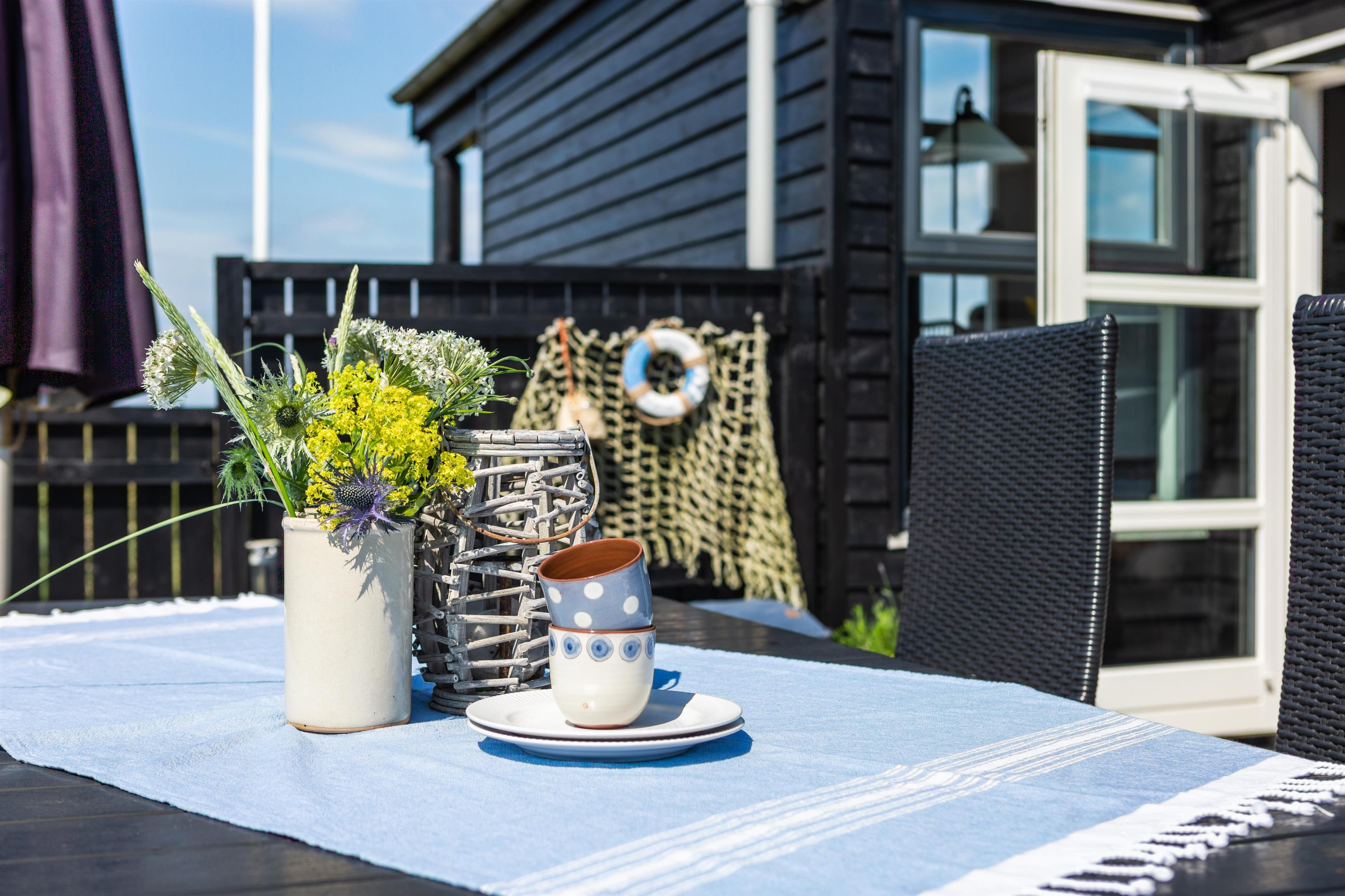 Das Ferienhaus ist von mehreren schönen Terrassen umgeben, die ideale Bedingungen für entspannende Stunden im Freien bieten. Die geschützten Ecken ermöglichen es, Mahlzeiten und gemütliche Momente bei jedem Wetter zu genießen. Machen Sie es sich zum Beispiel in einem Liegestuhl mit einem guten Buch und einer Tasse Kaffee bequem und genießen Sie gleichzeitig den schönen Blick auf die Nordsee. Eine überdachte, gemütliche Terrasse bietet zusätzlichen Komfort, egal ob Sie Schatten suchen oder vor den kleinen Sommerregenschauern geschützt sein möchten.