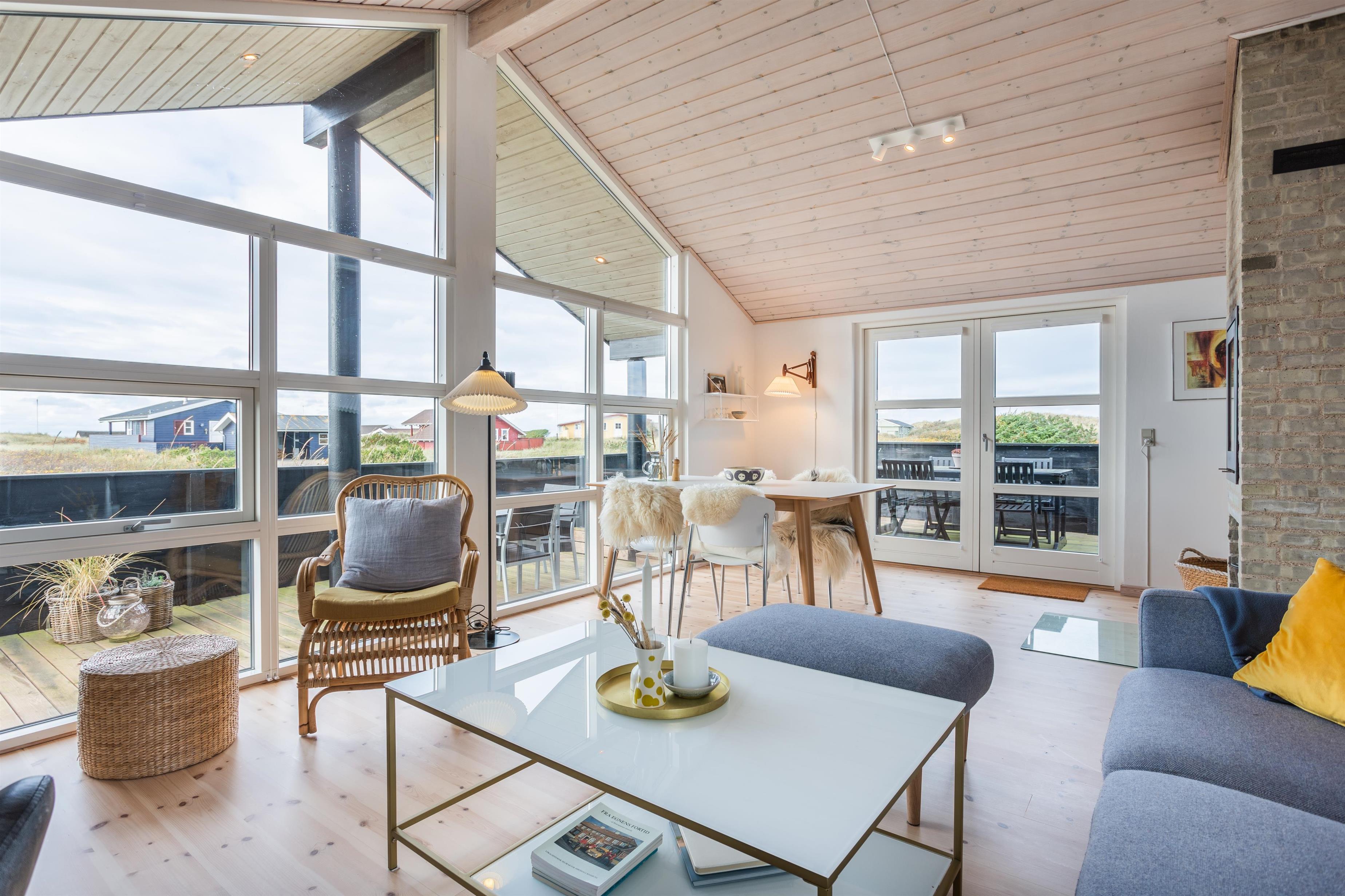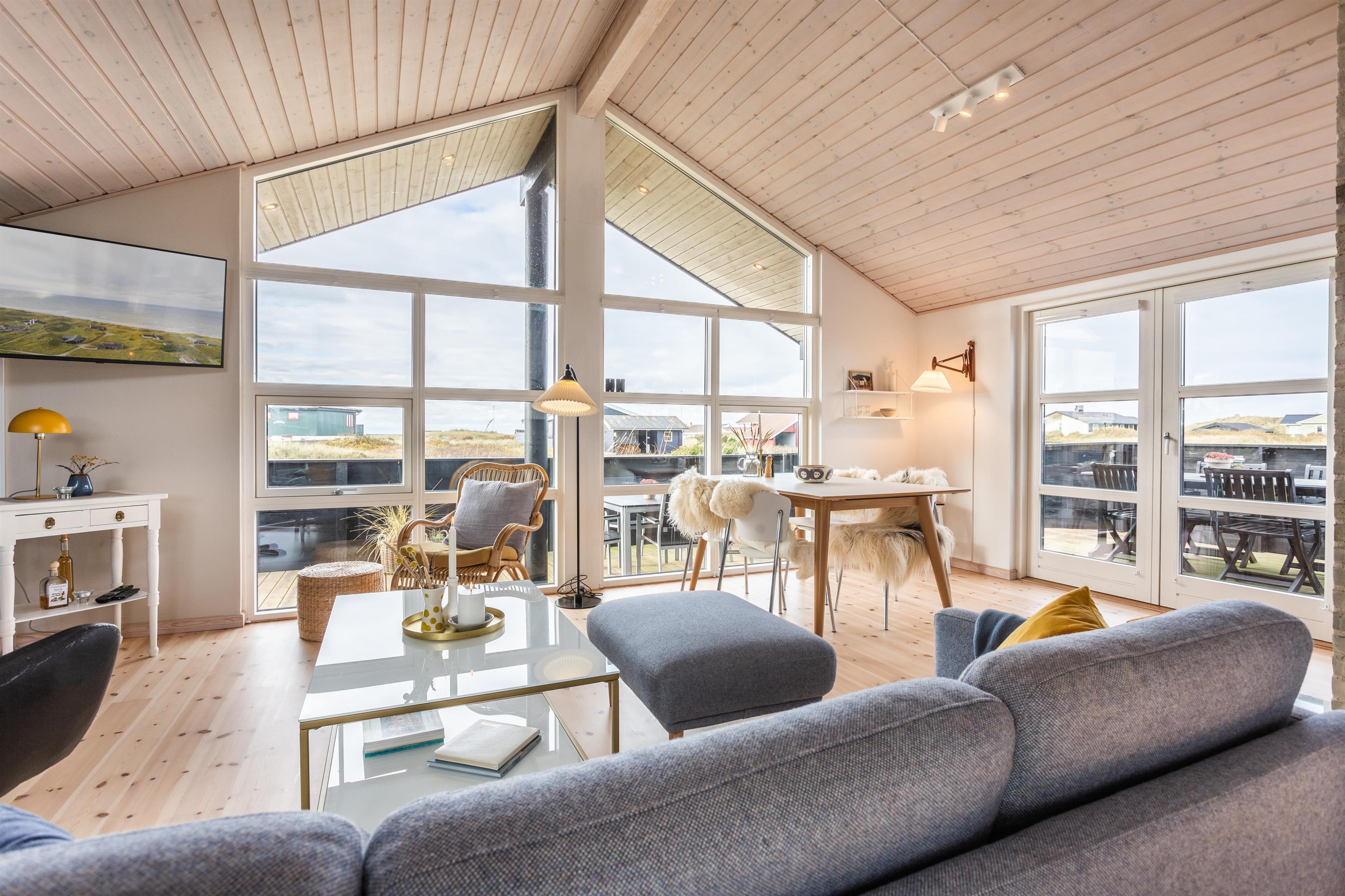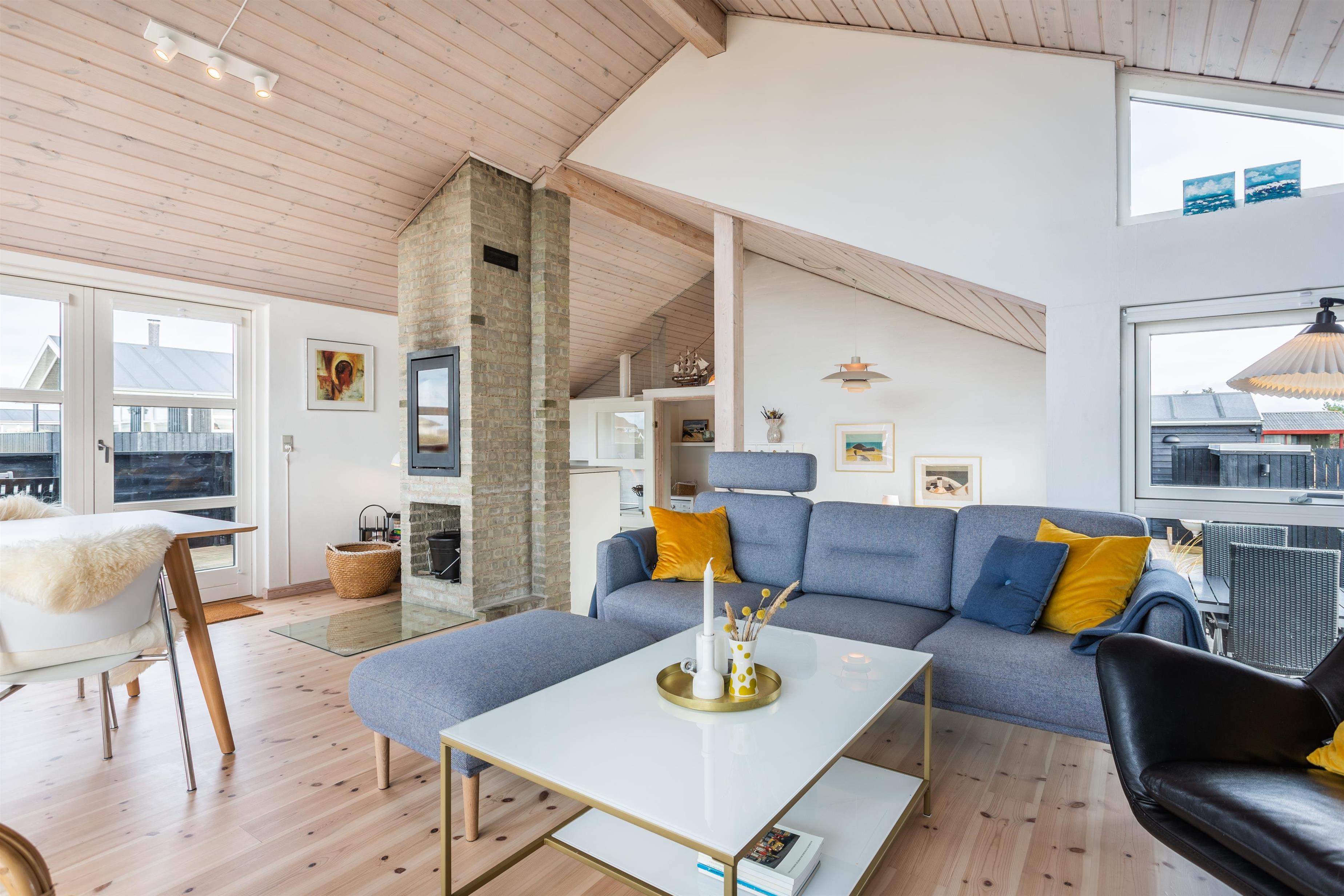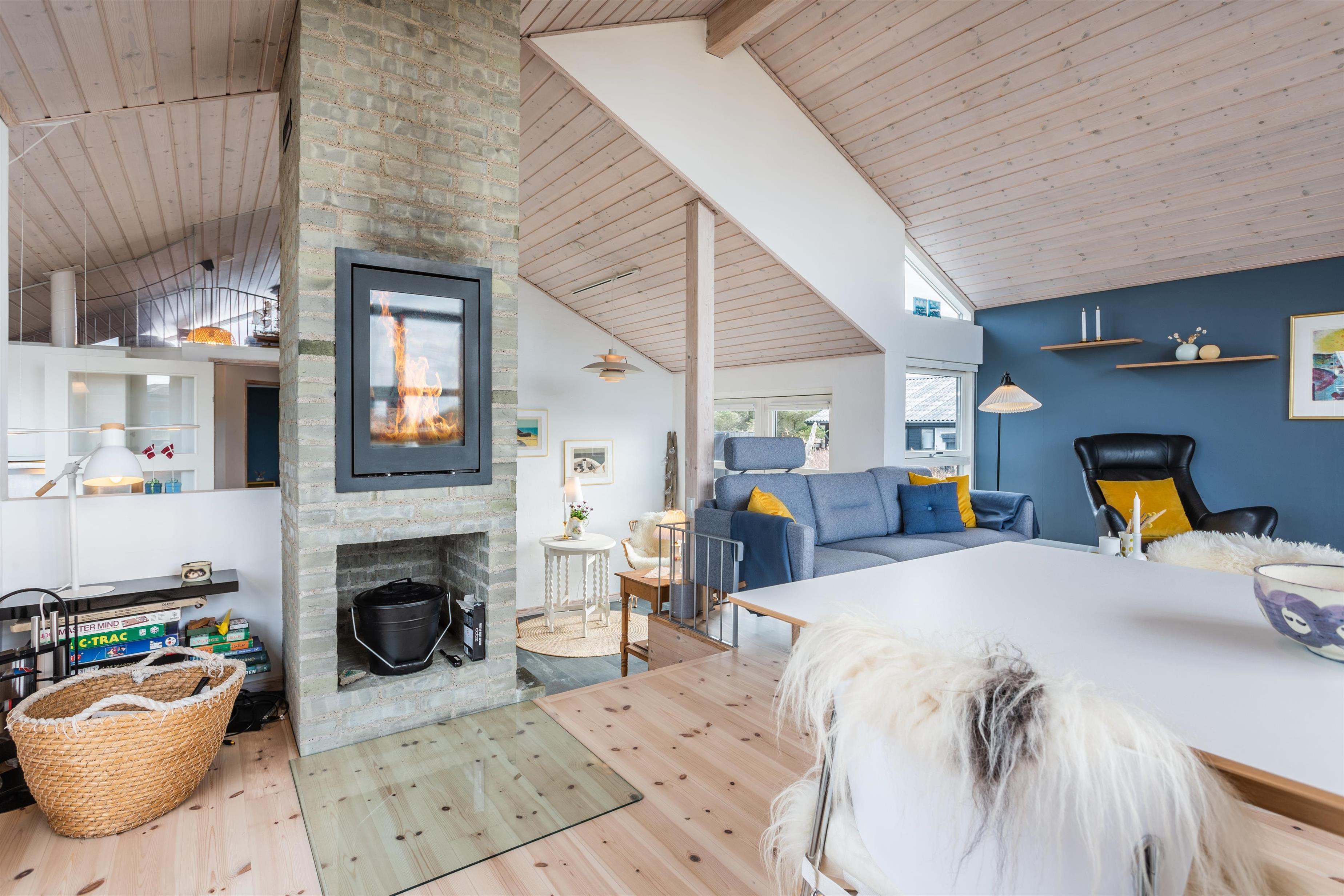 Dieses Ferienhaus wurde mit Fokus auf Licht und Weite entworfen. Die Dachschrägen und großen Fensterflächen lassen Natur und Licht herein, während der offene Grundriss eine angenehme Atmosphäre schafft. Das Haus verfügt über eine gut ausgestattete Küche in offener Verbindung mit dem Essbereich und dem Wohnzimmer. Hier können Sie zusammen essen, spielen oder sich an kühlen Abenden vor dem Kamin gemütlich machen.