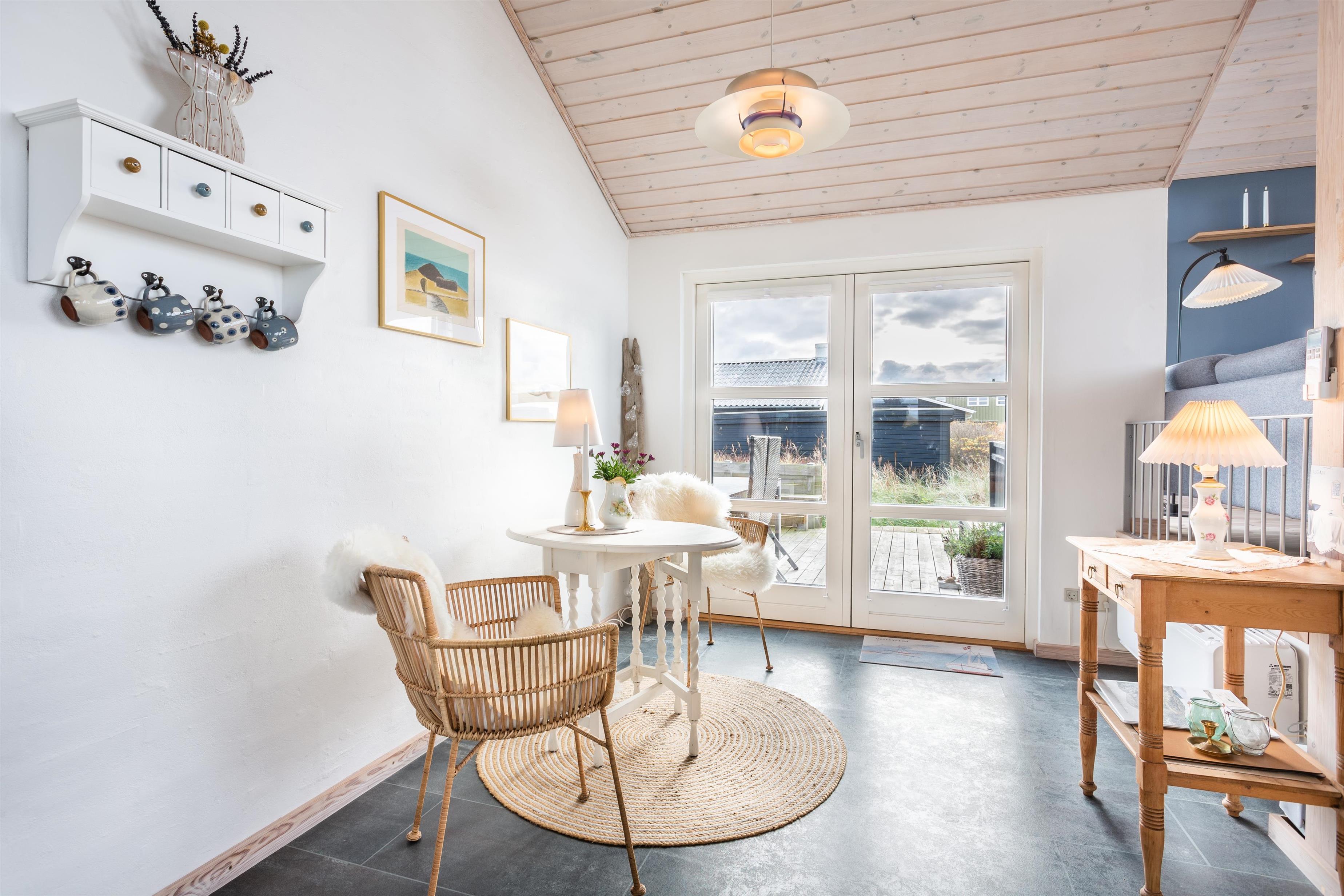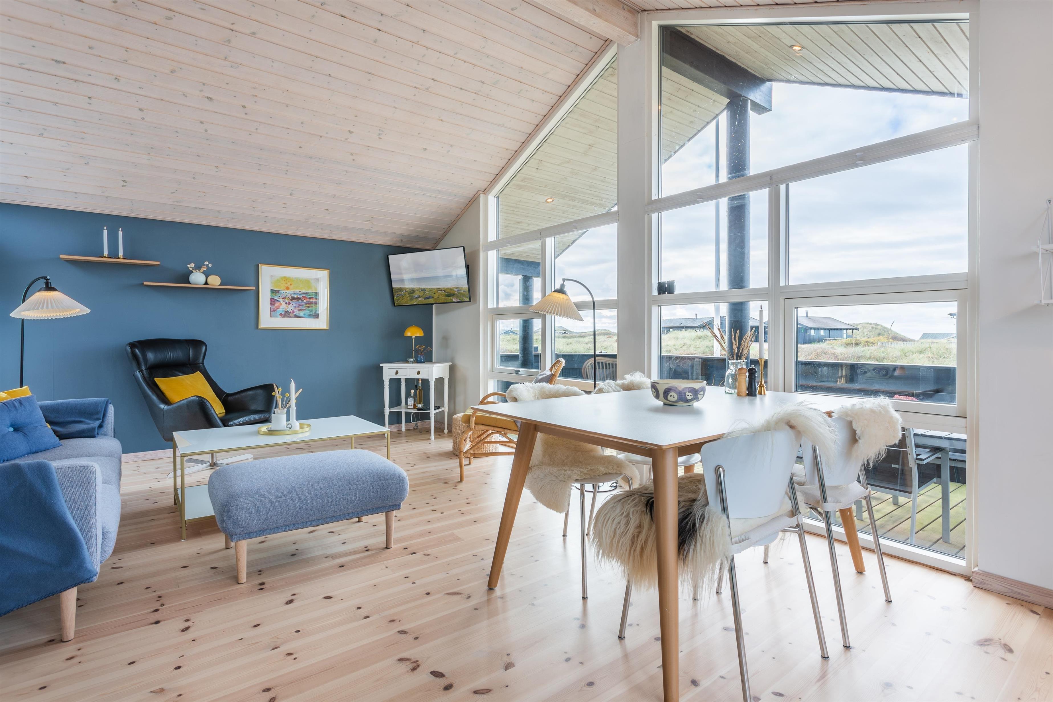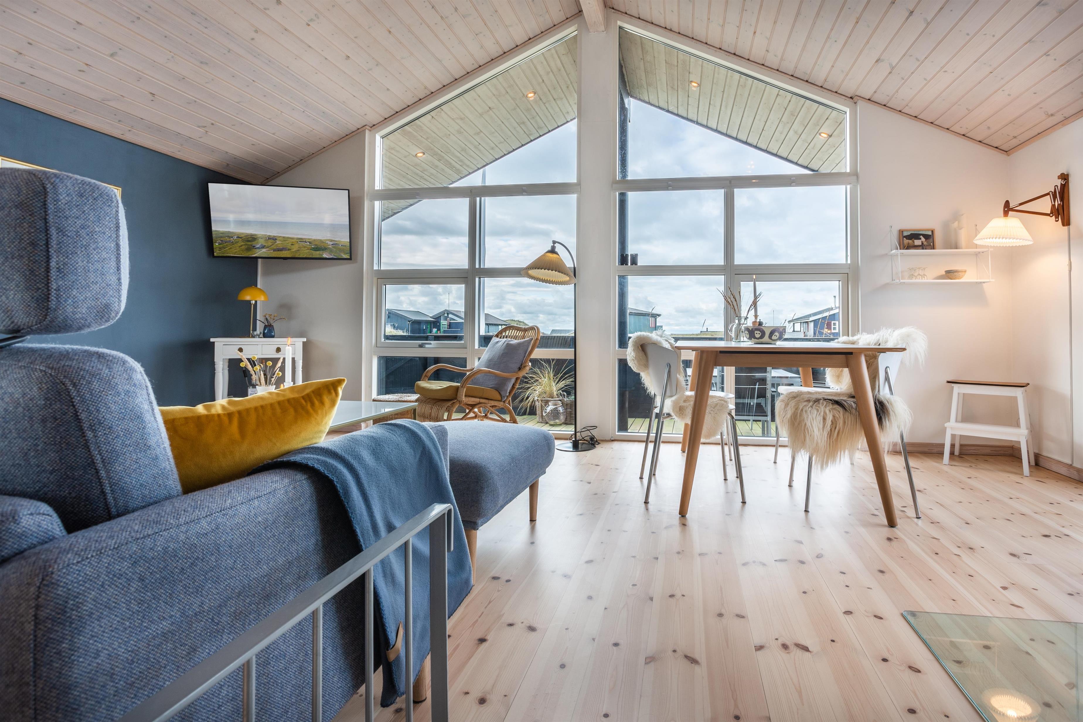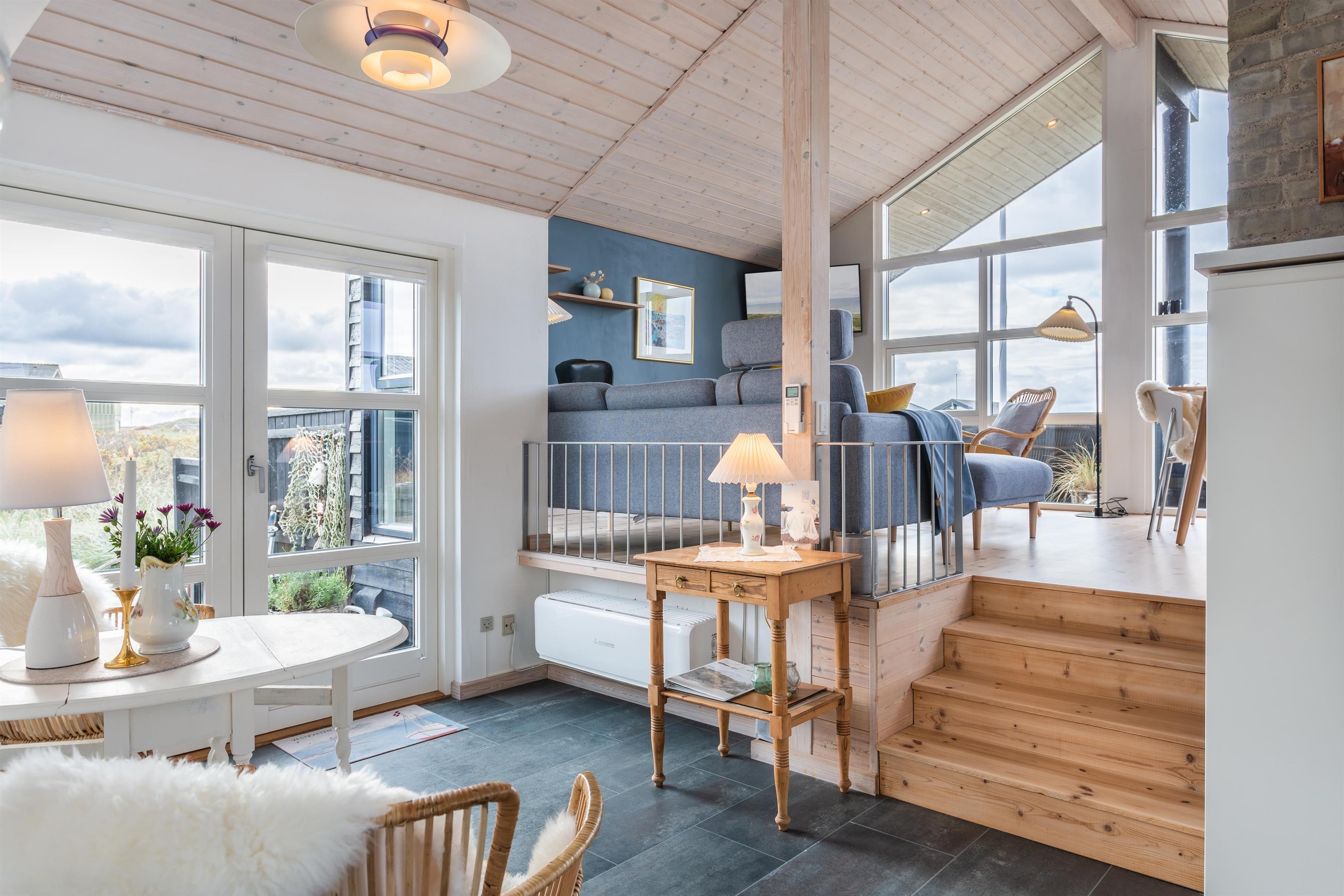 Dieses Ferienhaus wurde mit Fokus auf Licht und Weite entworfen. Die Dachschrägen und großen Fensterflächen lassen Natur und Licht herein, während der offene Grundriss eine angenehme Atmosphäre schafft. Das Haus verfügt über eine gut ausgestattete Küche in offener Verbindung mit dem Essbereich und dem Wohnzimmer. Hier können Sie zusammen essen, spielen oder sich an kühlen Abenden vor dem Kamin gemütlich machen.