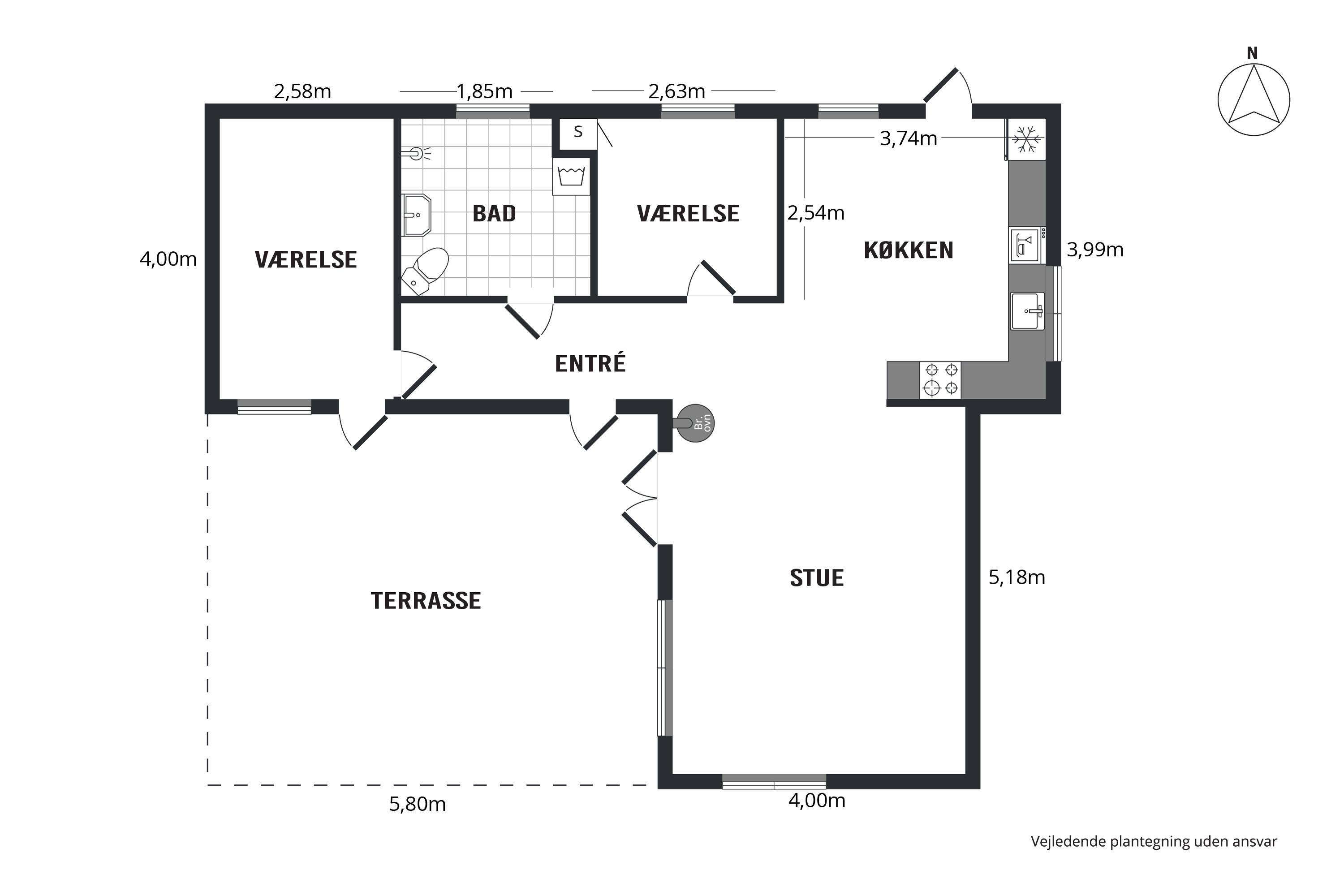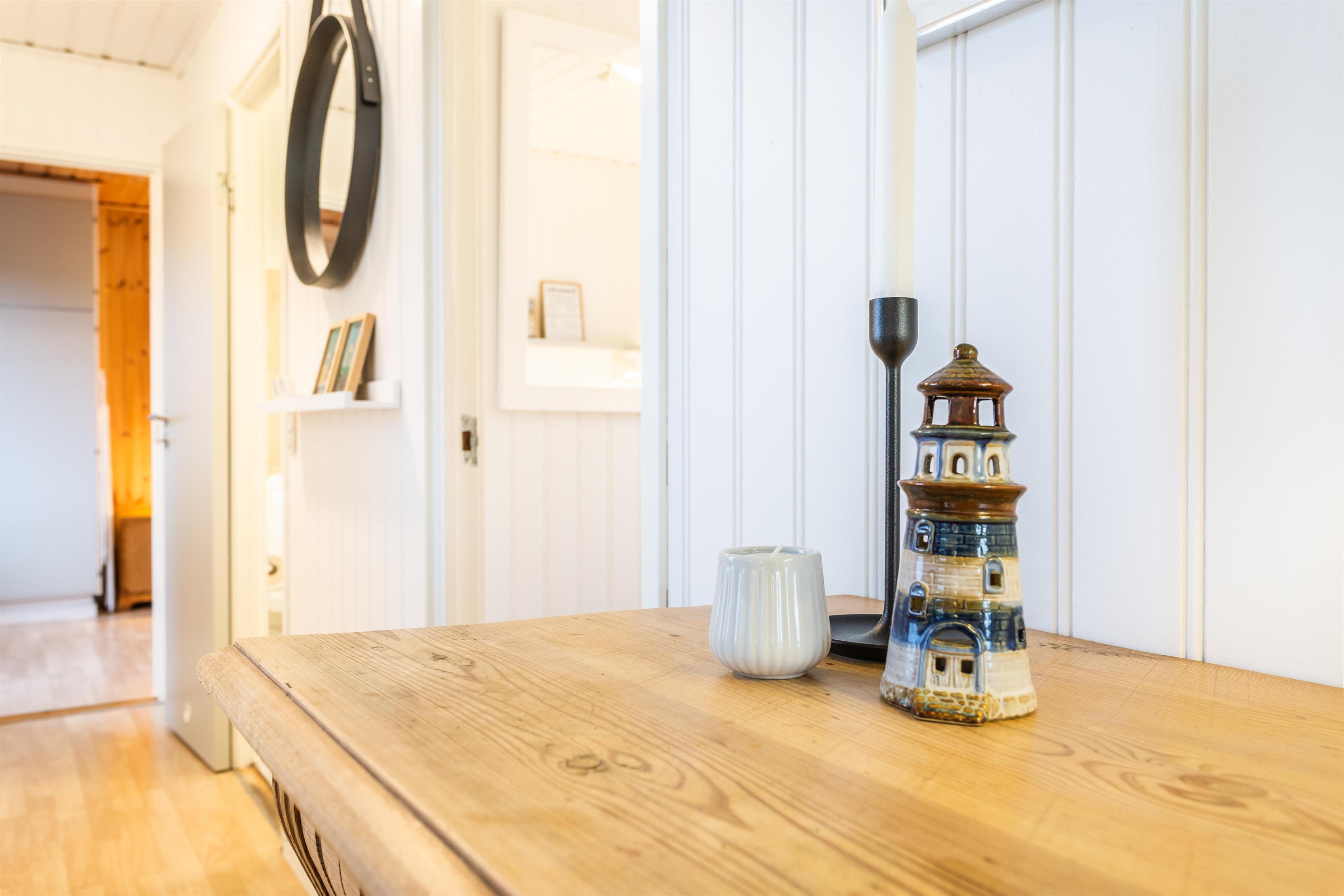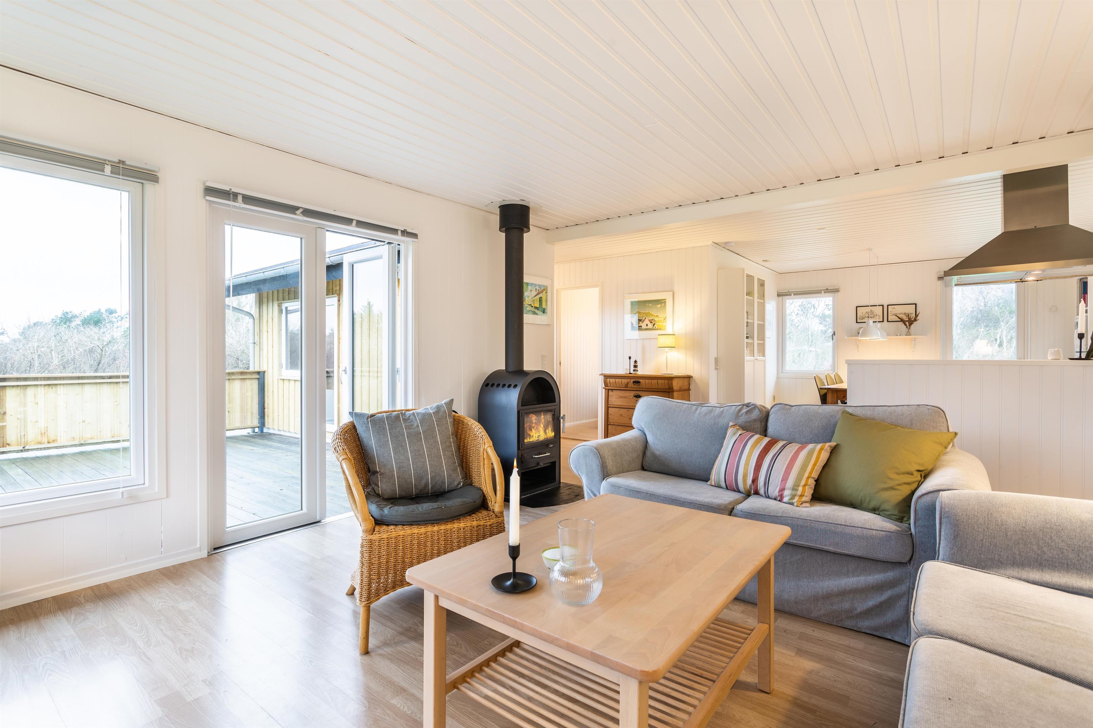 Das Ferienhaus ist sowohl außen als auch innen hell und gut gepflegt. Das Haus ist mit zwei schönen Schlafzimmern, einem schönen Badezimmer und einer großen, hellen Küche in offener Verbindung mit dem Wohnzimmer ausgestattet. Im offenen Wohnbereich finden Sie sowohl einen Essbereich als auch eine gemütliche TV-Ecke mit Sofa. An kühlen Abenden können Sie den Kamin im Haus anzünden und die Wärme genießen, während Sie zusammen entspannen. Das Sommerhaus ist mit guten Möbeln und einer gut ausgestatteten Küche mit allen notwendigen Geräten eingerichtet.