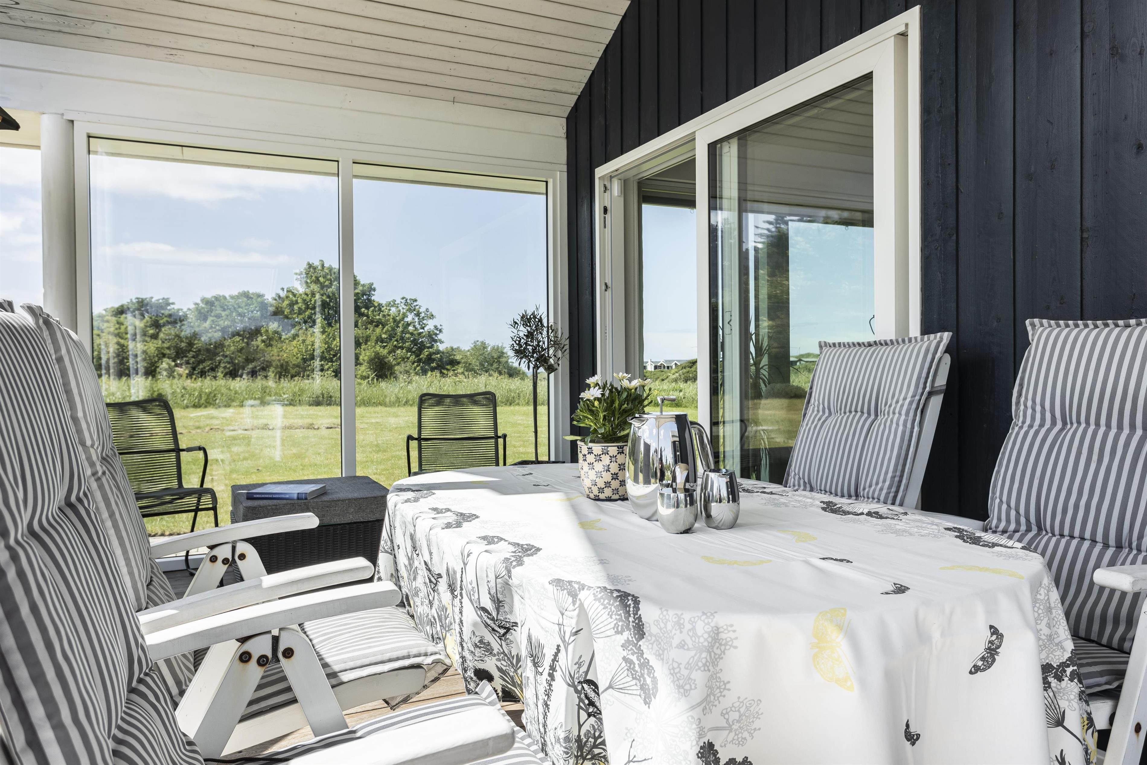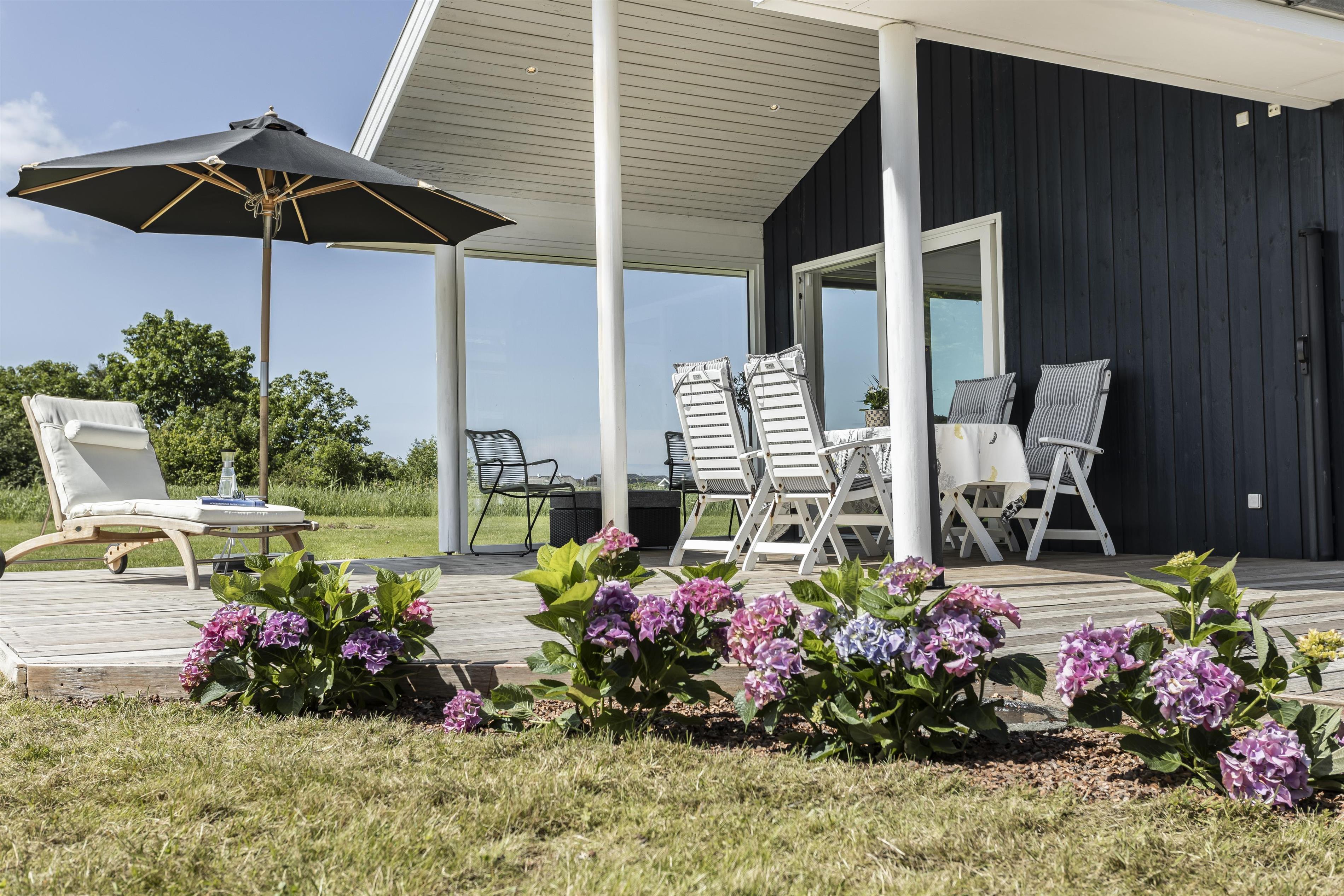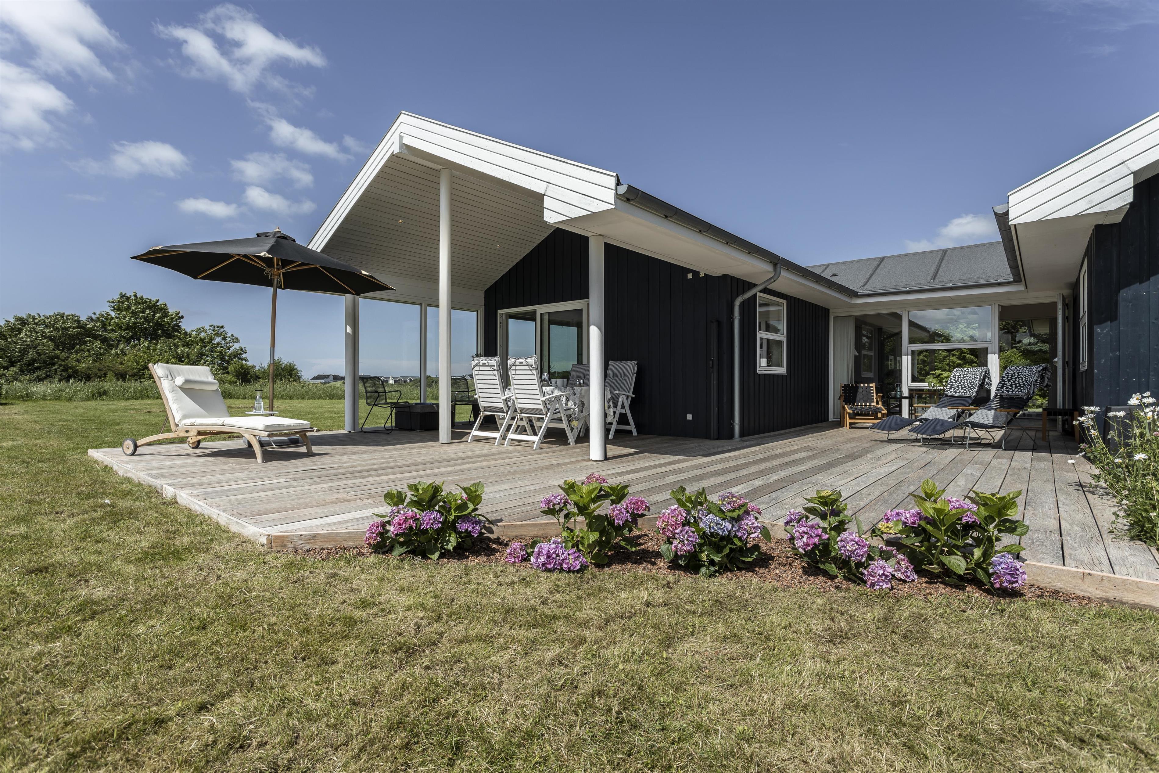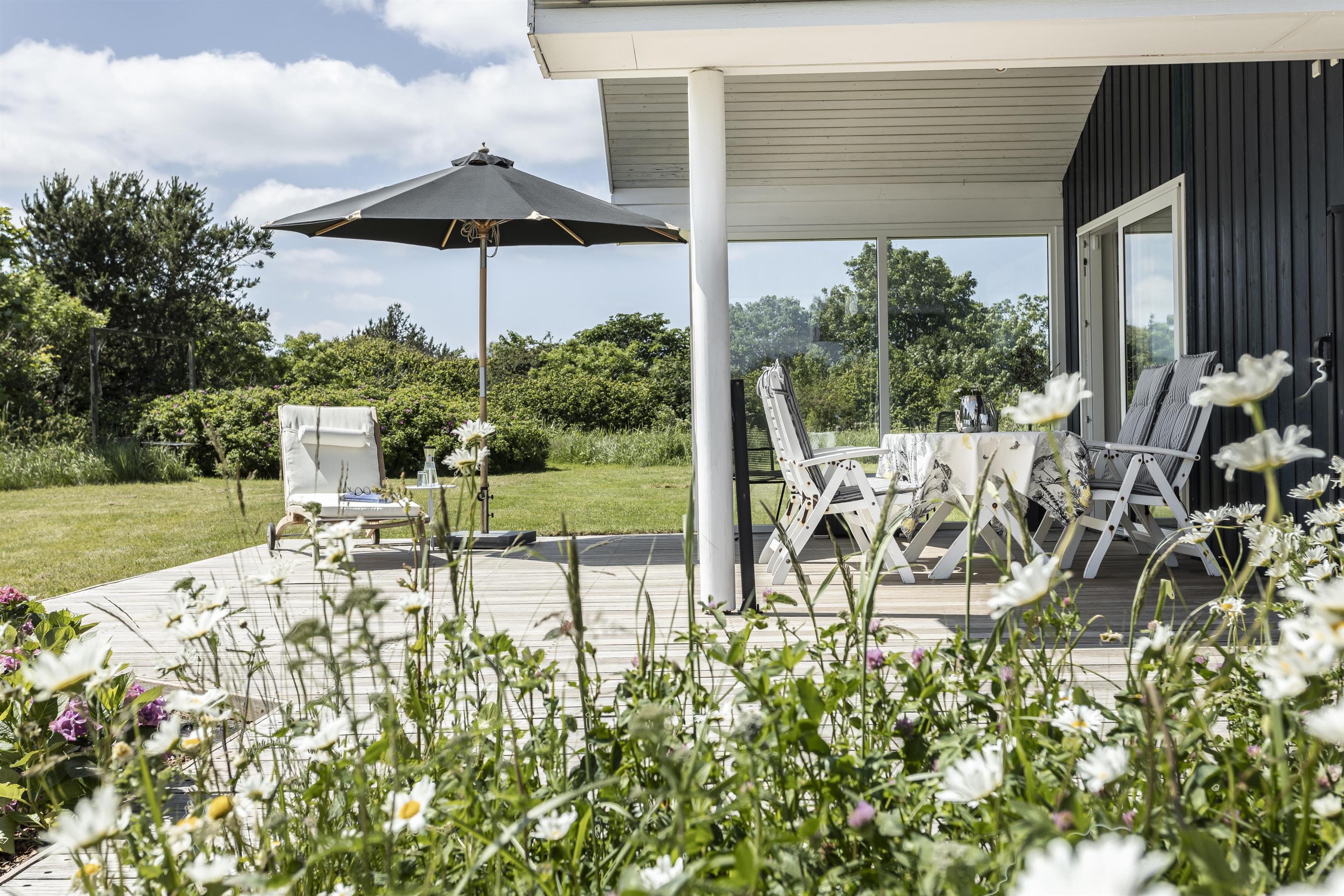 Das Ferienhaus ist von wunderschönen Terrassen umgeben, auf denen Sie den ganzen Tag die Sonne genießen und in Ruhe entspannen können. Genießen Sie Ihren Morgenkaffee in der frischen Meeresluft oder versammeln Sie die Familie für gemütliche Mahlzeiten auf der überdachten Terrasse – perfekt, wenn die Sonne einmal zu stark wird. Das Naturgrundstück vor dem Haus ist mit wilder Vegetation bewachsen und bietet einen beeindruckenden Blick auf die Umgebung und die Nordsee.