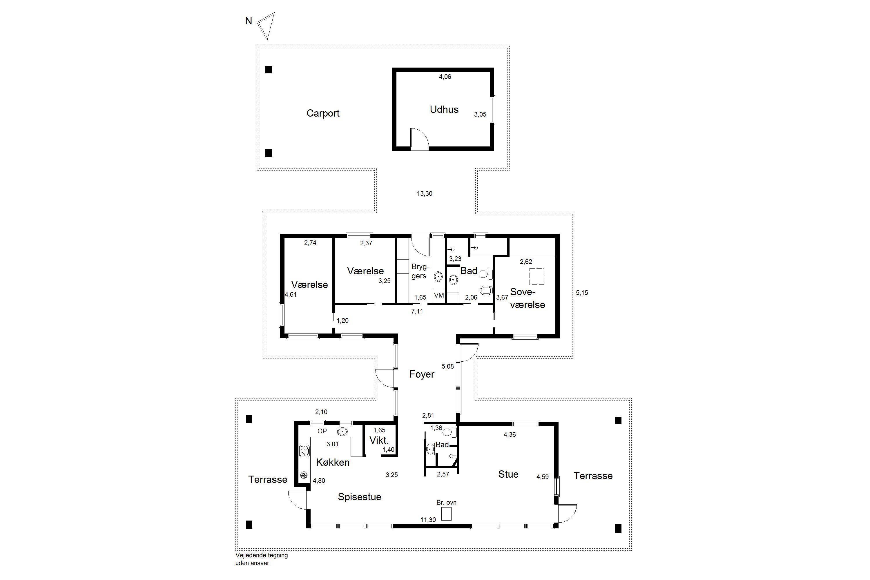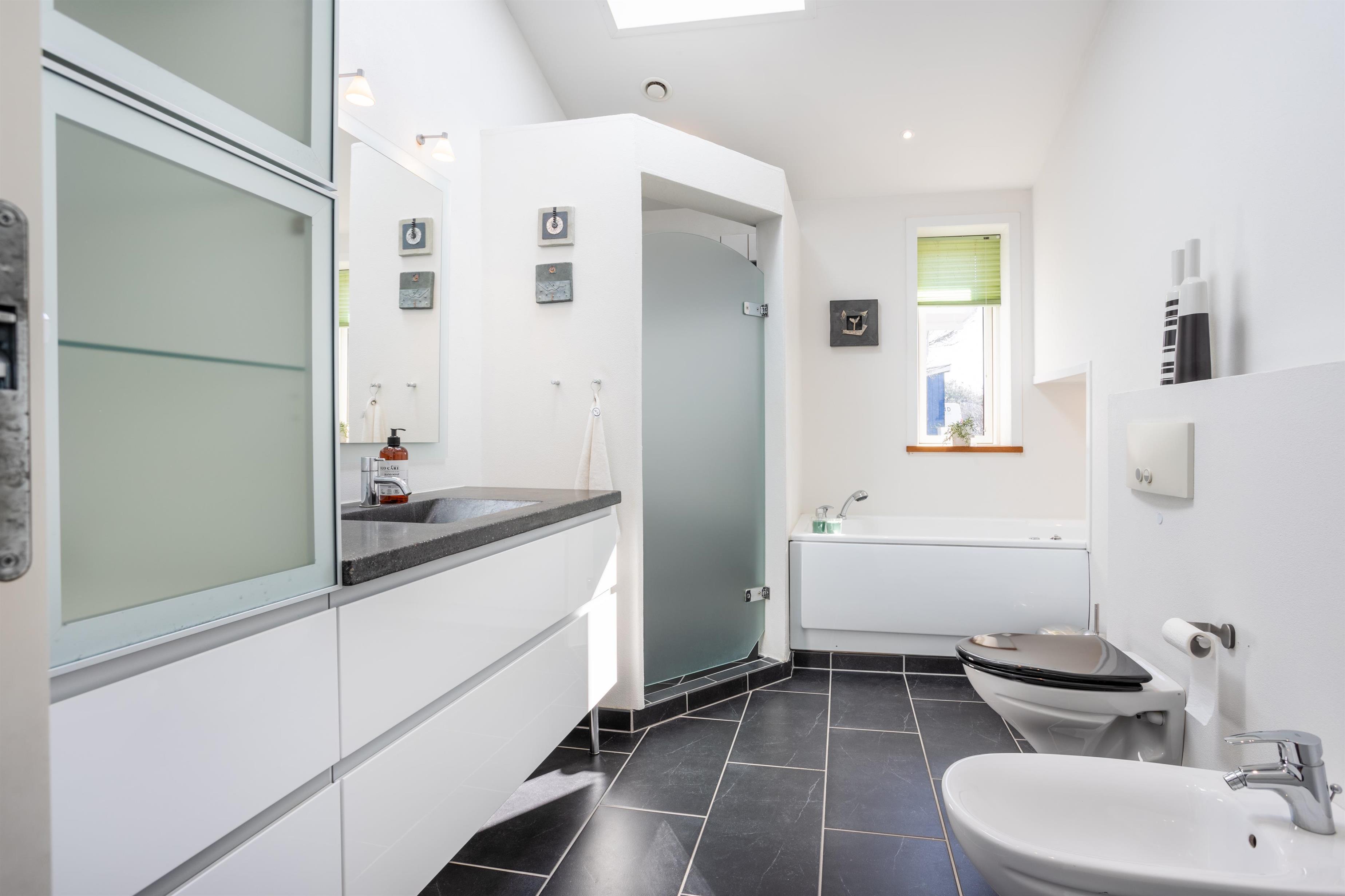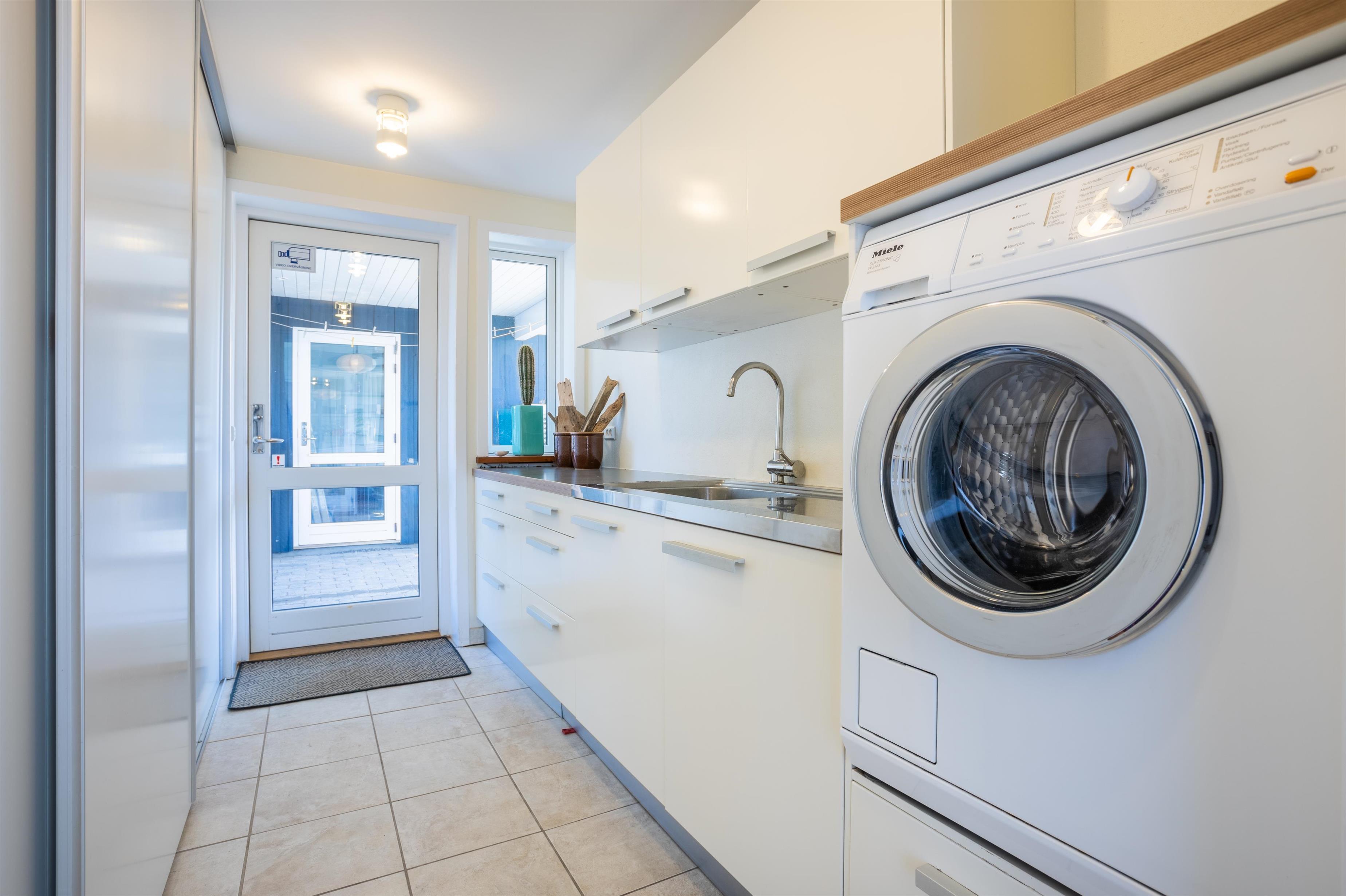 Das Haus verfügt über drei geräumige Schlafzimmer mit Schränken sowie zwei moderne Badezimmer – eines davon mit einer Badewanne, die nach einem Tag am Strand zu entspannenden Momenten einlädt. Ein praktischer Hauswirtschaftsraum mit Stauraum und Waschmaschine sorgt für zusätzlichen Komfort. Das Haus wird durch eine Wärmepumpe und einen Kamin beheizt.