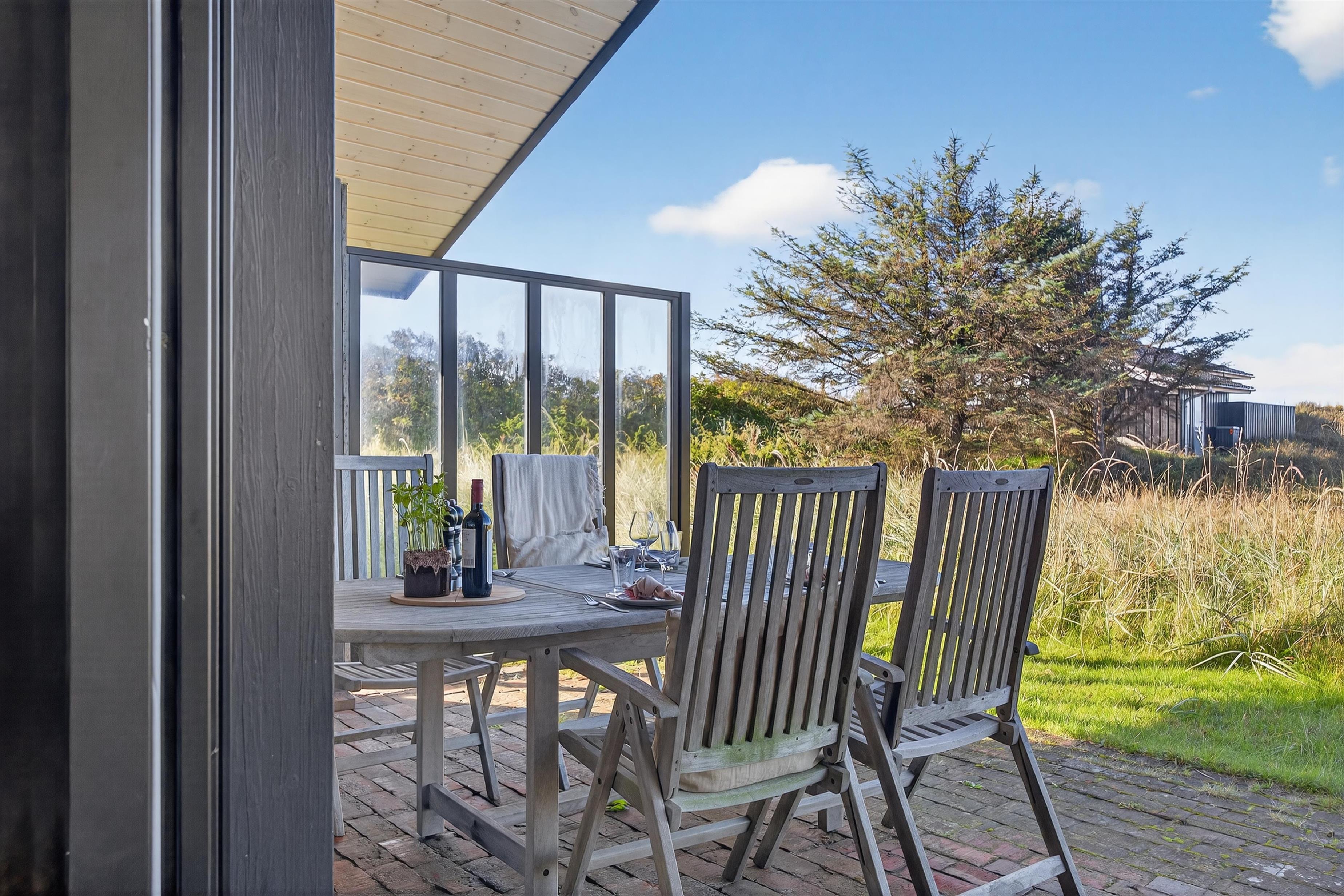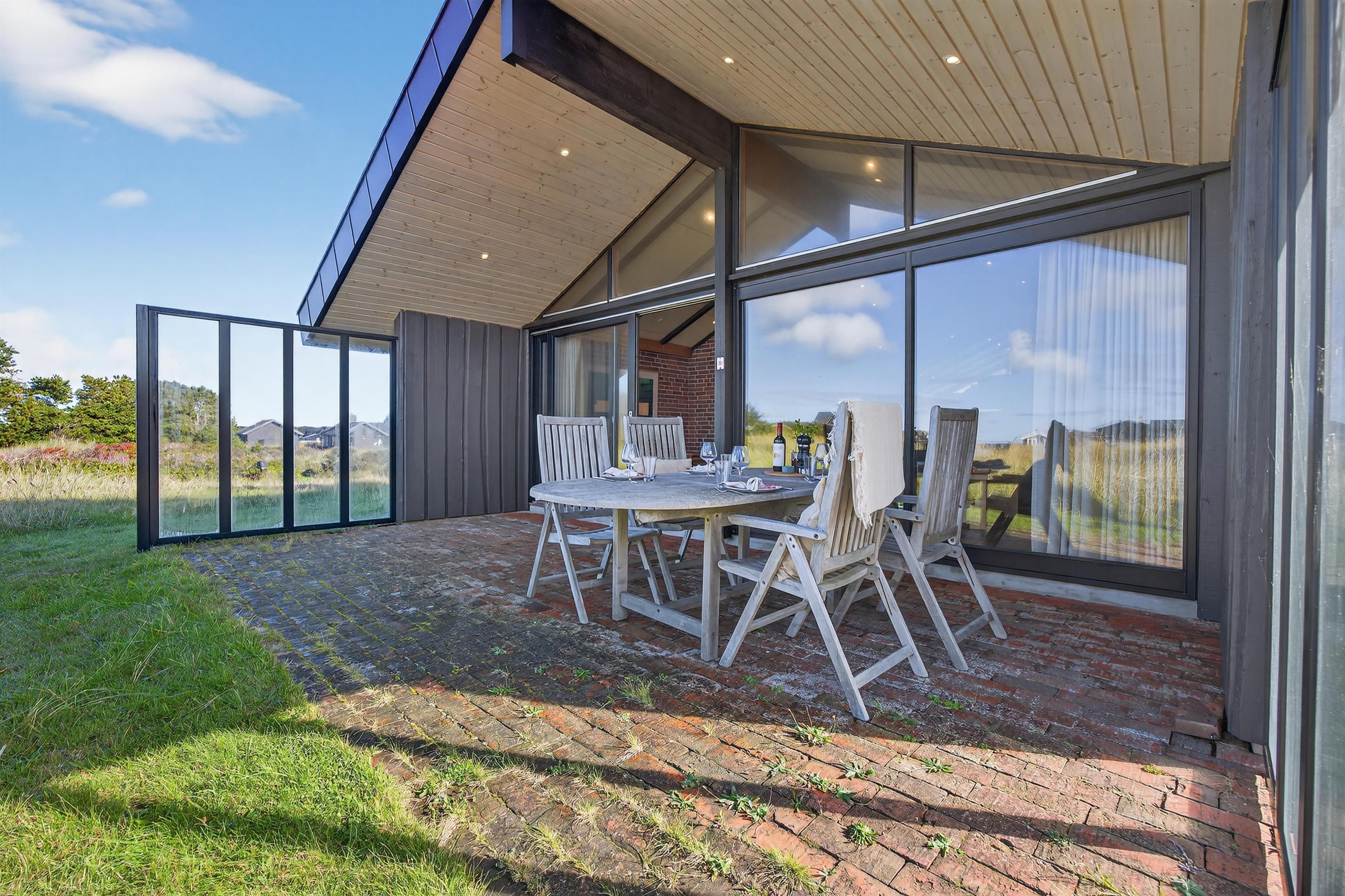 Rund um das Haus befinden sich mehrere sonnige und windgeschützte Terrassen, auf denen Sie die frische Luft und den schönen Ausblick genießen können. Die überdachte Terrasse ist ideal, um das Abendessen zu genießen, während die Sonne über der Nordsee untergeht und den Himmel in den schönsten Farben leuchten lässt. Der Garten bietet eine schöne Rasenfläche – perfekt für Ballspiele und Spaß.