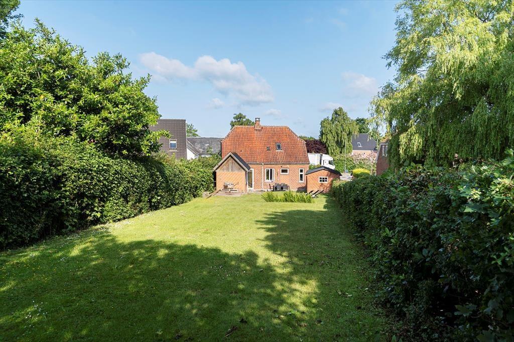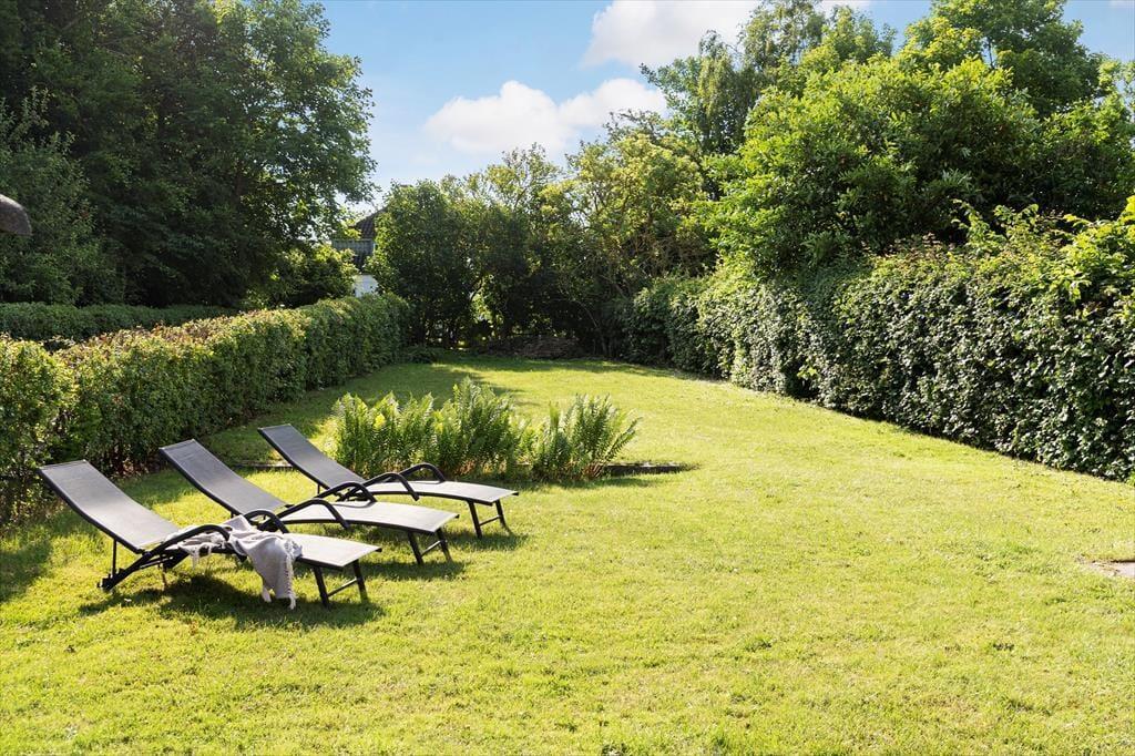Vor dem Haus gibt es Parkmöglichkeiten sowie eine kleine Rasenfläche, die sich hinter dem Haus fortsetzt. Der Garten ist von Bäumen und Hecken umgeben, sodass man ungestört auf dem Rasen liegen oder auf der Terrasse sitzen kann.