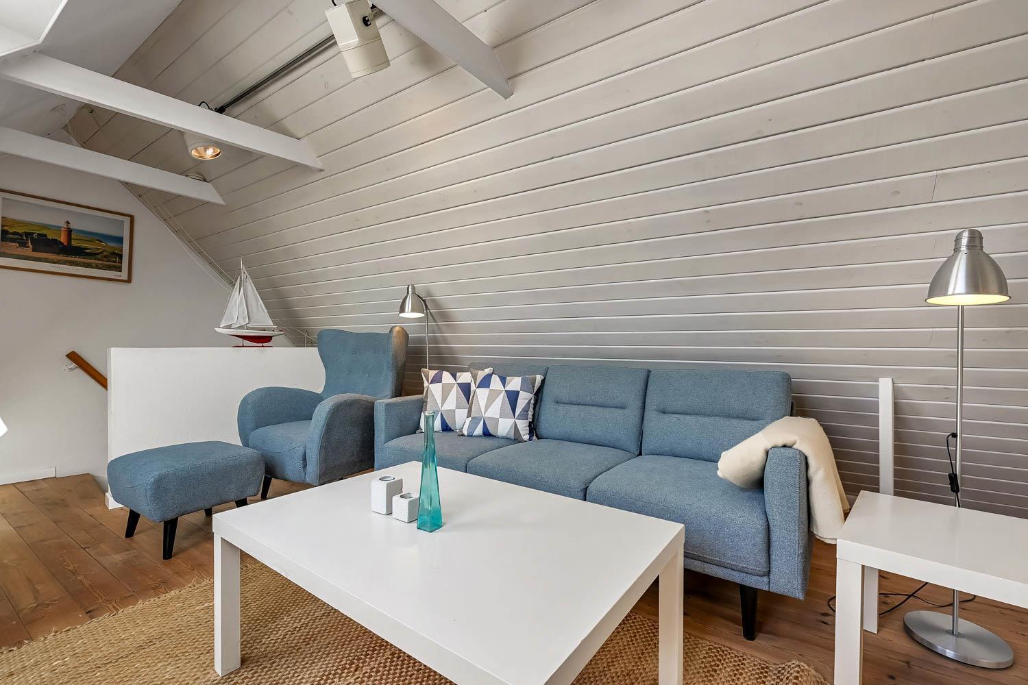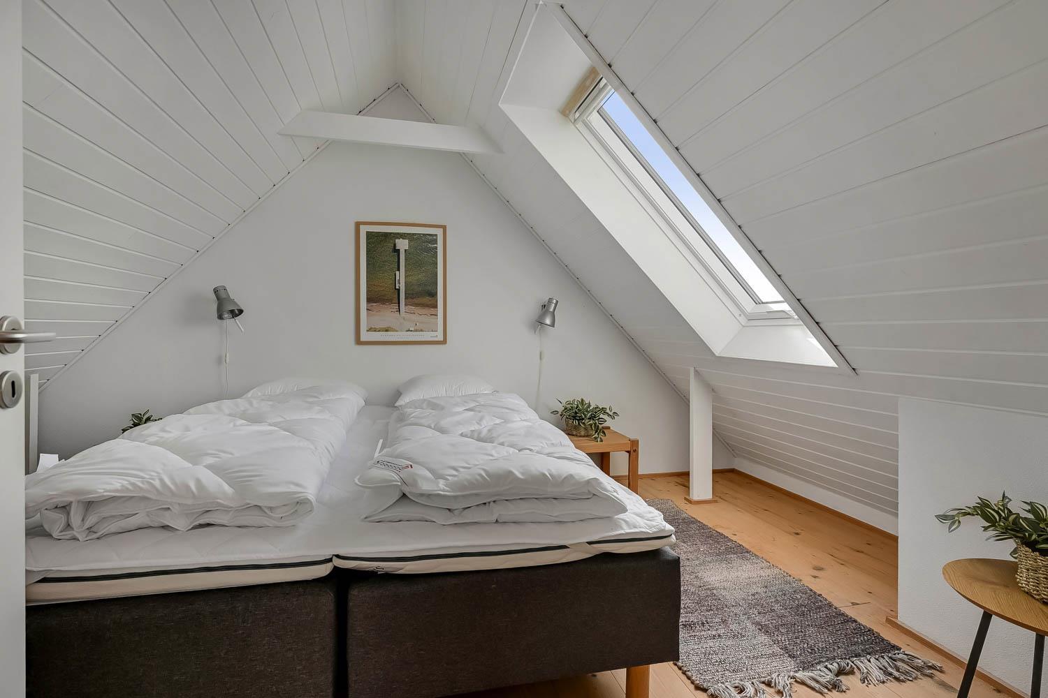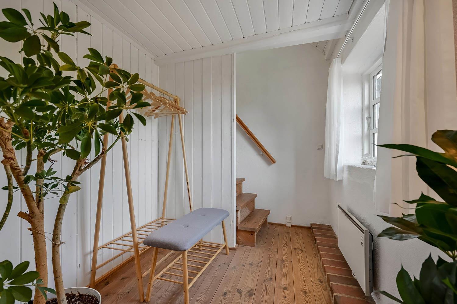 Der Hof liegt in einem ruhigen Gebiet auf einem 9.805 m² großen Naturgrund direkt zum Meer und 1,6 km südlich vom Bovbjerg Leuchtturm. Die Wohnung ist charmant eingerichtet in hellem Stil. Ein Schlafraum mit Doppelbett sowie ein Wohnraum im 1. Stock, beide mit Meerblick. Der Wohnraum verfügt über Stereoanlage mit CD, Farbfernseher mit DVD und Parabol. Im Erdgeschoss: Flur, Badezimmer mit Fußbodenheizung, Sauna und Duschnische. Gästetoilette mit Waschmaschine und Trockner. Esszimmer in offener Verbindung zur gut ausgestatteten Küche mit Ceranfeldherd, Umluftofen, Mikrowelle, Kühlschrank mit Gefrierbox, Geschirrspüler und Kaffeemaschine. Schlafraum mit Doppelbett. Überall in der Wohnung gibts Holz- oder Klinkerboden.