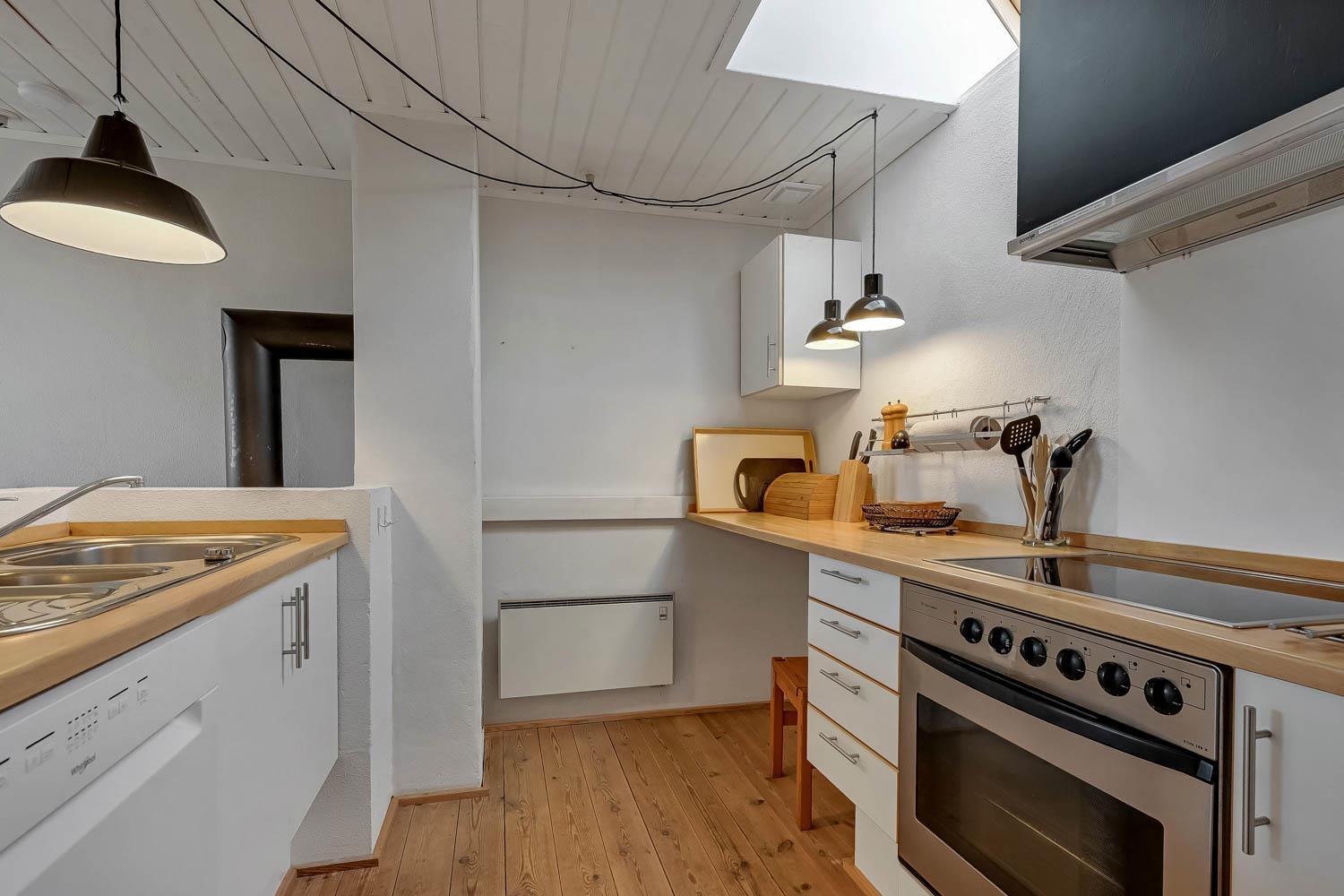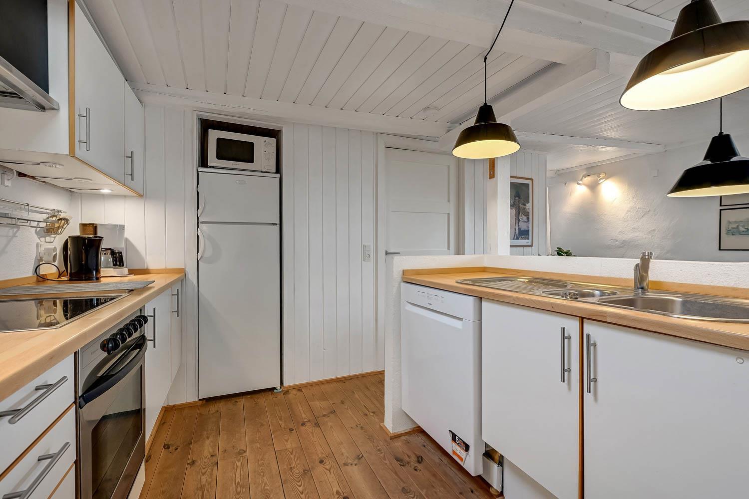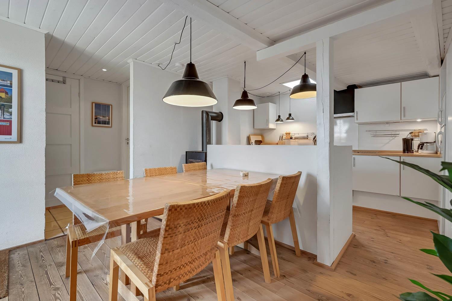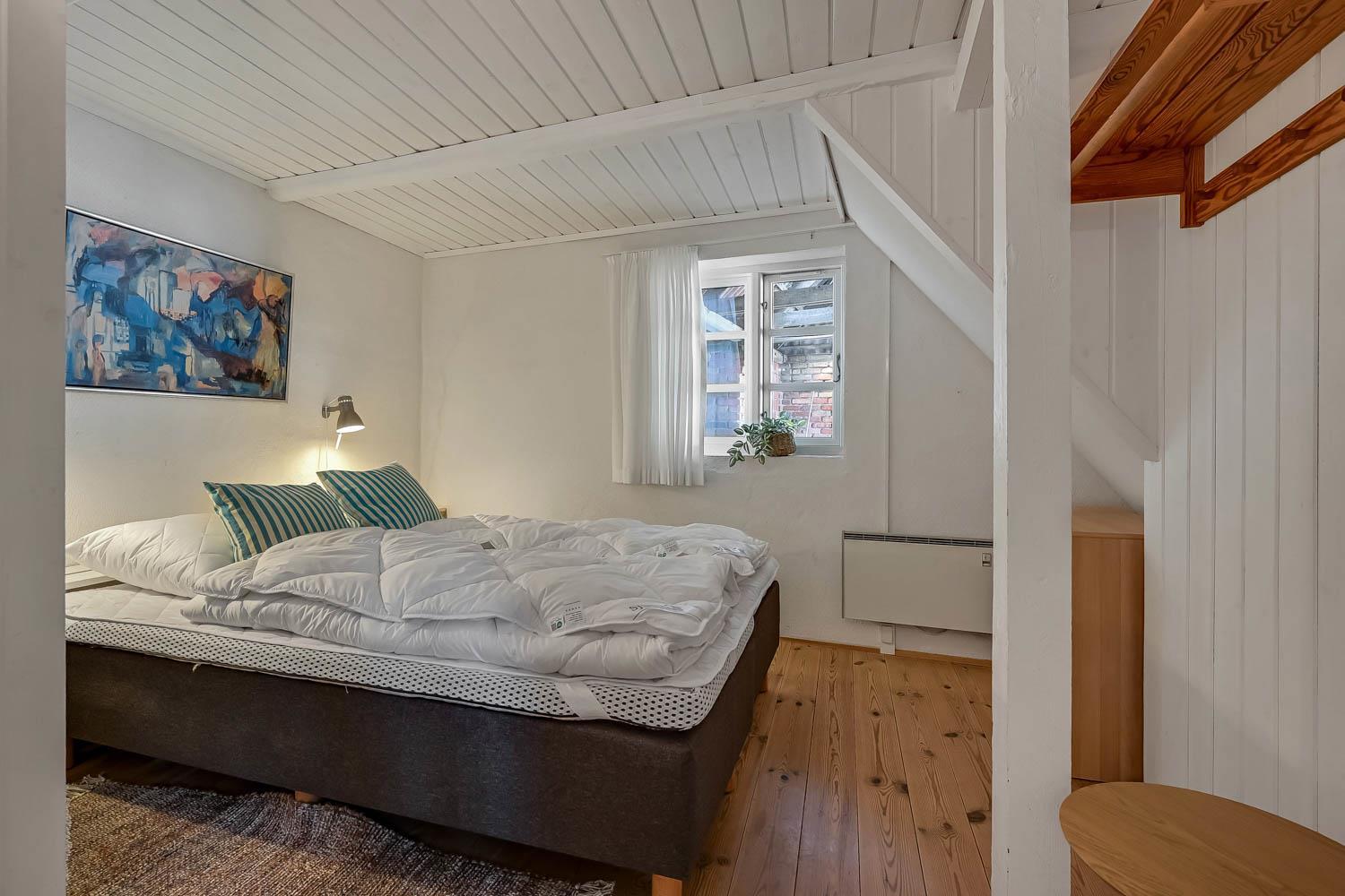 Der Hof liegt in einem ruhigen Gebiet auf einem 9.805 m² großen Naturgrund direkt zum Meer und 1,6 km südlich vom Bovbjerg Leuchtturm. Die Wohnung ist charmant eingerichtet in hellem Stil. Ein Schlafraum mit Doppelbett sowie ein Wohnraum im 1. Stock, beide mit Meerblick. Der Wohnraum verfügt über Stereoanlage mit CD, Farbfernseher mit DVD und Parabol. Im Erdgeschoss: Flur, Badezimmer mit Fußbodenheizung, Sauna und Duschnische. Gästetoilette mit Waschmaschine und Trockner. Esszimmer in offener Verbindung zur gut ausgestatteten Küche mit Ceranfeldherd, Umluftofen, Mikrowelle, Kühlschrank mit Gefrierbox, Geschirrspüler und Kaffeemaschine. Schlafraum mit Doppelbett. Überall in der Wohnung gibts Holz- oder Klinkerboden.