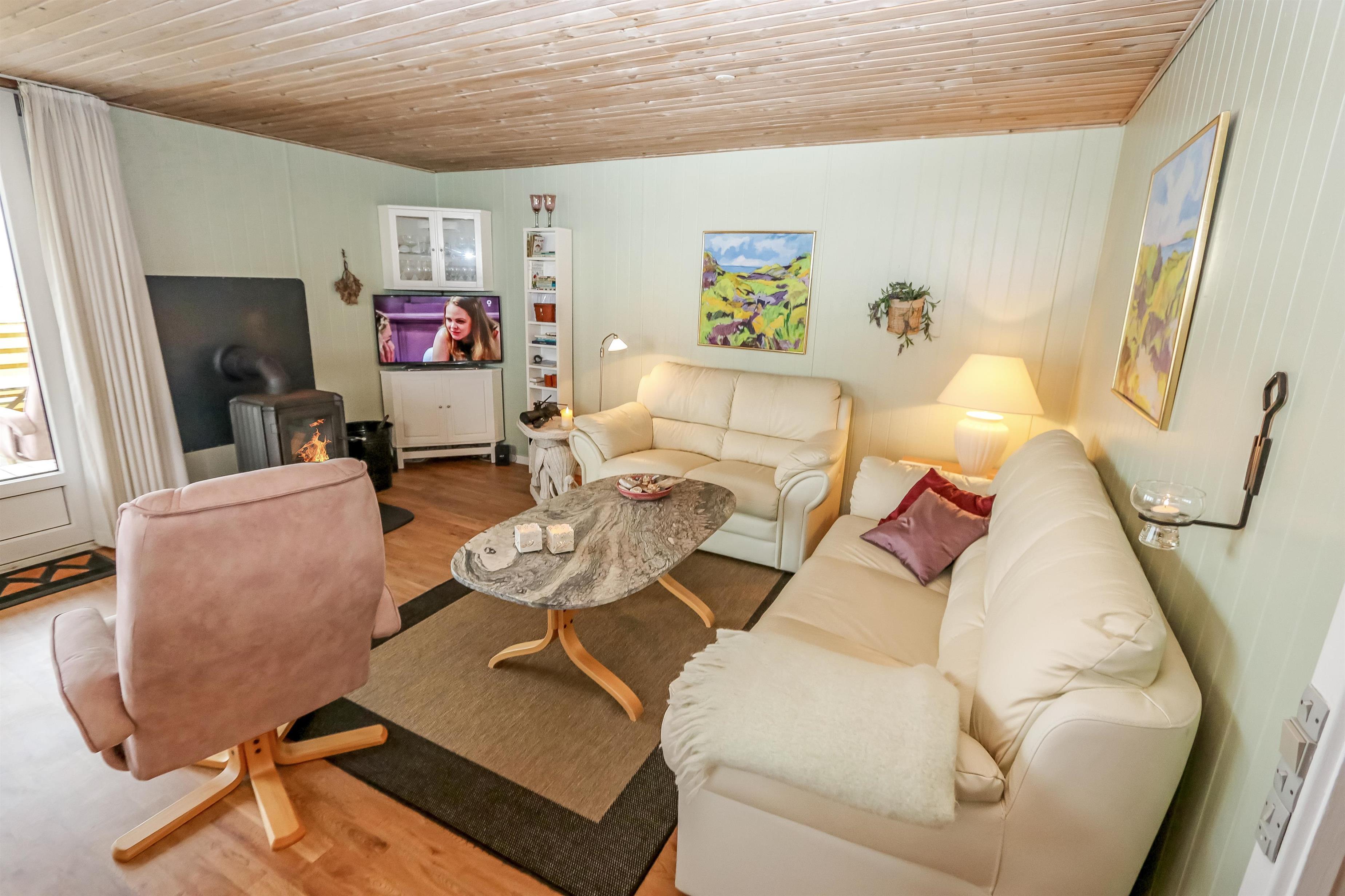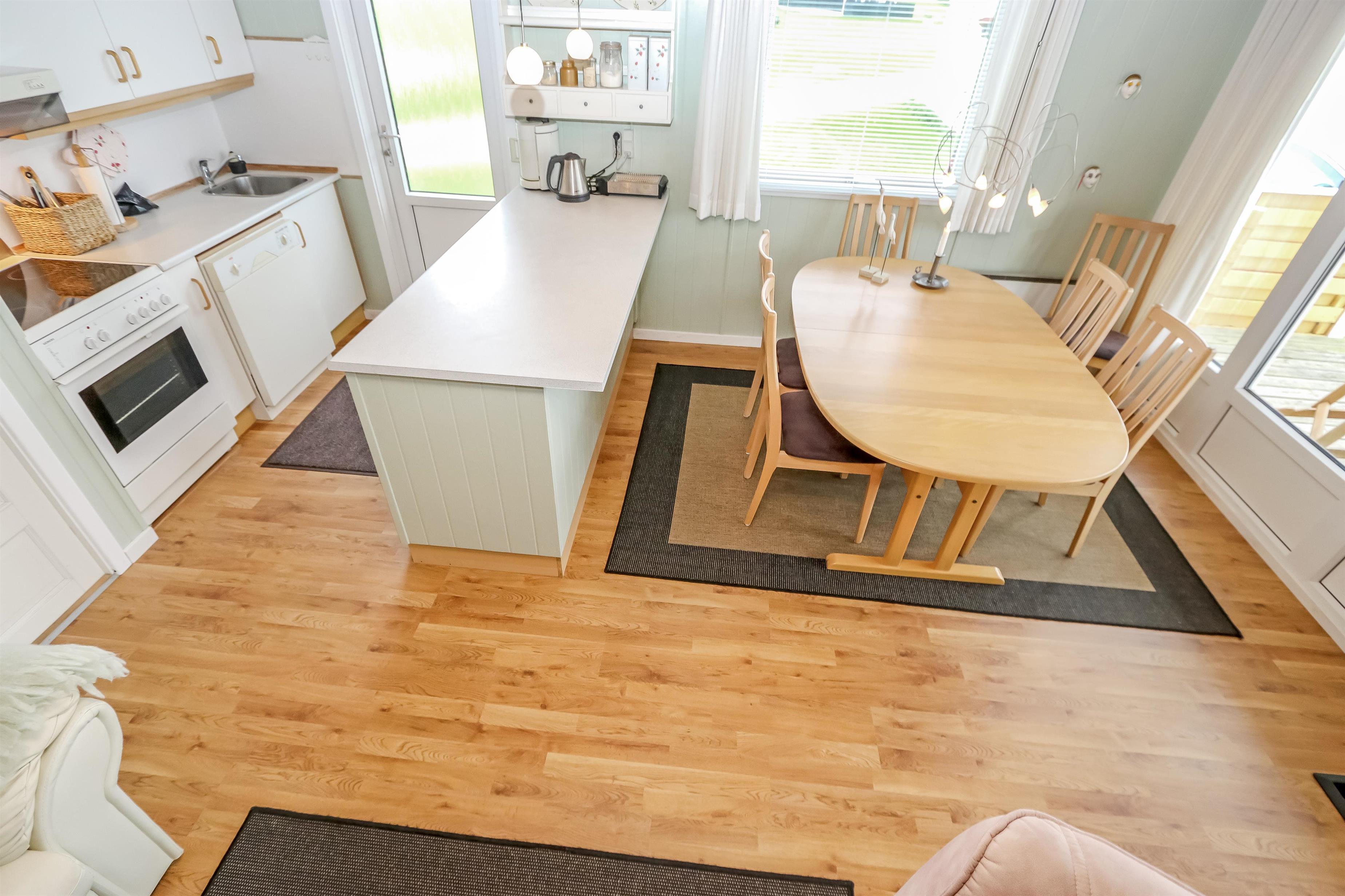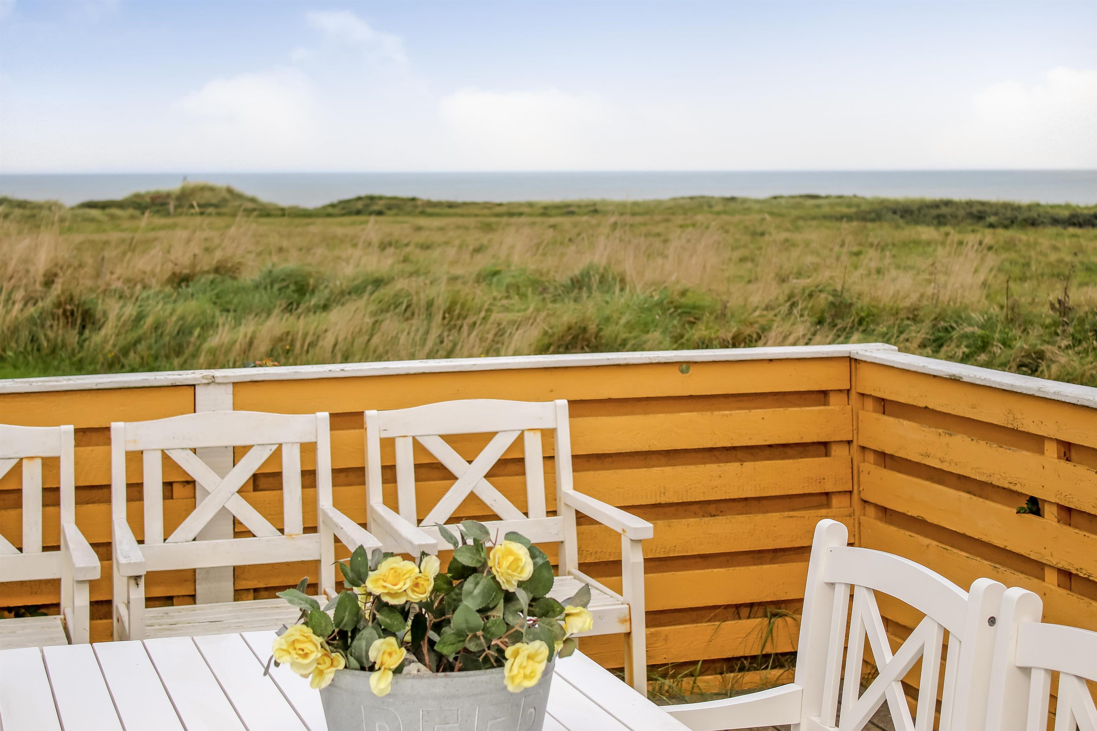 55 m² hölzernes Ferienhaus mit 3 Schlafzimmern (1DB, 1DB, 1E). Kombiniertes Wohnzimmer und Küchenzeile. Wohnzimmer mit Leder und Polstermöbeln, Smart-TV mit dänischen und deutschen Programmen und der Möglichkeit, TV / Radio / Apps vom Esstisch zu streamen. Genießen Sie den Panoramablick auf die Nordsee und entspannen Sie vor dem knisternden Kaminofen. Schöne Küchenecke mit Herd mit Cerankochfeld, eingebautem Backofen, Abzugshaube, Geschirrspüler und Kühlschrank mit kleinem Gefrierfach. Schönes Badezimmer mit Toilette, Dusche und Waschbecken. Vom Wohnzimmer aus haben Sie einen Panoramablick auf die Nordsee. Es gibt Holzböden in allen Wohn- und Schlafzimmern. Nichtraucher-Haus. Haustiere sind nicht erlaubt.