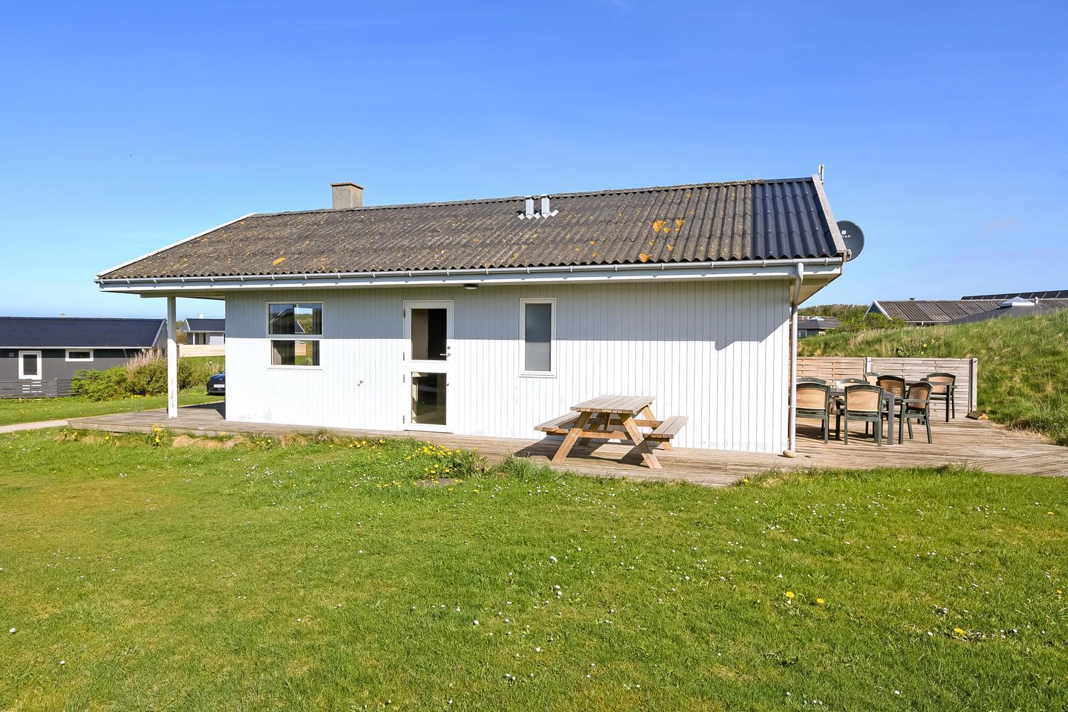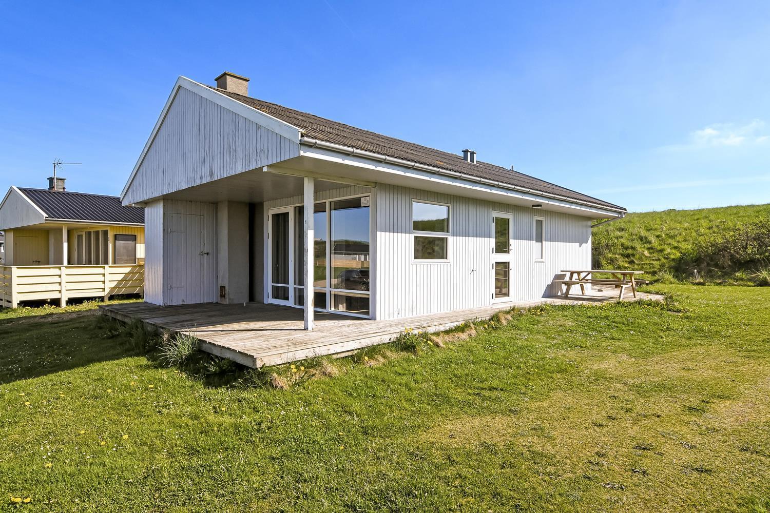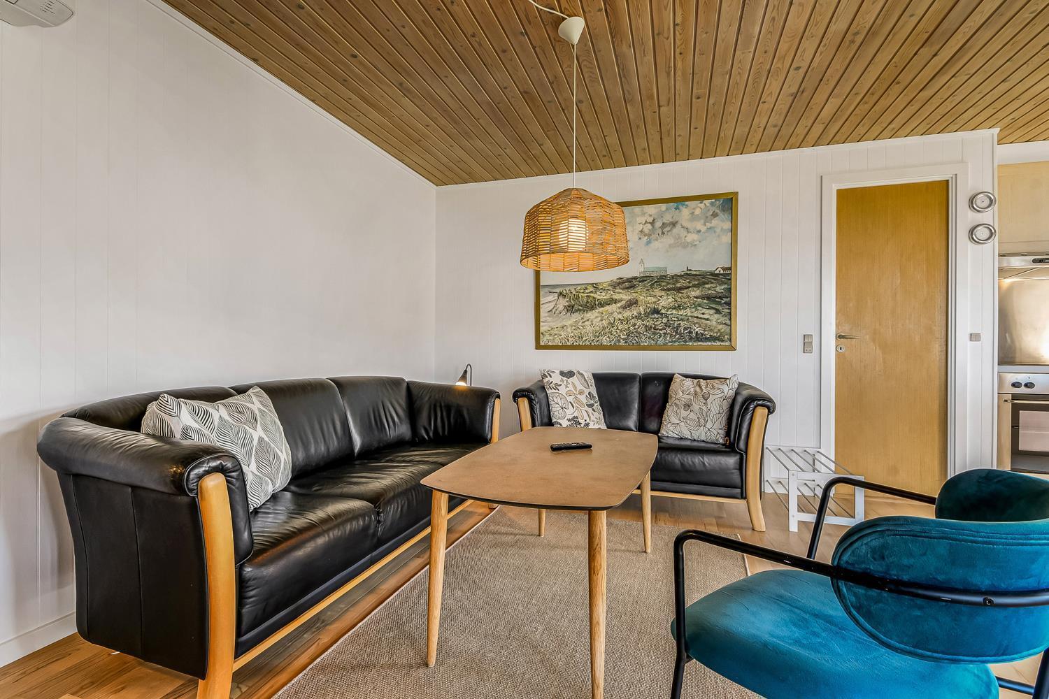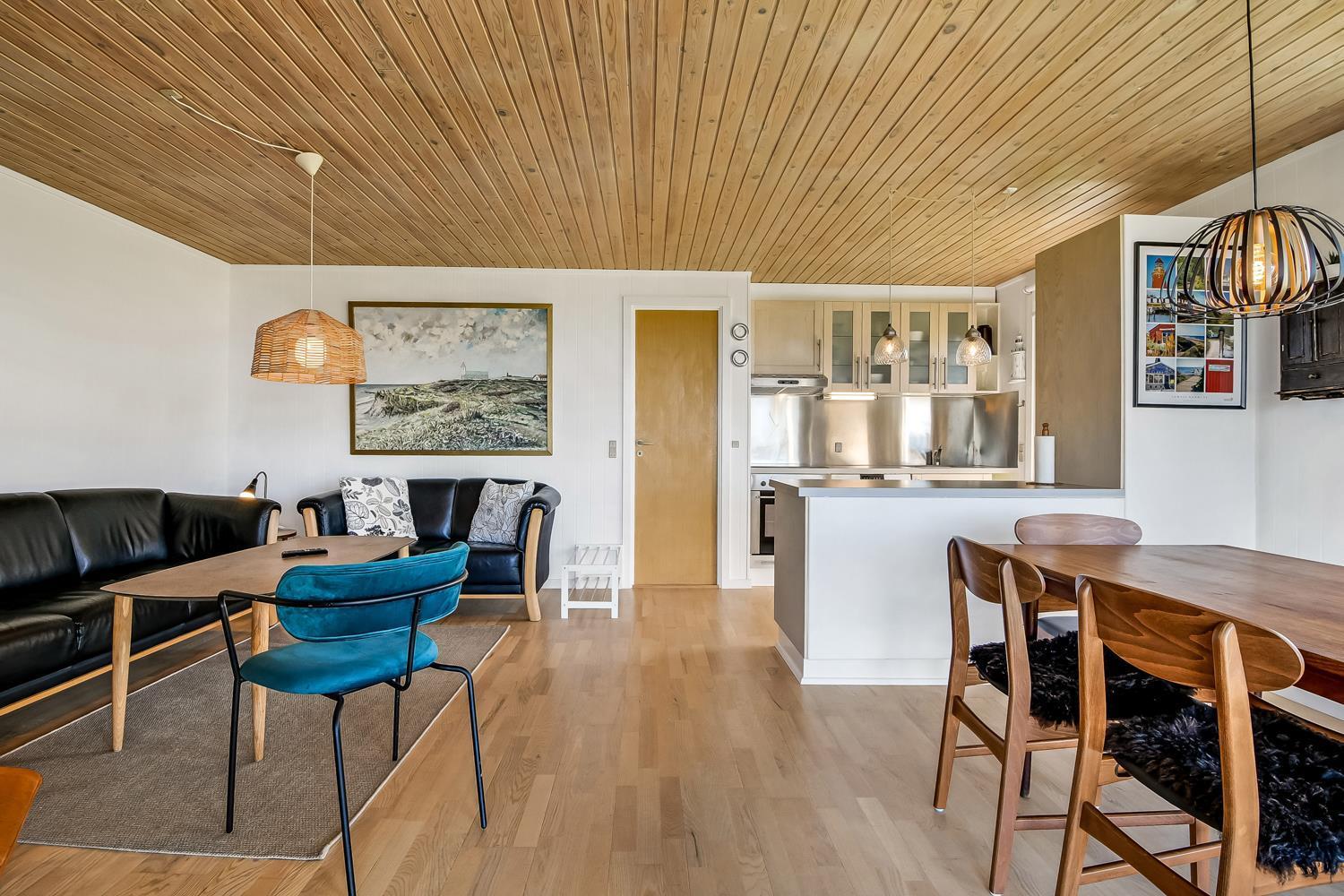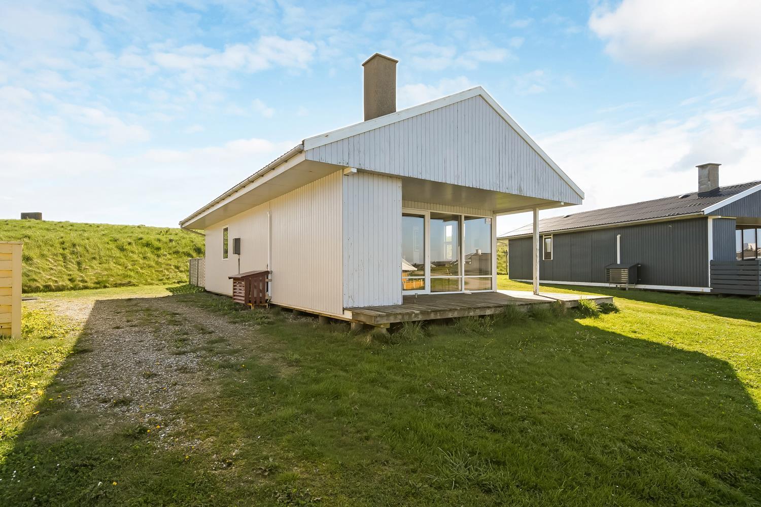 56 qm großes Holzferienhaus mit 2 Schlafräumen: 1DB + 1DB. Kombinierter Wohnraum/Küche. Gerade gegenüber der anderen Seite von der Küche steht der Esstisch. Außerdem gibt es TV mit dänischen und deutschen Programmen und die Möglichkeit für Streaming von TV / Radio / Apps, wofür Sie selber ein Abonnement haben. Wohnraum mit Ledermöbeln und eine Wärmepumpe sorgt immer für eine gute Wärme zum günstigem Preis. Schöne Küchenecke mit Ceranfeld Kochplatten, eingebauten Ofen, Abzugshaube, Mikrowelle, Kühlschrank mit kleinem Gefrierfach, Geschirrspüler und Ausgang zur Terrasse. Schönes Badezimmer mit Toilette, Dusche, Waschbecken und Fliesenboden mit Fußbodenheizung. Vom Wohnraum gibt es Blick zur Nordsee. Hochstuhl. Nichtraucher-Haus. Max. 1 Haustier ist erlaubt.