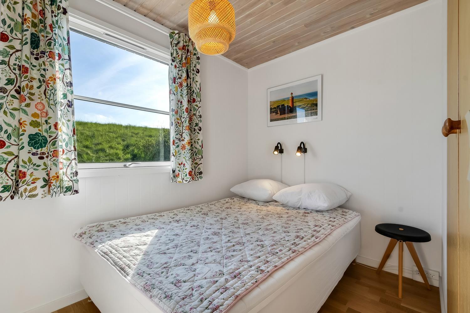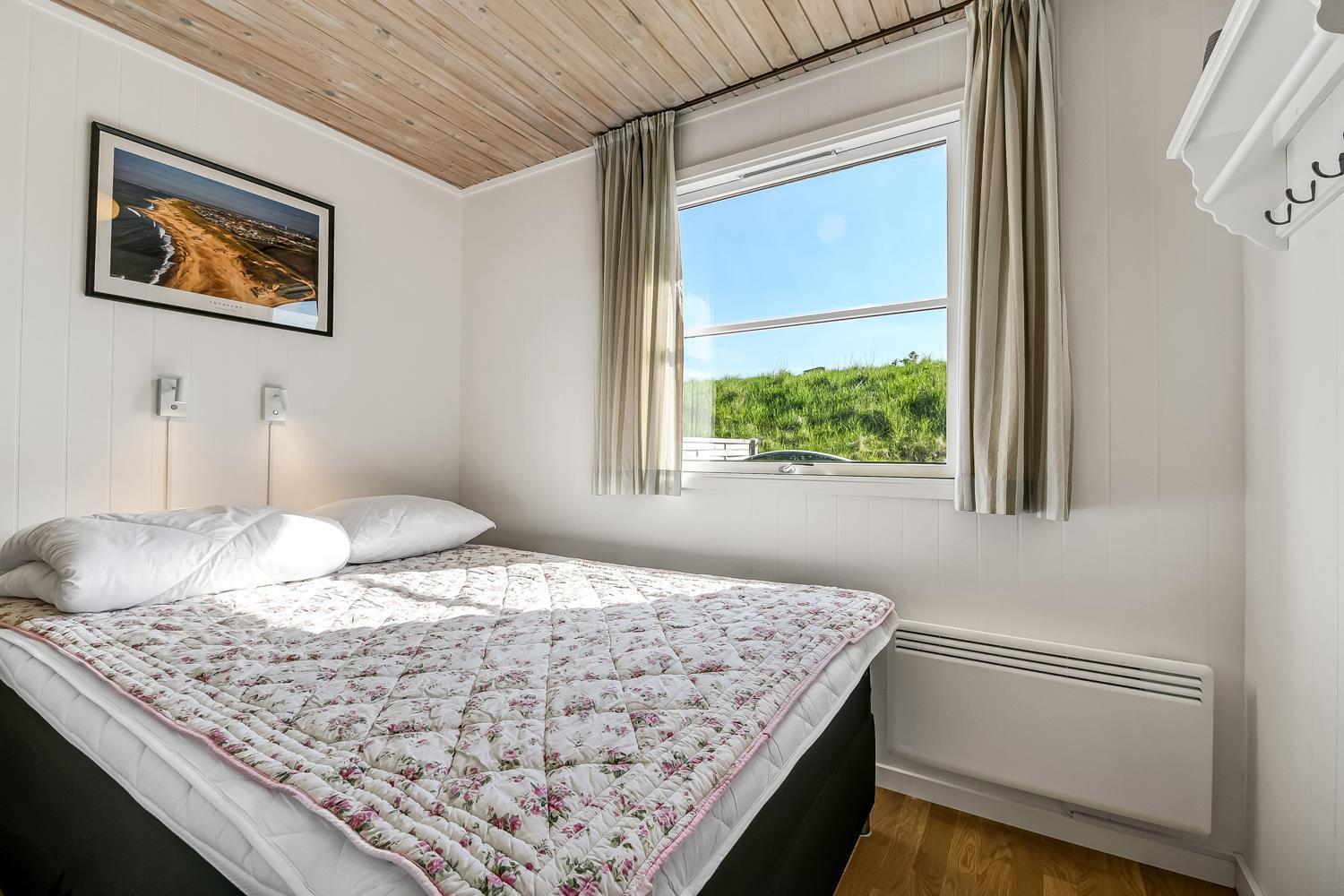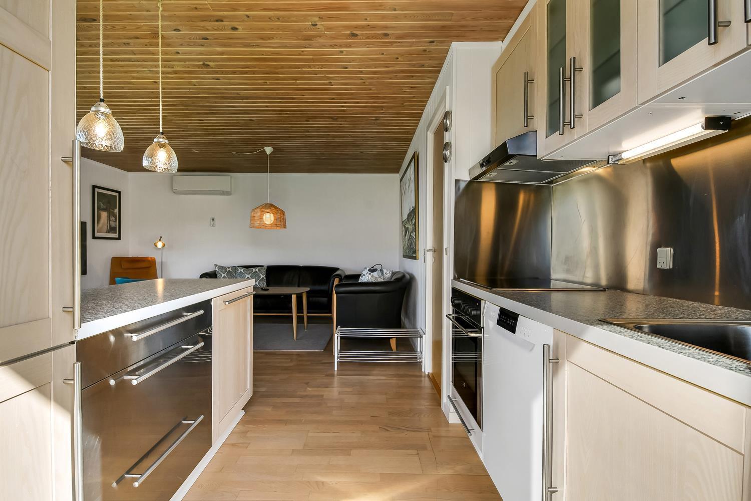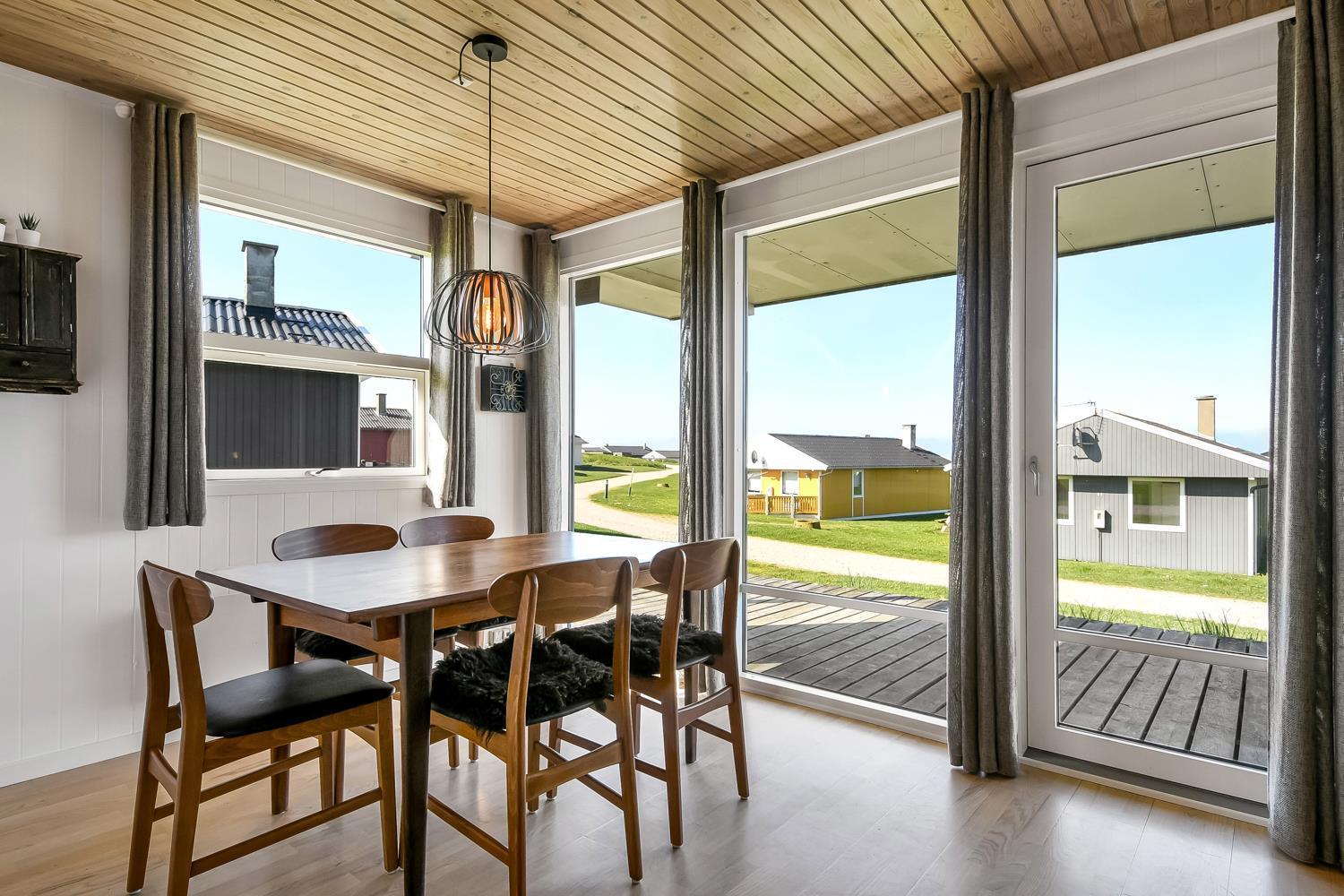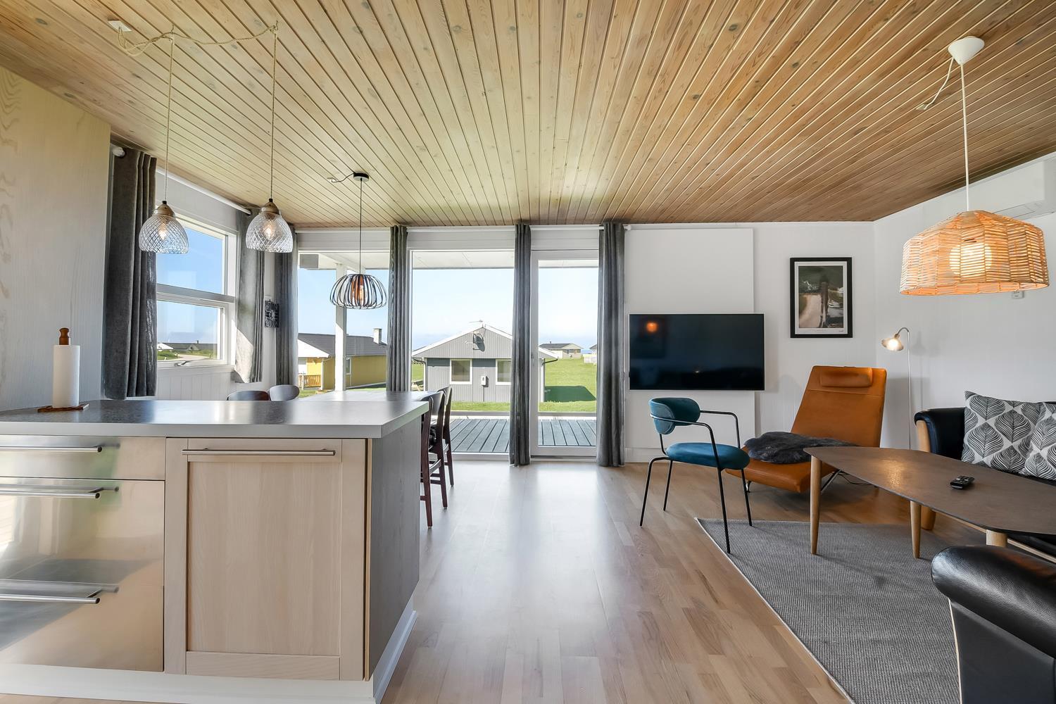 56 qm großes Holzferienhaus mit 2 Schlafräumen: 1DB + 1DB. Kombinierter Wohnraum/Küche. Gerade gegenüber der anderen Seite von der Küche steht der Esstisch. Außerdem gibt es TV mit dänischen und deutschen Programmen und die Möglichkeit für Streaming von TV / Radio / Apps, wofür Sie selber ein Abonnement haben. Wohnraum mit Ledermöbeln und eine Wärmepumpe sorgt immer für eine gute Wärme zum günstigem Preis. Schöne Küchenecke mit Ceranfeld Kochplatten, eingebauten Ofen, Abzugshaube, Mikrowelle, Kühlschrank mit kleinem Gefrierfach, Geschirrspüler und Ausgang zur Terrasse. Schönes Badezimmer mit Toilette, Dusche, Waschbecken und Fliesenboden mit Fußbodenheizung. Vom Wohnraum gibt es Blick zur Nordsee. Hochstuhl. Nichtraucher-Haus. Max. 1 Haustier ist erlaubt.