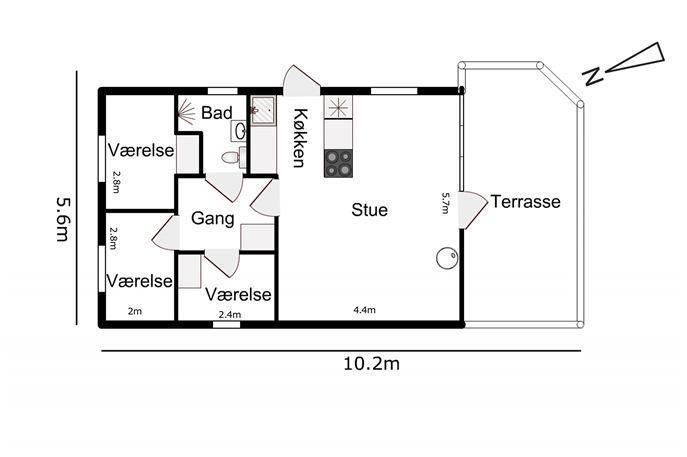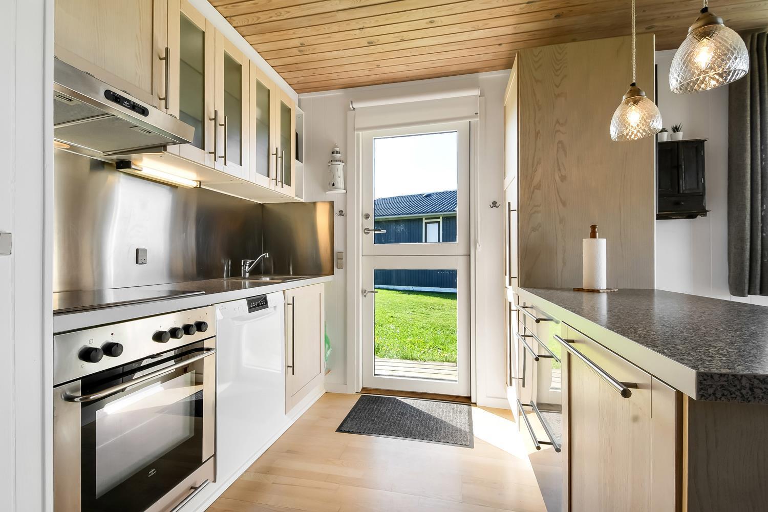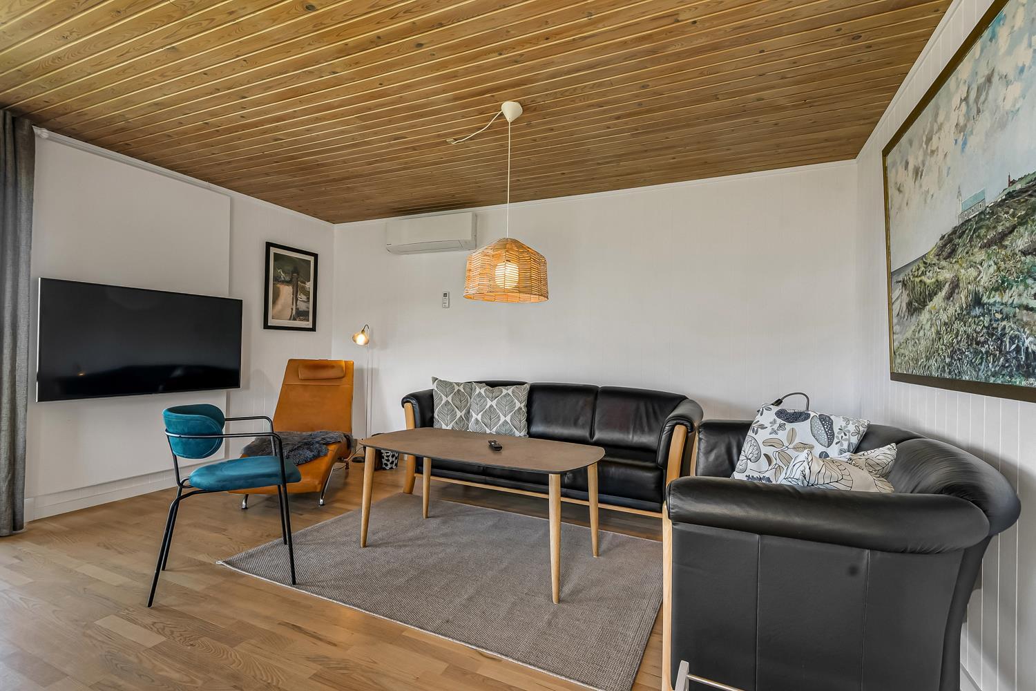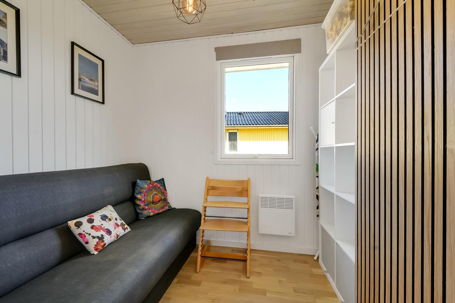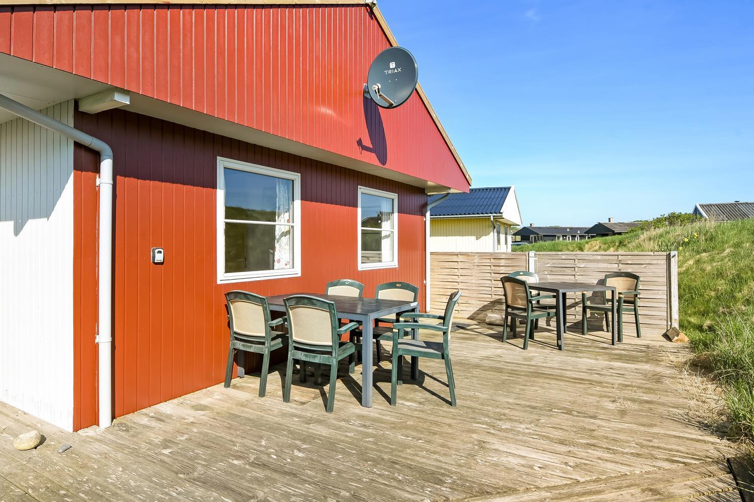 56 qm großes Holzferienhaus mit 2 Schlafräumen: 1DB + 1DB. Kombinierter Wohnraum/Küche. Gerade gegenüber der anderen Seite von der Küche steht der Esstisch. Außerdem gibt es TV mit dänischen und deutschen Programmen und die Möglichkeit für Streaming von TV / Radio / Apps, wofür Sie selber ein Abonnement haben. Wohnraum mit Ledermöbeln und eine Wärmepumpe sorgt immer für eine gute Wärme zum günstigem Preis. Schöne Küchenecke mit Ceranfeld Kochplatten, eingebauten Ofen, Abzugshaube, Mikrowelle, Kühlschrank mit kleinem Gefrierfach, Geschirrspüler und Ausgang zur Terrasse. Schönes Badezimmer mit Toilette, Dusche, Waschbecken und Fliesenboden mit Fußbodenheizung. Vom Wohnraum gibt es Blick zur Nordsee. Hochstuhl. Nichtraucher-Haus. Max. 1 Haustier ist erlaubt.