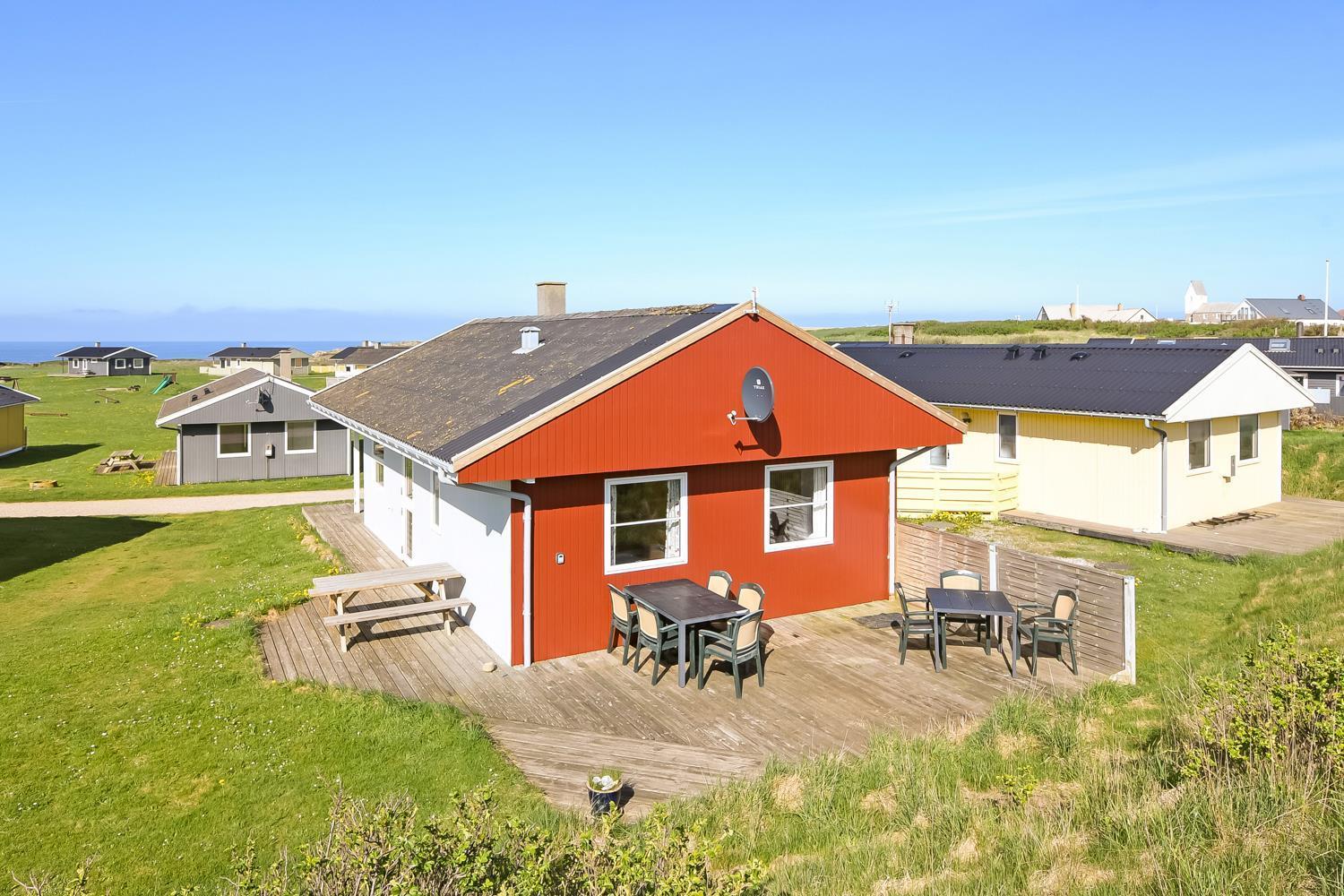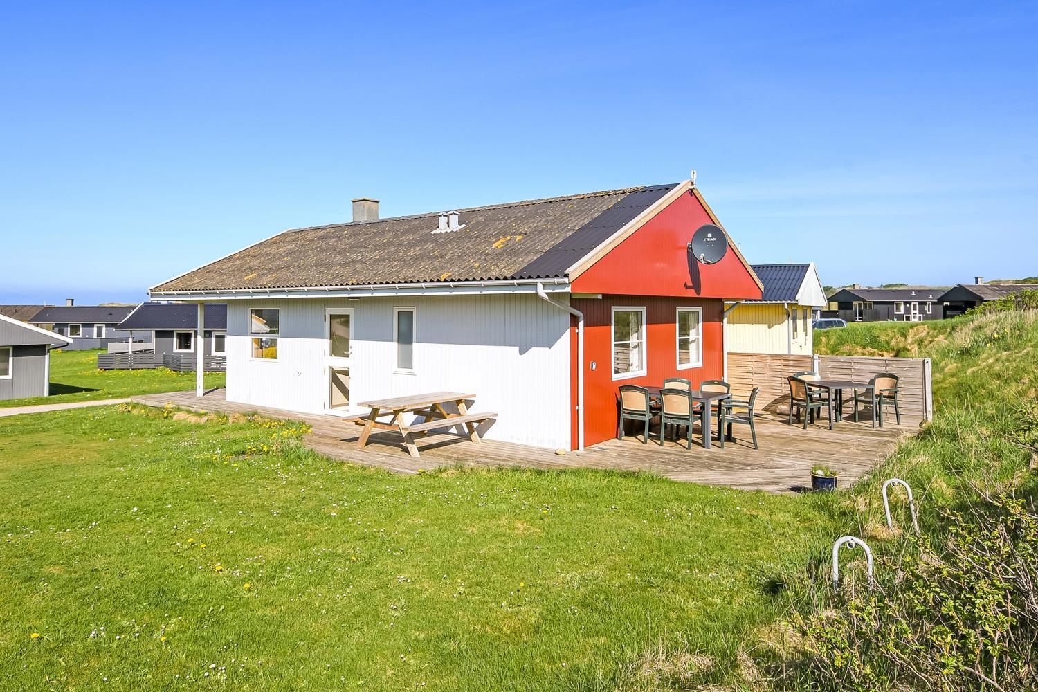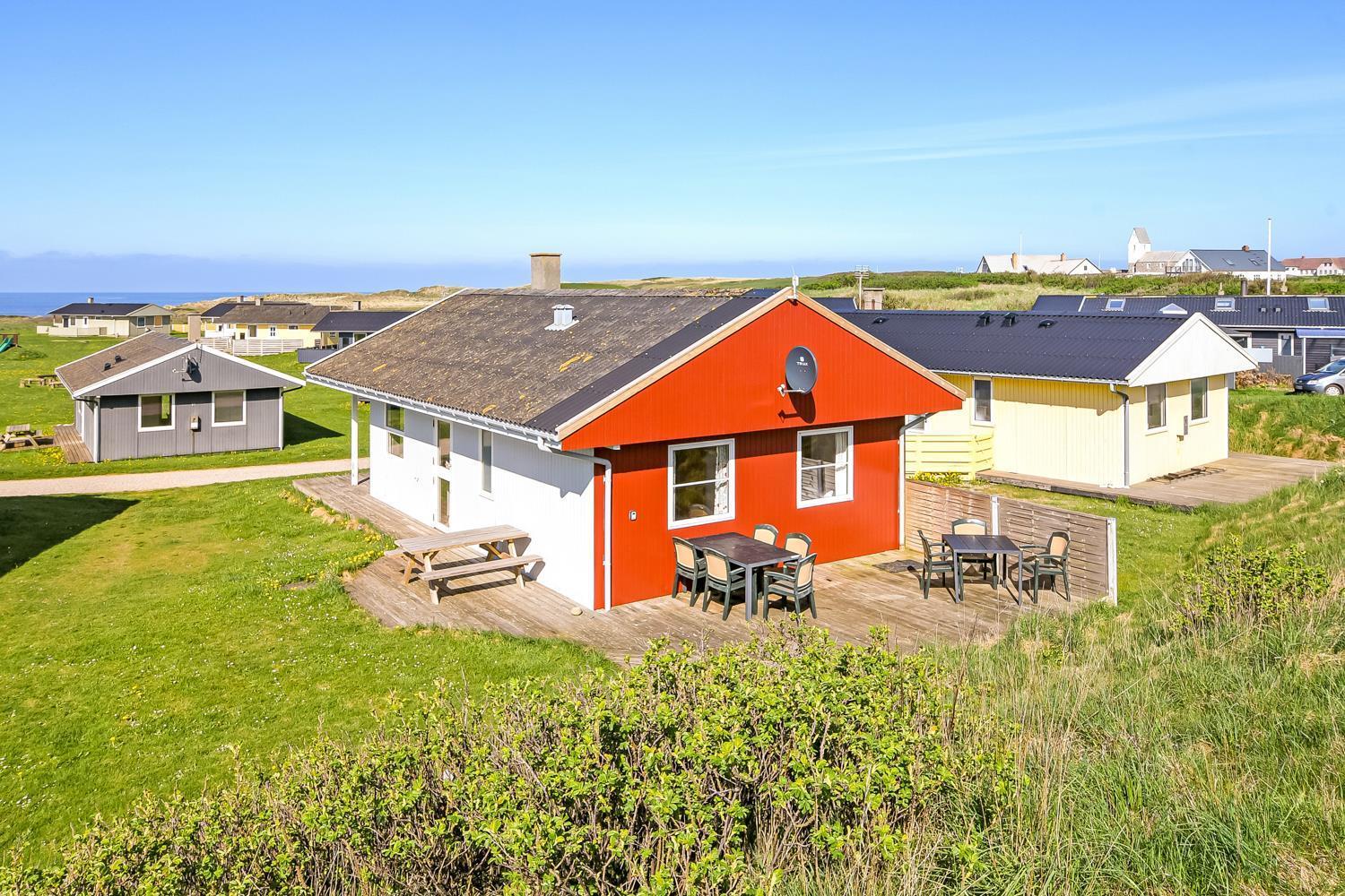 Holzferienhaus mit freiem WLAN und teilweisem Meeresblick. Es liegt in dem gemütlichen und ruhigen Gebiet Trans Ferieby bloß 200 m von der Nordsee entfernt.