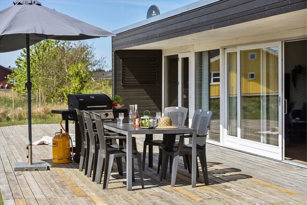 Vom Wohnzimmer und allen Schlafzimmern haben Sie direkten Ausgang zu der grossen Holzterrasse, welche sich um das ganze Ferienhaus und den Anbau herumzieht. Dieses macht es einfach die Außen Areale zu benutzen, ungeachtet, ob Sie das Frühstück in der Sonne genießen wollen, sich ein Mittagsschläfchen im Schatten gönnen möchten, oder sich es beim Grillen und Gartenspielen am Abend gemütlich machen möchten. Die Kinder können auf dem 1998 m2 grossen Grundstück spielen, aber es gibt noch mehr Platz für Entfaltungsmöglichkeiten auf dem riesigen Gemeinschaftsareal, welches sich auf der anderen Seite des Weges ausbreitet.