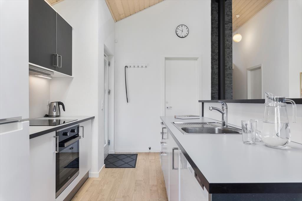 Wenn Sie dieses Ferienhaus betreten, werden Sie von einer hellen und einladenden Atmosphäre empfangen, in der modernes Design und hochwertige Möbel perfekt harmonieren. Das Wohnzimmer ist der natürliche Treffpunkt, wo bequeme Möbel und ein gemütlicher Kamin den idealen Rahmen für entspannte Abende schaffen. Über der Küche befinden sich große Dachfenster, die viel Tageslicht hereinlassen und dem Raum eine angenehme Atmosphäre verleihen, während Sie die Mahlzeiten zubereiten. Es gibt ausreichend Platz am Esstisch, wo sich Familie und Freunde zu gemütlichen Stunden versammeln können. Das Ferienhaus verfügt zudem über ein Badezimmer und ein praktisches Gäste-WC. Im Badezimmer können Sie sich mit einem entspannenden Bad im luxuriösen Whirlpool für zwei Personen verwöhnen oder nach einem erlebnisreichen Tag in der Sauna relaxen.