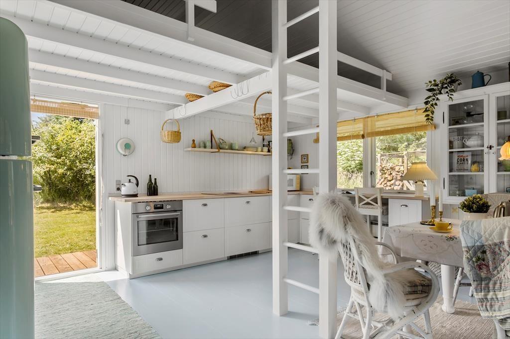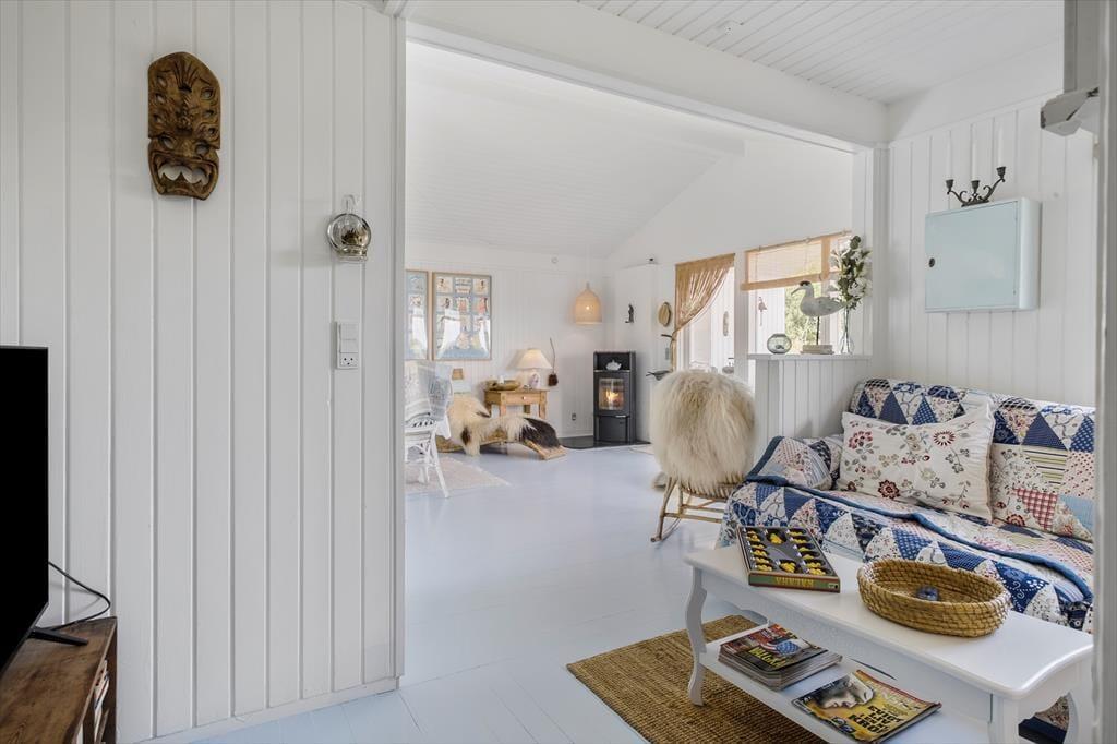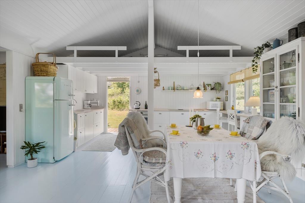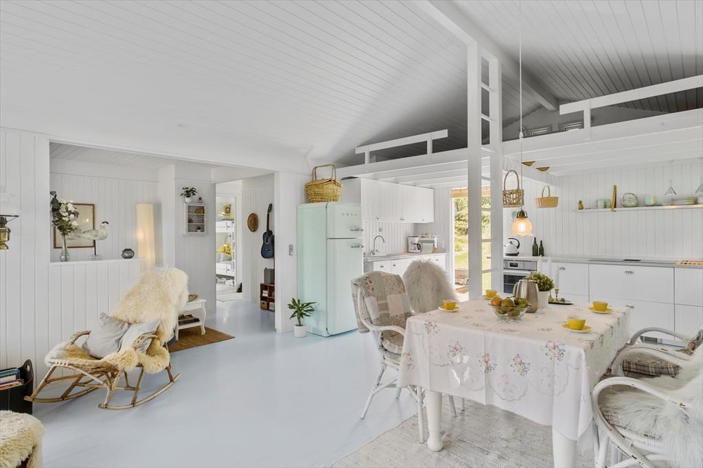 Dieses 66 m² große Ferienhaus strahlt pure dänische Sommerhaus-Idylle aus. Die Einrichtung ist ein stimmungsvolles Zusammenspiel aus neuen und alten Möbeln, liebevoll ausgewählten Dekorationen und weichen Textilien – das schafft eine warme und persönliche Atmosphäre. Die charmante Landhausküche passt perfekt zum Stil des Hauses – hier gibt es keinen Geschirrspüler, und genau dieses kleine Ritual des gemeinsamen Spülens schenkt euch Zeit für Gespräche, Lachen und Ruhe. Gleichzeitig bietet die Küche viel Arbeitsfläche und ist bestens ausgestattet für alle Ferienmahlzeiten. Direkt anschließend befindet sich ein kleines, gemütliches Fernsehzimmer, ideal für entspannte Abende mit einem Buch oder Film. Es gibt zwei Schlafzimmer – eines mit Doppelbett und eines mit Etagenbett. Ein kleines, aber ganz besonders stimmungsvolles Ferienhaus, in dem Natur, Nähe und Privatsphäre für unvergessliche Urlaubstage sorgen.