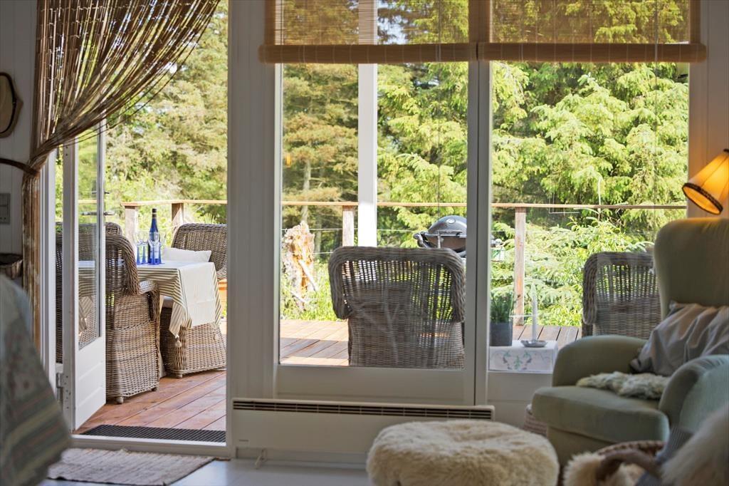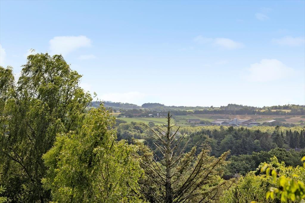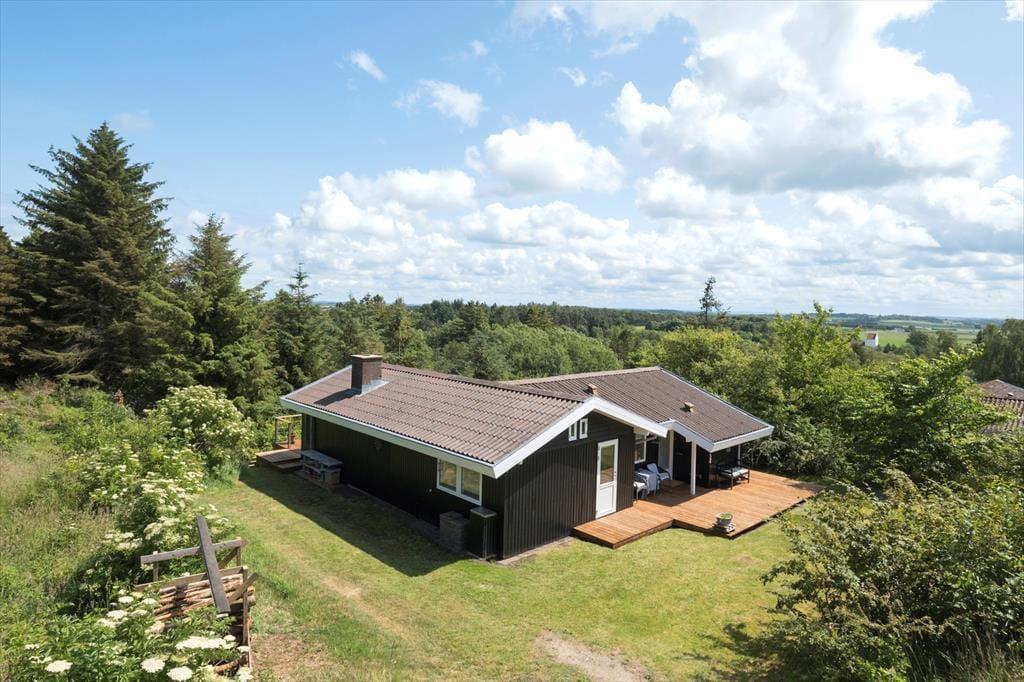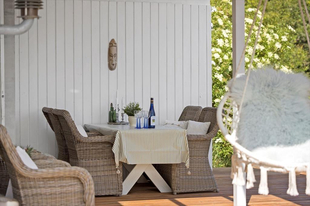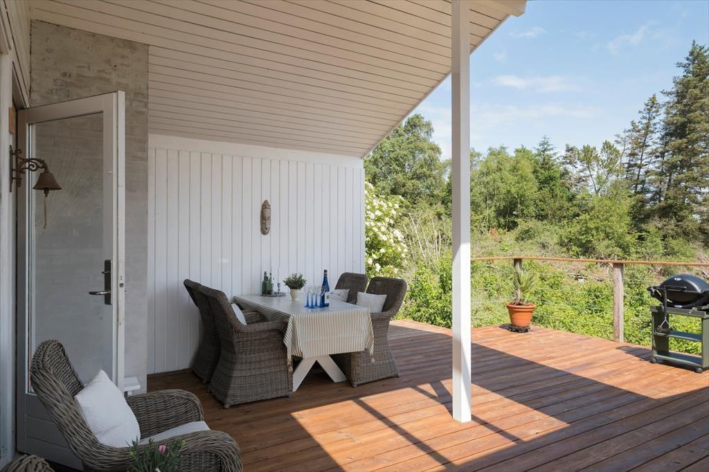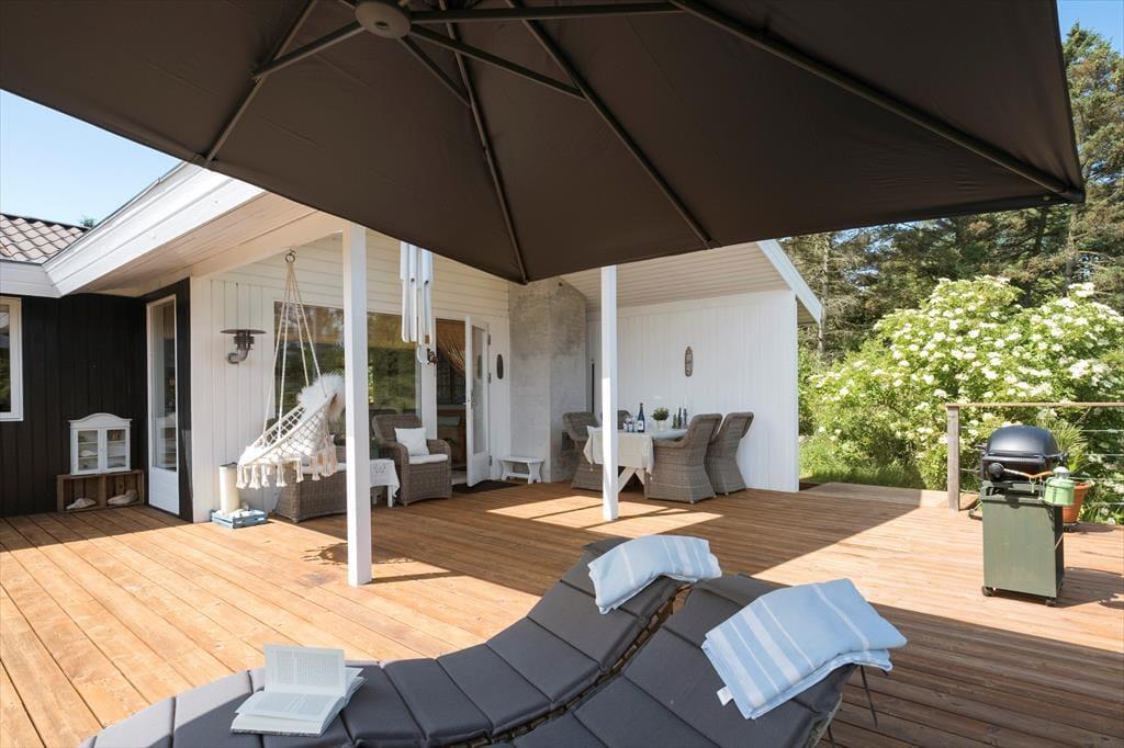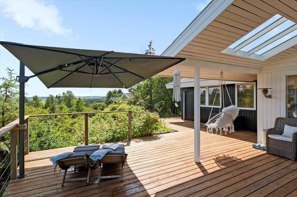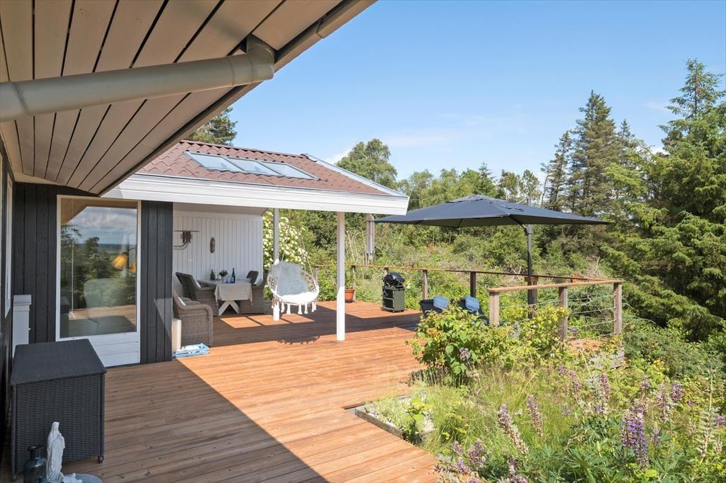 Die Außenbereiche sind das unbestrittene Herzstück des Hauses. Die große Holzterrasse umgibt mehrere Seiten des Hauses und bietet sowohl sonnige als auch überdachte Bereiche – ideal, um den Tag ganz nach deinen Wünschen zu verbringen. Die Terrasse ist mit bequemen Loungemöbeln, Esstisch, Sonnenschirm und Grill ausgestattet – und das alles in absolut ungestörter Lage, umgeben von Heide und hohen Bäumen, wo nur der Vogelgesang die Ruhe unterbricht. Von hier aus hast du eine wunderschöne Aussicht auf das hügelige, naturbelassene Gelände – der perfekte Ort für den Morgenkaffee oder den Ausklang eines Sommertages.