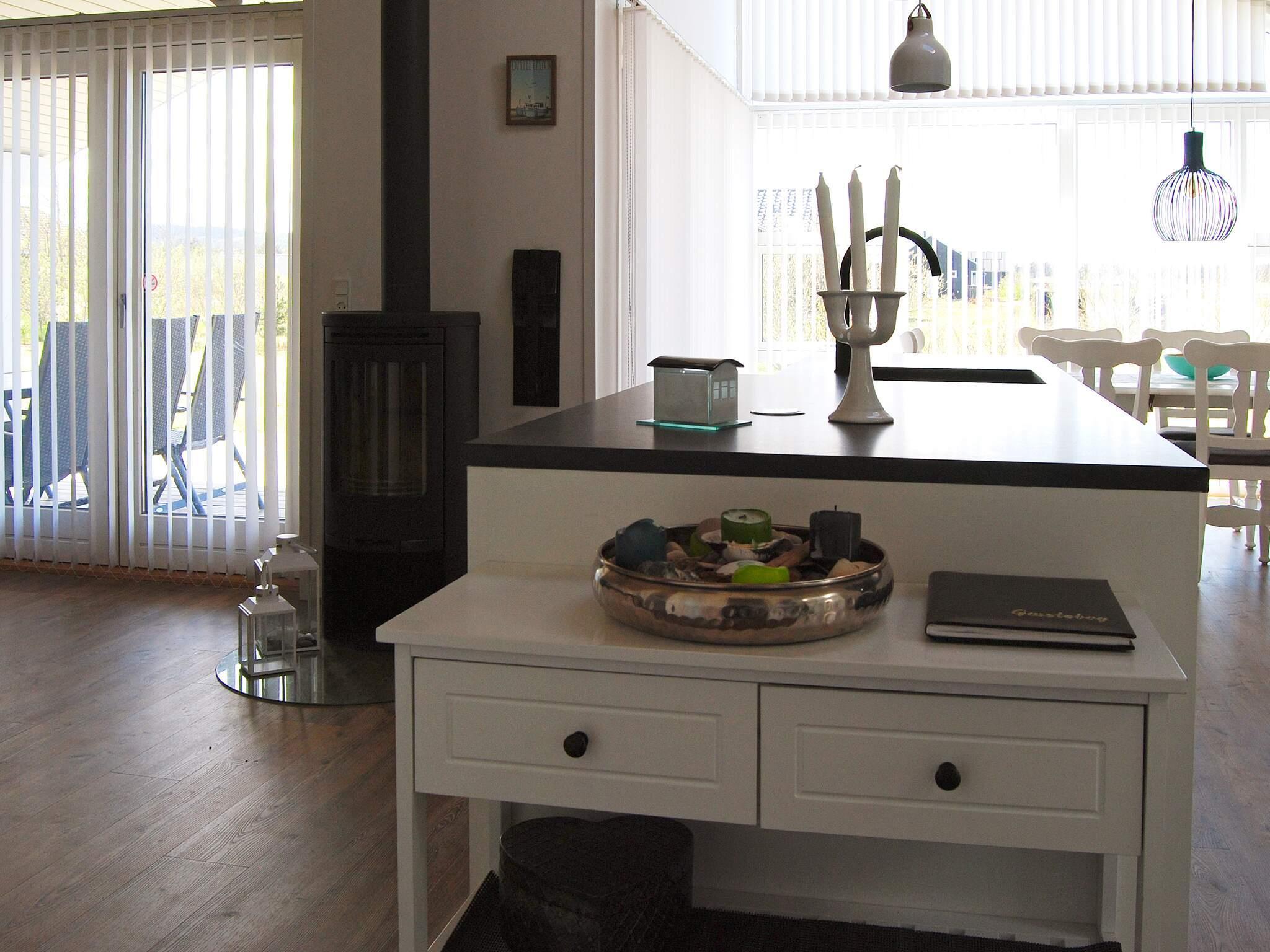 Gut ausgestattetes Ferienhaus in hellen und freundlichen Farben auf ein schönes Naturgrundstück. Das Ferienhaus ist wohnlich eingerichtet und hat einen offenen Küchen-/Wohnbereich für das Familienleben. Darin steht auch ein schön zentral platzierter und bei Bedarf wohlige Wärme verbreitender Kaminofen bereit.