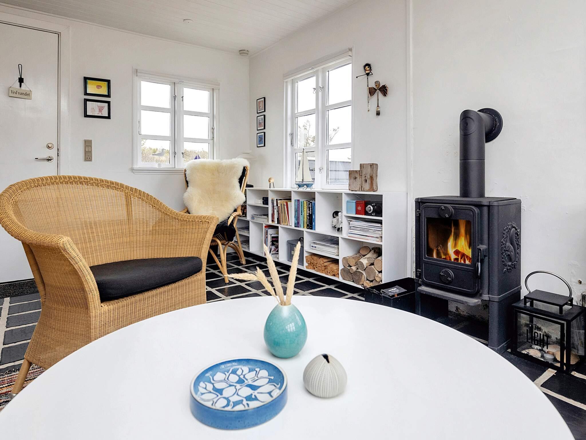 Das Ferienhäuschen bietet innen eine gemütliche Wohnatmosphäre. Es hat eine offen integrierte Küche in den Ess- und Wohnbereich. Im Raum gibt es einen gemütlichen Holzofen für kühlere Tage. Ein Schlafzimmer mit Doppelbett im Haus. Das zweite Schlafzimmer befindet sich in einem separaten Anbau, darin ein Doppelbett und ein Einzelbett. Badezimmer mit Dusche im Haupthaus.