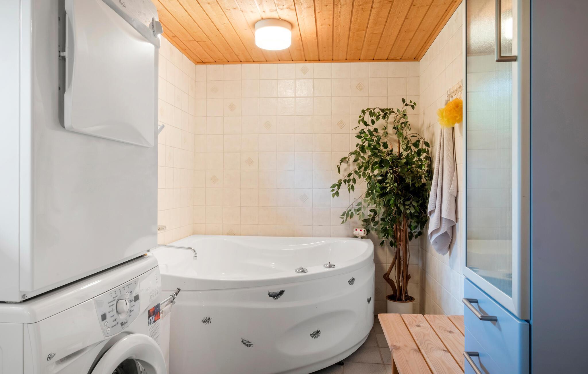 Ihr gemütliches Ferienhaus bietet alles, was Sie für einen erholsamen Aufenthalt benötigen. Beginnen Sie den Tag mit einem ausgiebigen Frühstück auf der überdachten Terrasse, während Sie den Blick in den weiten Garten genießen. Der gemütliche Wohnbereich mit seinen warmen Holzelementen schafft eine angenehme Atmosphäre, die eine sorglose Stimmung vermittelt. Machen Sie es sich auf den bequemen Sofas und Sesseln gemütlich und genießen Sie das Knistern des Kaminofens an kühlen Abenden. Entspannen Sie in Whirlpool und Sauna und kühlen Sie sich in der Eiswanne ab.
