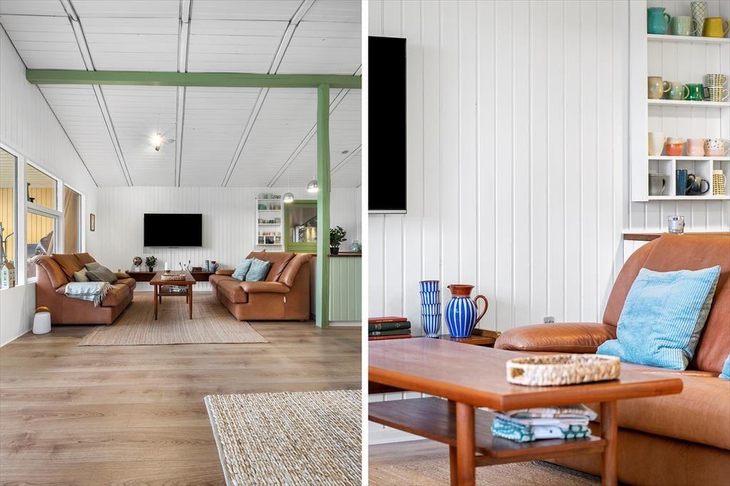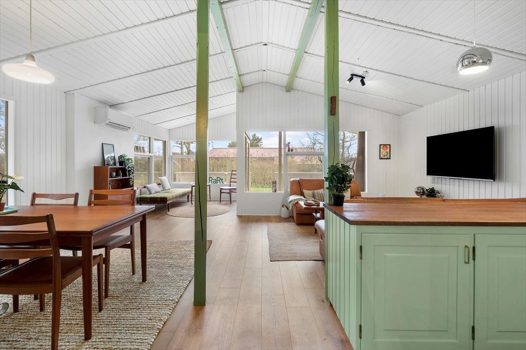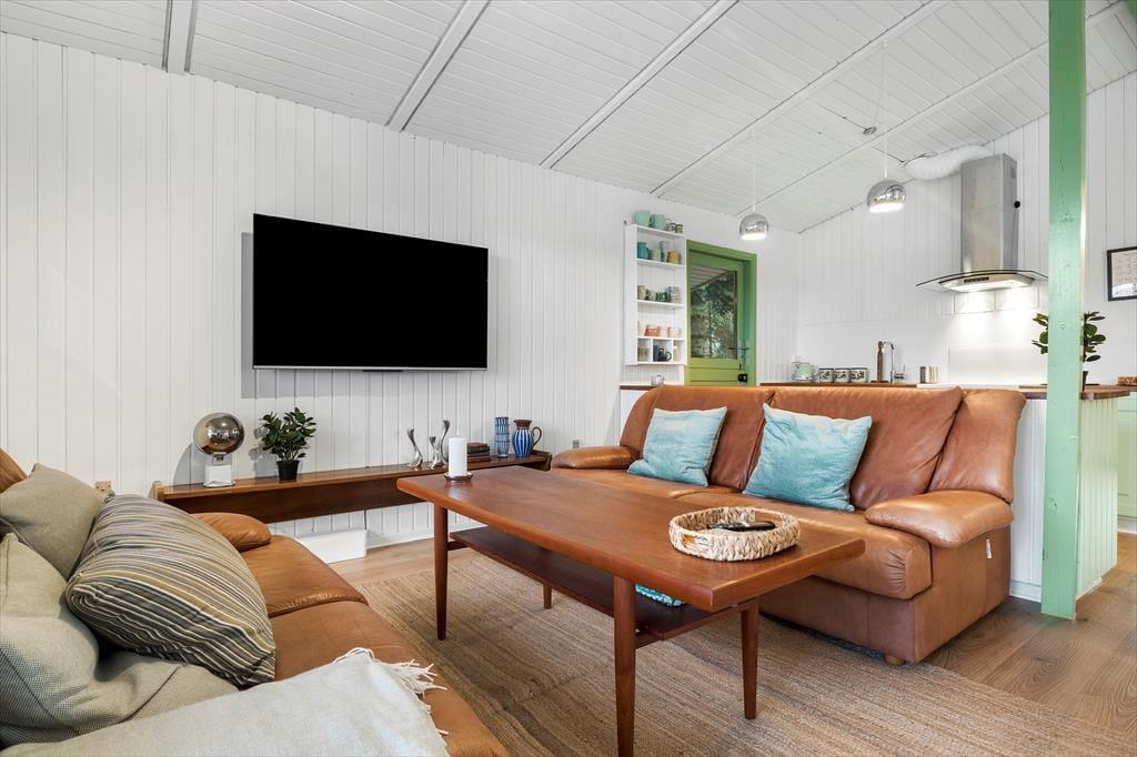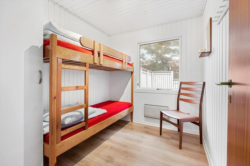Das Ferienhaus wurde im Jahr 2023 einer Renovierung unterzogen. Zu den modernen Annehmlichkeiten zählen seither eine effektive Wärmepumpe, ein Flachbild-TV mit Chromecast und eine Rainshower-Dusche im Badezimmer. Die Möblierung im gefragten Retrostil verleiht den hellen, einladenden Räumlichkeiten Seele und Charme. Im Wohnraum lädt eine Liege zum Lesen und zu kleinen Pausen ein. Sie können am Esstisch beisammensitzen und spielen und es sich auf dem Sofa nach Herzenslust gemütlich machen. In der offenen Küche wird die Zubereitung der Mahlzeiten zum Vergnügen. Die Schlafplätze verteilen sich auf drei Schlafräume, von denen einer mit einem Doppelbett ausgestattet ist. Im zweiten Raum steht ein Etagenbett bereit und im dritten ein Schlafsofa. Insgesamt bietet das Ferienhaus Platz für fünf Erwachsene und ein Kind.