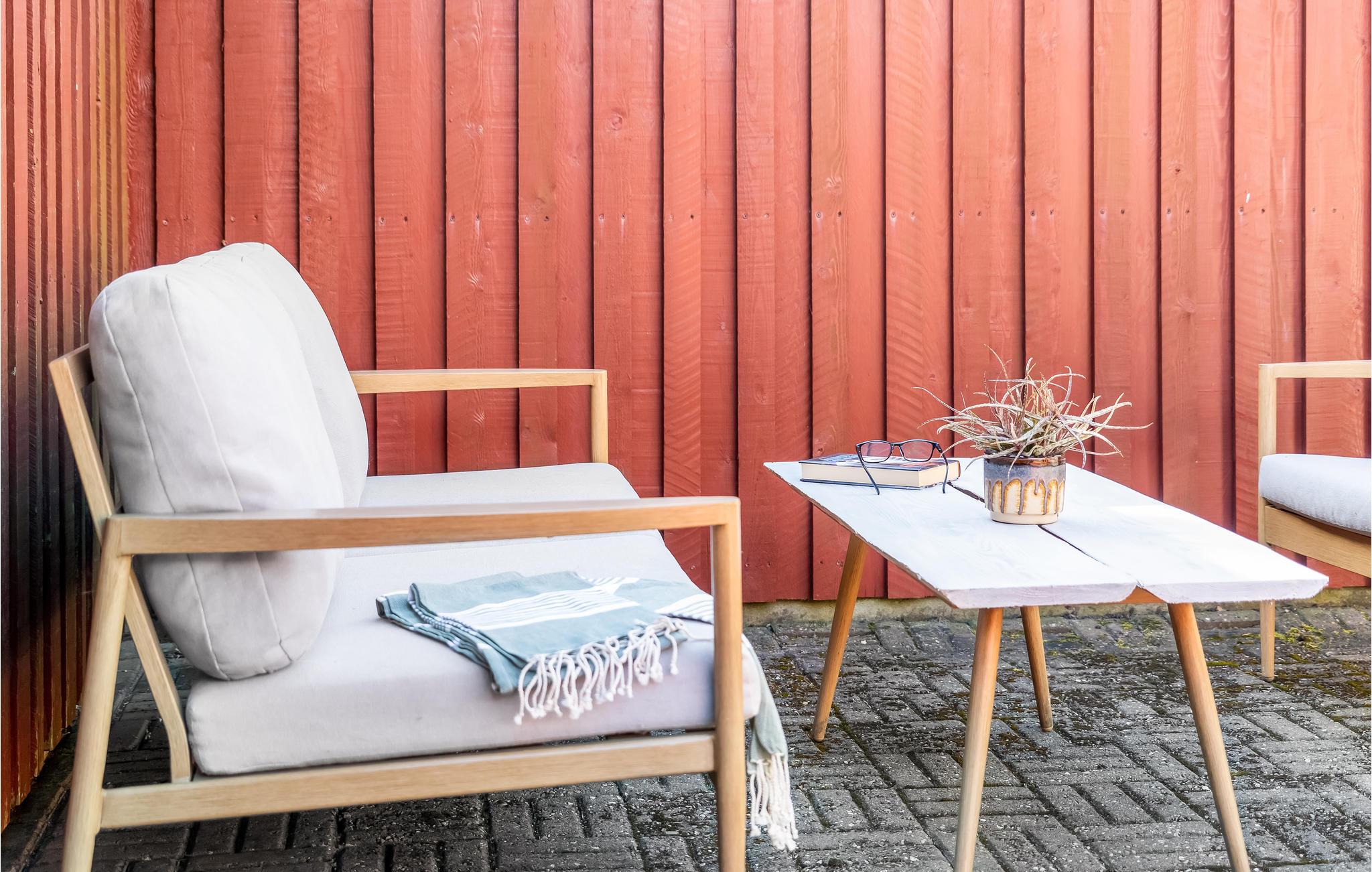 Die Terrasse des Hauses ist windgeschützt und somit der ideale Ort, um den Tag mit einer Tasse Kaffee zu beginnen oder bei einem Glas Wein ausklingen zu lassen. Der großzügige Garten bietet Platz zum Spielen für Kinder und Haustiere.