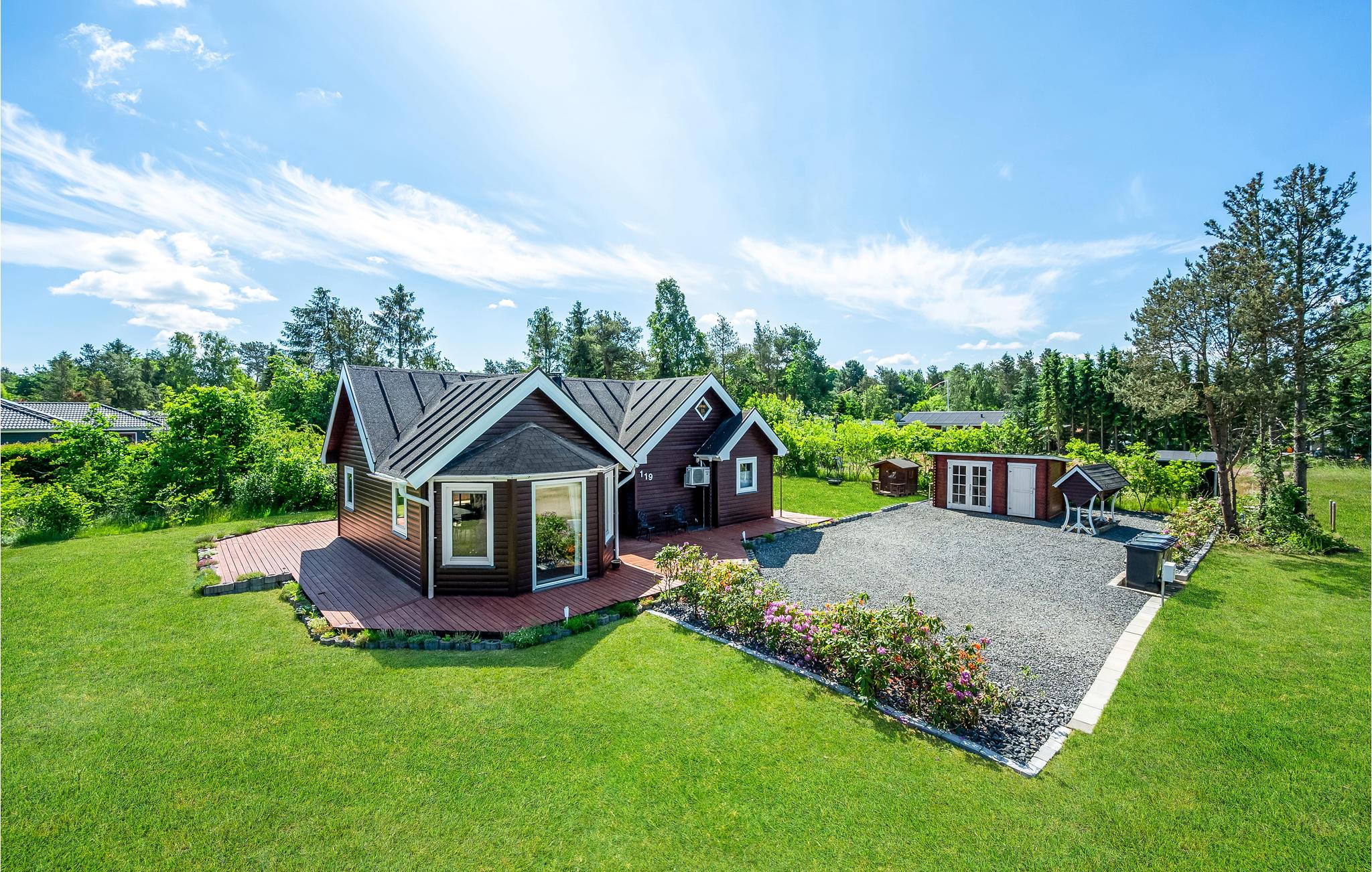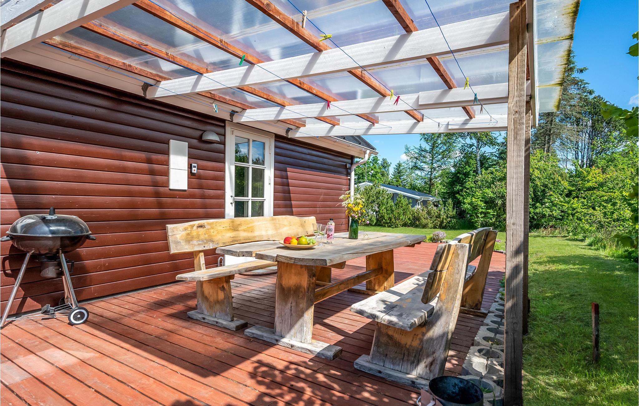 Charmantes Ferienhaus in Dänemark mit stilvollem Holzdesign, Terrasse und Spielplatz, ideal für Natur- und Aktivurlaub.