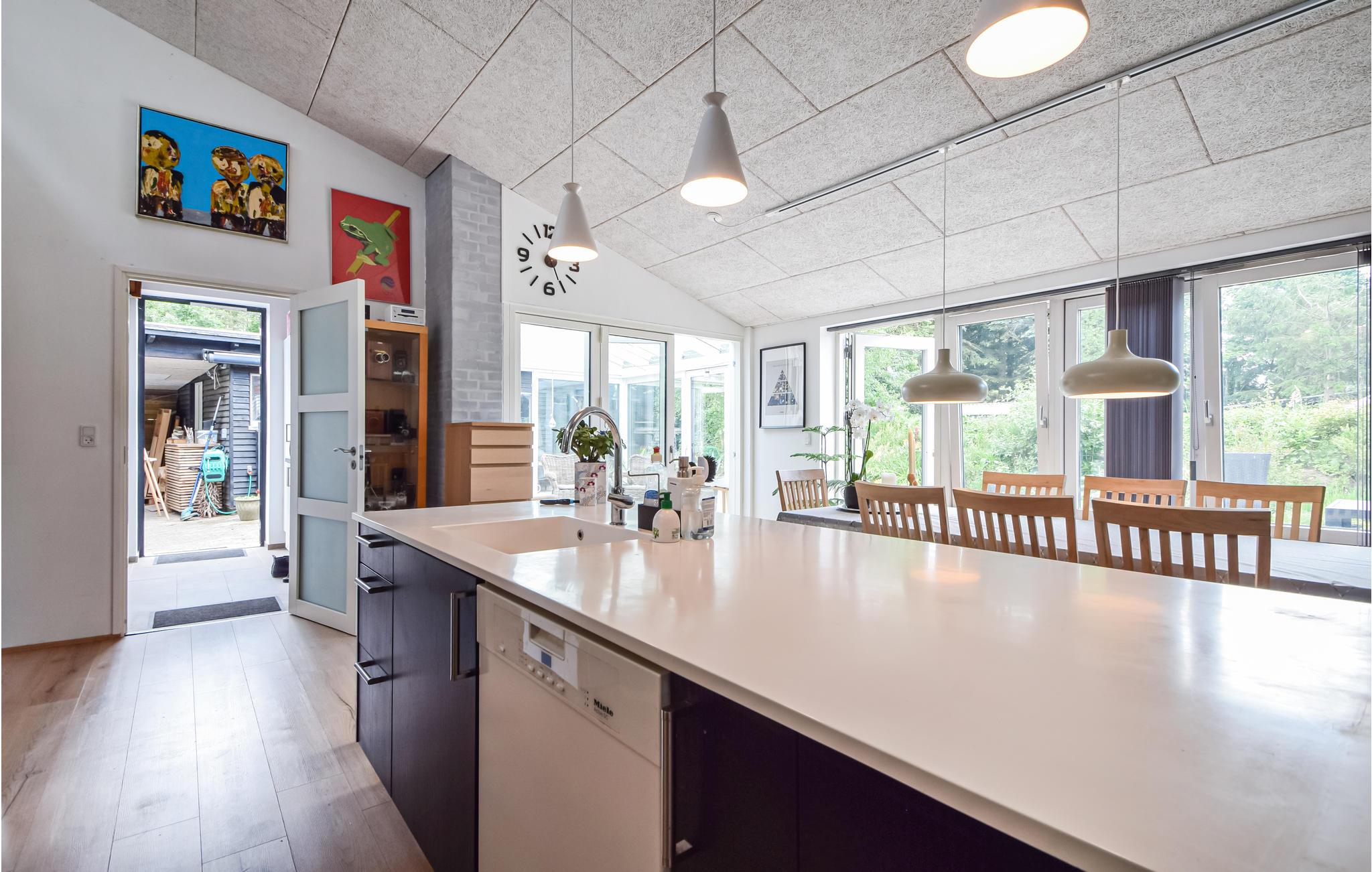 Das Haus hat einen schönen Wintergarten mit viel Licht, eine große Küche-Esszimmer mit voll ausgestatteter Küche und schönem, großen Essbereich. Es gibt raumhohe Fenster, sodass Sie einen guten Blick auf die große Terrasse haben. In offener Verbindung mit der Küche finden Sie ein geräumiges Wohnzimmer mit Sitzbereich.