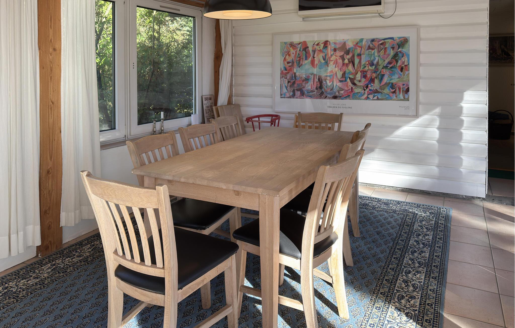 Ihr Ferienhaus überzeugt mit warmen Farben, liebevollen Details und einer wohnlichen Atmosphäre. Im Inneren erwartet Sie ein großzügiger Wohnbereich mit großen Fenstern, die viel Licht hereinlassen und den Blick ins Grüne öffnen. Machen Sie es sich auf der bequemen Sofalandschaft gemütlich, lesen Sie ein Buch oder spielen Sie gemeinsam eine Runde Tischtennis. Kochen Sie in der offenen Küche im Retro-Design mit modernen Geräten. Genießen Sie Ihre Mahlzeiten am langen Esstisch, der Platz für die ganze Familie bietet, oder lassen Sie den Tag am Kaminofen in behaglicher Wärme ausklingen. Entspannen Sie anschließend in der Sauna oder nehmen Sie ein wohltuendes Bad im Whirlpool.