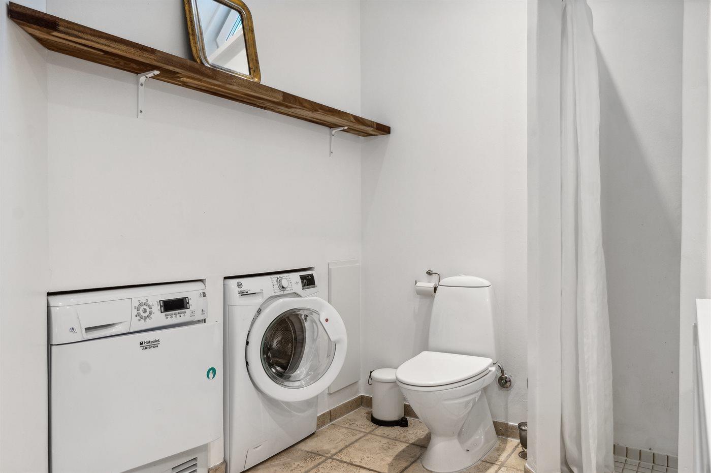 Das Badezimmer ist mit einer Duschkabine und Fußbodenheizung ausgestattet, außerdem gibt es eine Waschmaschine und einen Wäschetrockner.
