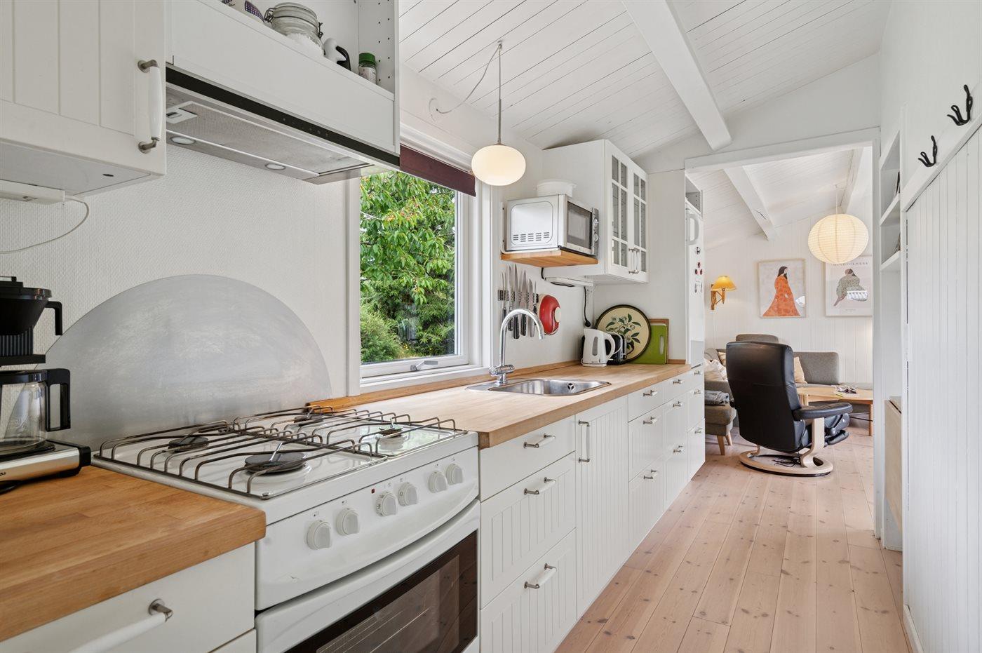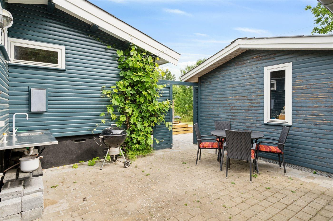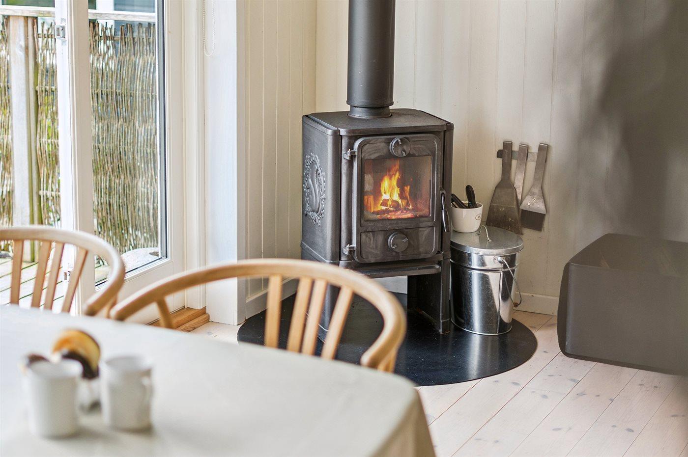 Der gemütliche Wohn- und Essbereich ist offen mit der Küche verbunden und bildet den Mittelpunkt des Hauses. Hier gibt es einen Kaminofen und Zugang zu einer großen, schönen Terrasse. Zudem steht dir eine Außenküche zur Verfügung, in der du unter freiem Himmel kochen kannst.